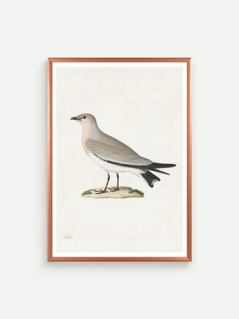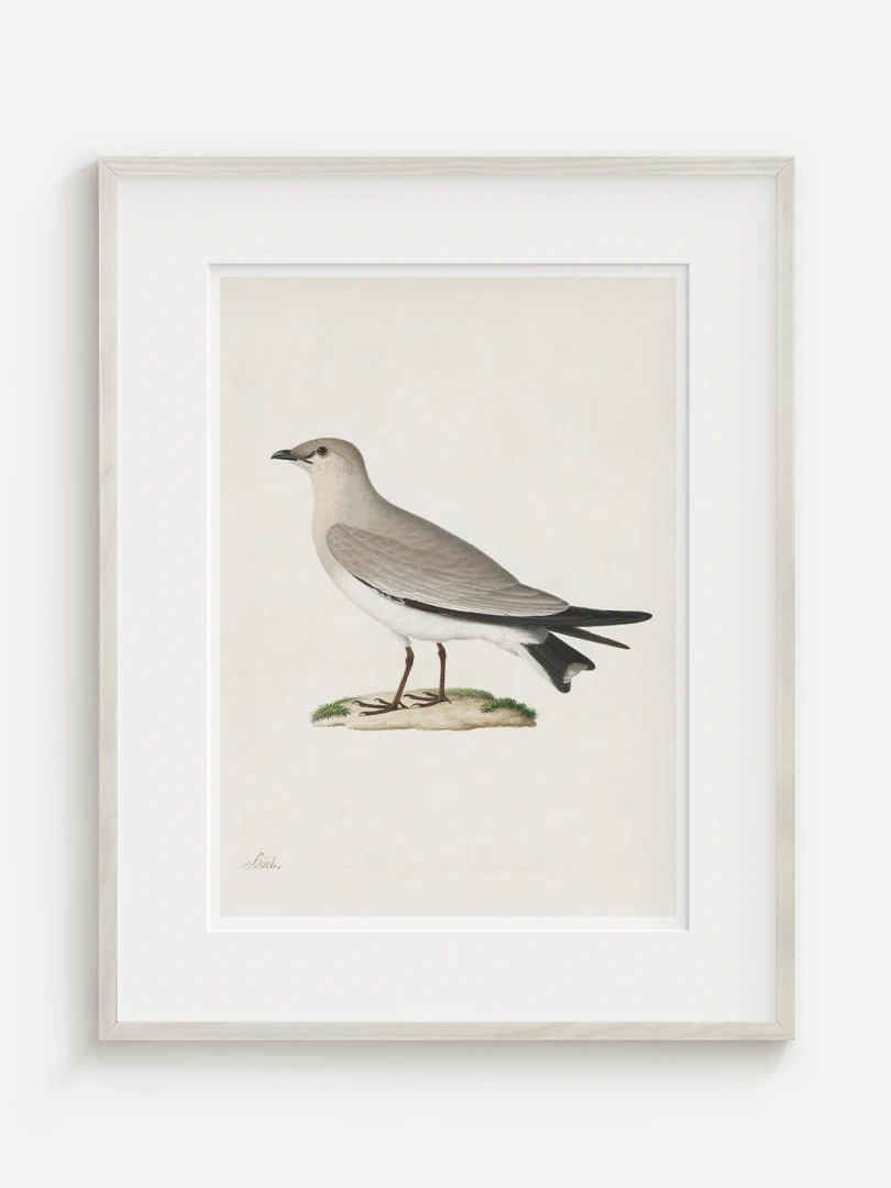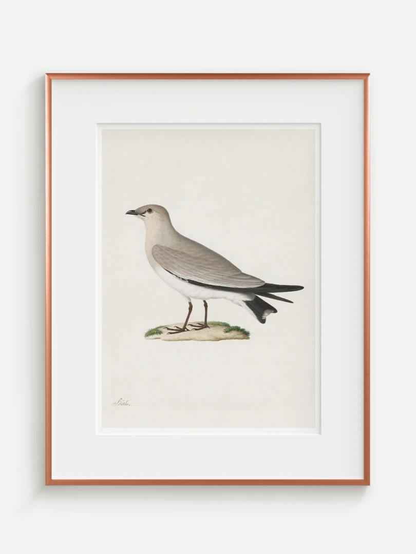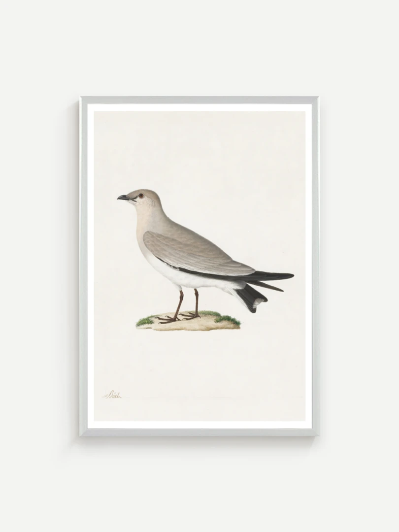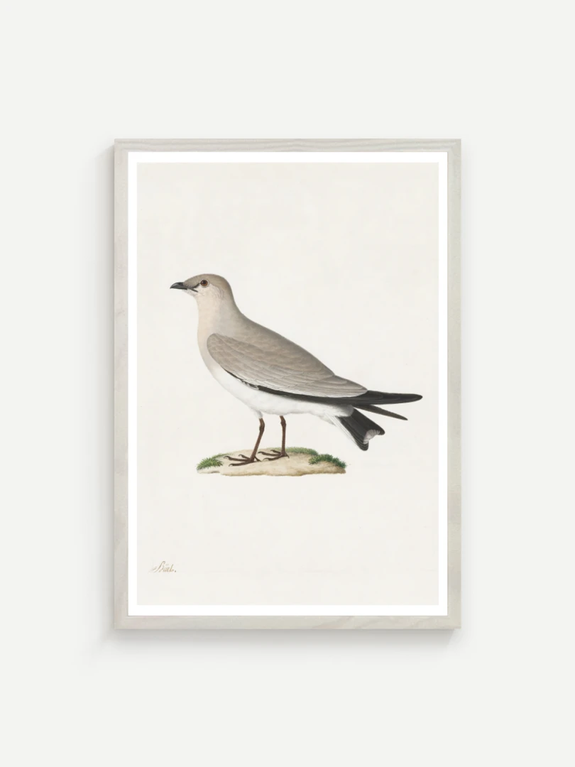 Tento print zobrazuje Malého prieložníka (Small Pratincole, Glareola lactea), drobného vtáka typického pre piesočnaté brehy južnej Ázie. Dielo pochádza z 19. storočia a je pripisované francúzskemu maliarovi Paulovi Hüetovi. Vták je zobrazený s precíznou anatomickou presnosťou, stojaci na jednoduchej zemi s trsom trávy – scéna je čistá, bez rušivého pozadia, vďaka čomu vyniká samotná forma vtáčika.
