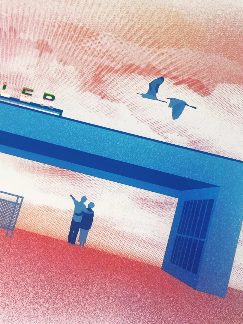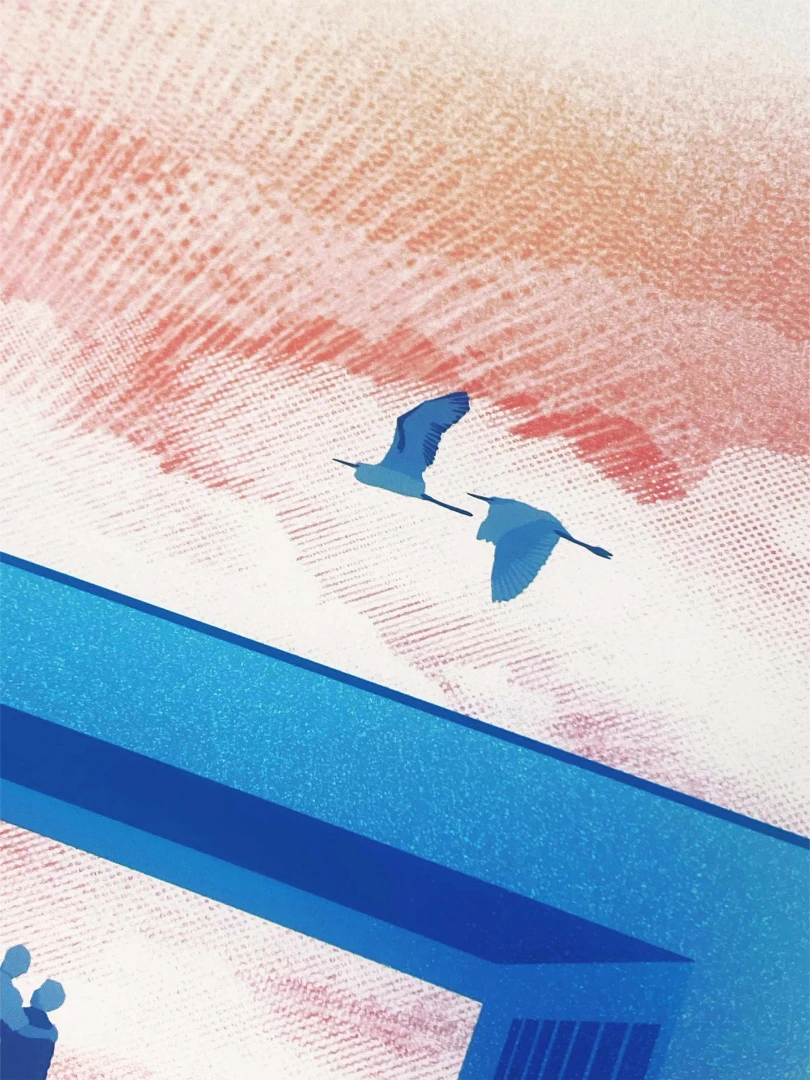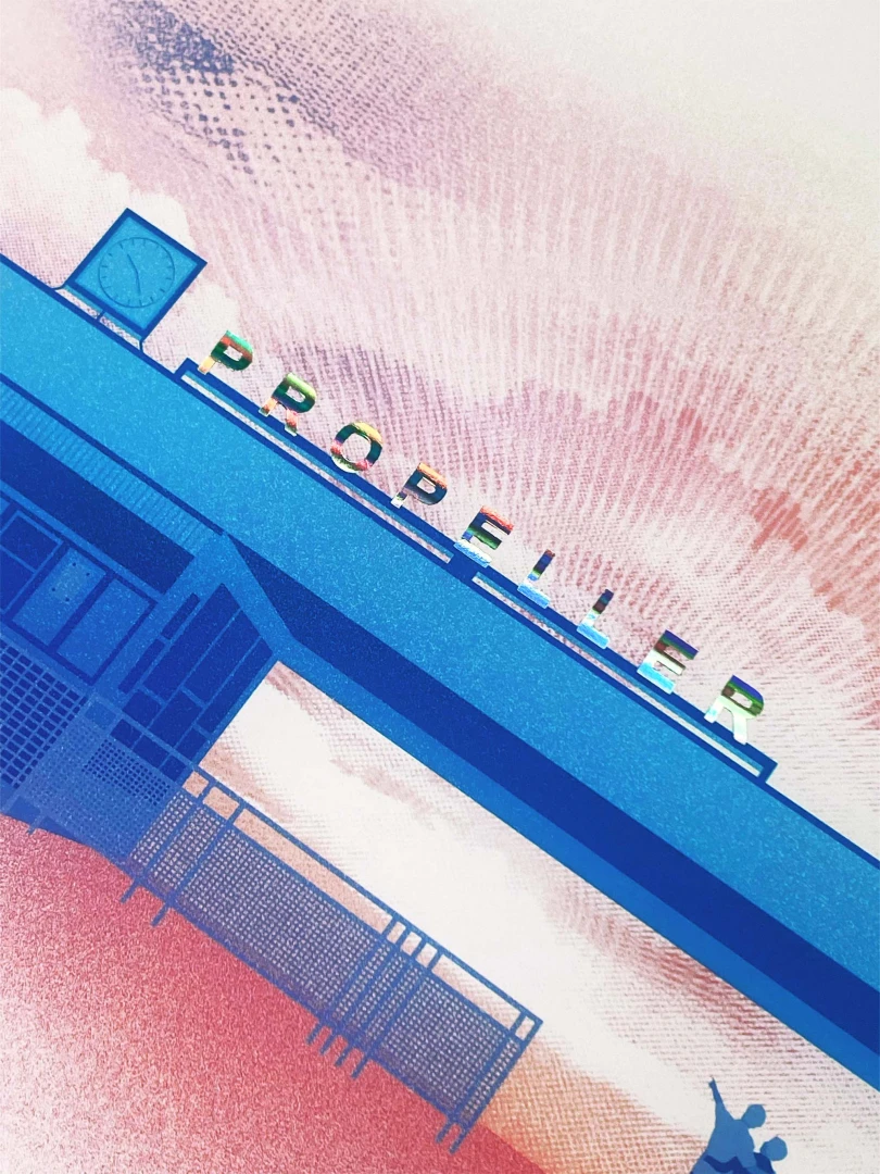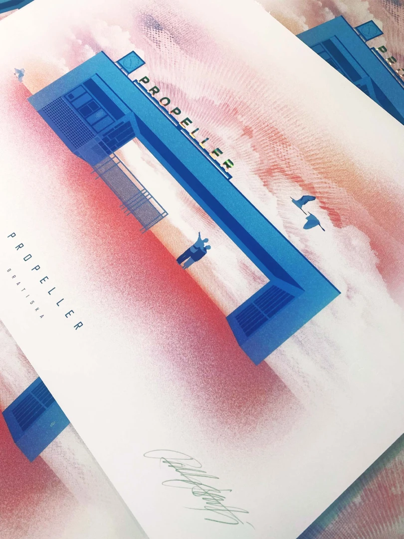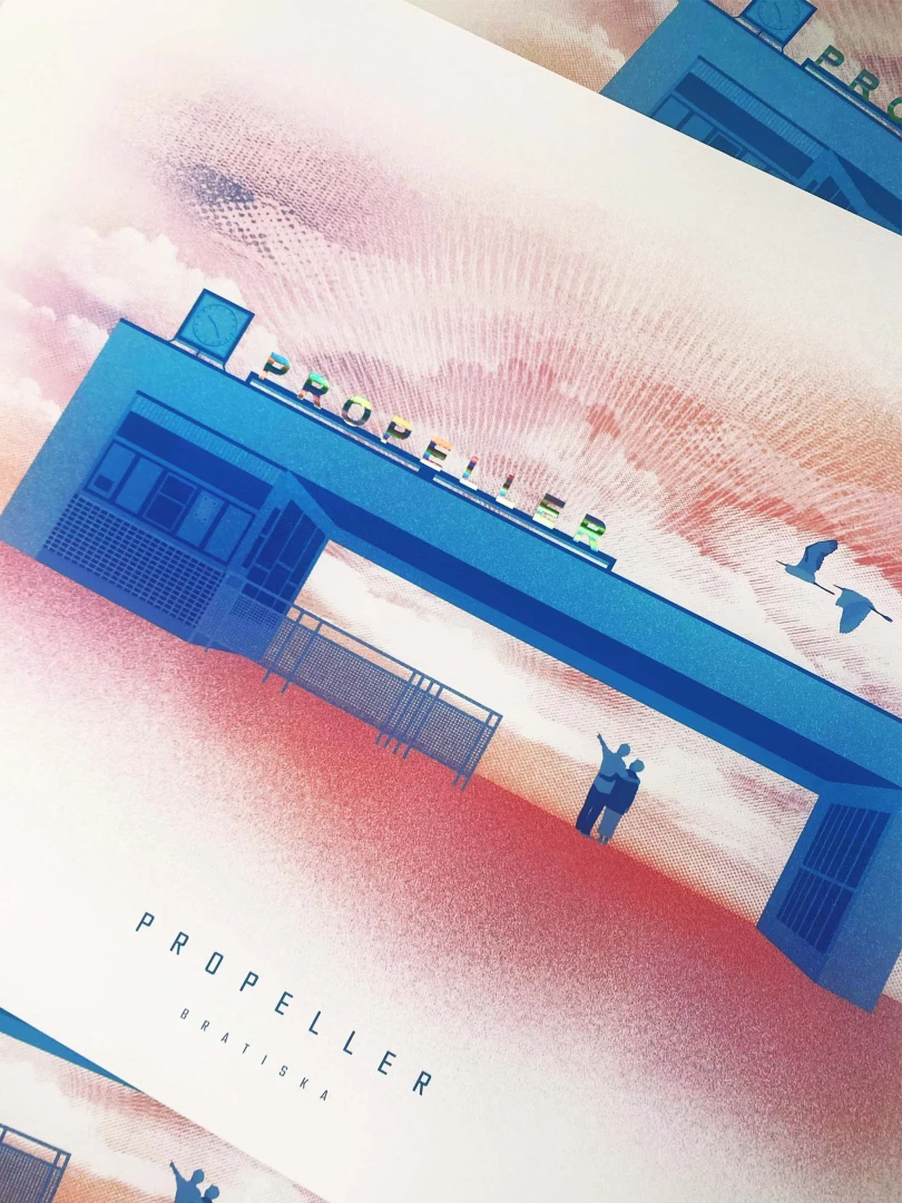 Dve nenápadné drobné stavby na oboch brehoch Dunaja odkazujú na zašlú slávu jednej z najobľúbenejších spôsobov verejnej prepravy v Prešporku. Už koncom 19. storočia začala medzi Námestím Ľudovíta Štúra a Au Café premávať pravidelná linka, ktorej neskôr dali obyvatelia názov Propeler odvodený od spôsobu pohonu lode. V roku 1930 vyrástli na pravej i ľavej strane Dunaja dve subtílne a architektonicky významné stavby – nástupištia Propeleru. Ich autorom bol vtedy mladý architekt Emil Belluš a niesli sa v prísne funkcionalistickom štýle. Ľavobrežný prístav je dnes citlivo prestavaný na kaviareň, nakoľko pôvodná funkcia stavieb zanikla – pravidelná lodná doprava medzi Starým mestom a Petržalkou bola pre stratovosť definitívne ukončená v roku 2003. — Autor textu: Štefan Cipár — Autor printu: Pavol Bartoš — Grafická spolupráca: Simona Novická — Formát printu: A3 — Náklad: limitovaný počet 33ks (Dotlače nebudeme robiť.) — Vytlačené na papier 300g Pergprahica high white smooth. — Maximálne 2ks na 1 objednávku.