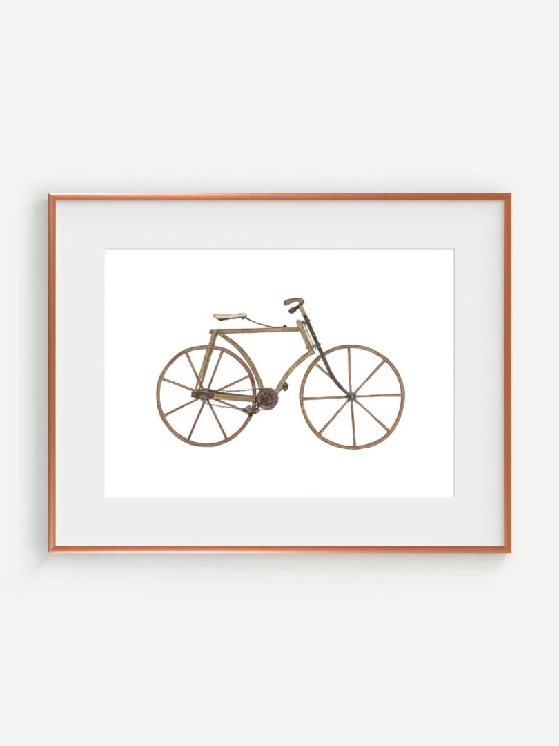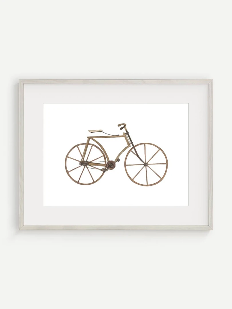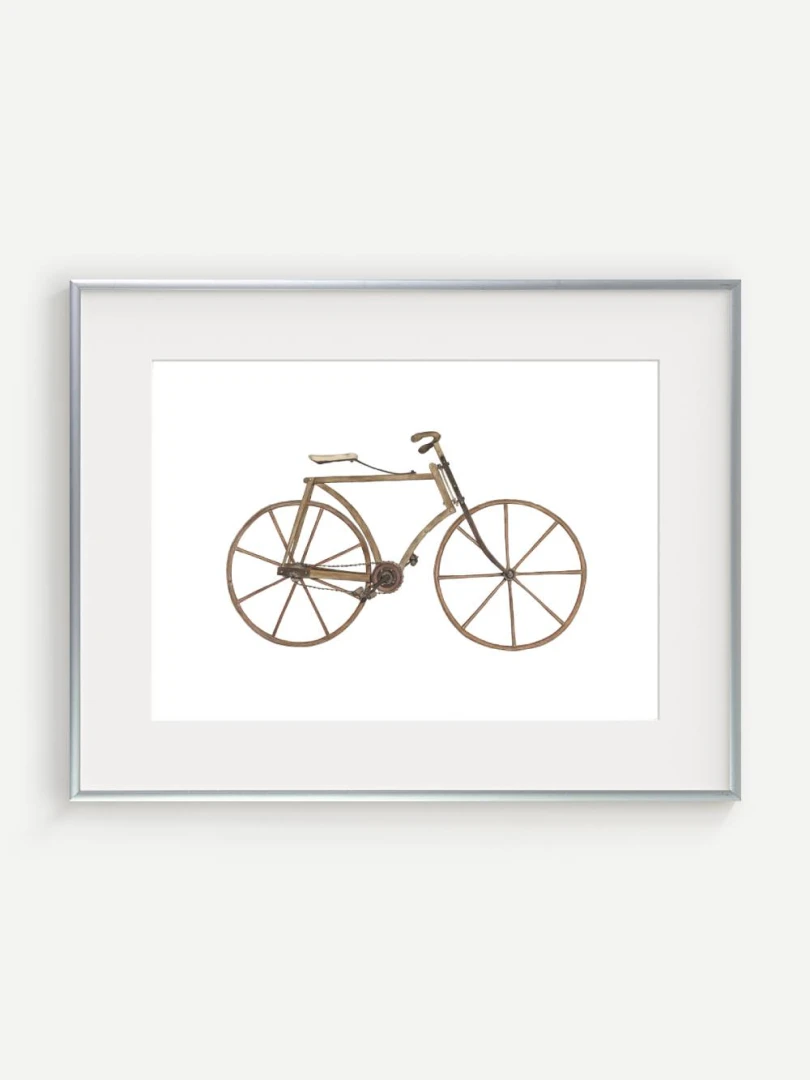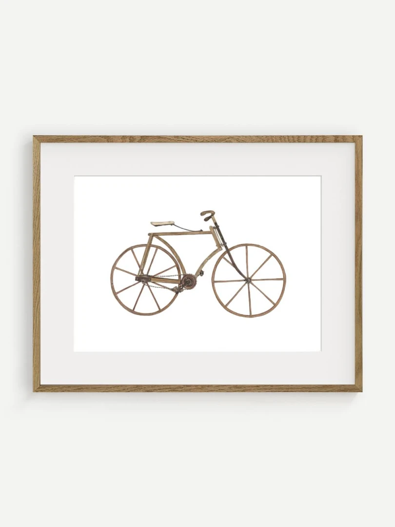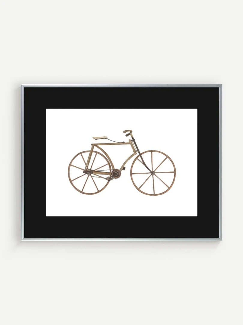 Tento print zachytáva detailnú ilustráciu starého bicykla s dreveným rámom a kolesami, aké sa používali na konci 19. storočia. Je to obraz jednoduchosti a vynaliezavosti – konštrukcia bez zbytočností, surové materiály, čisté línie. Pedále sú priamo napojené na reťazový prevod, sedlo jednoduché a funkčné, riadidlá elegantne zatočené. V každom detaile cítiť remeselnú zručnosť a vtedajšie chápanie pohybu ako niečoho mechanického, ale zároveň ľudsky dostupného.