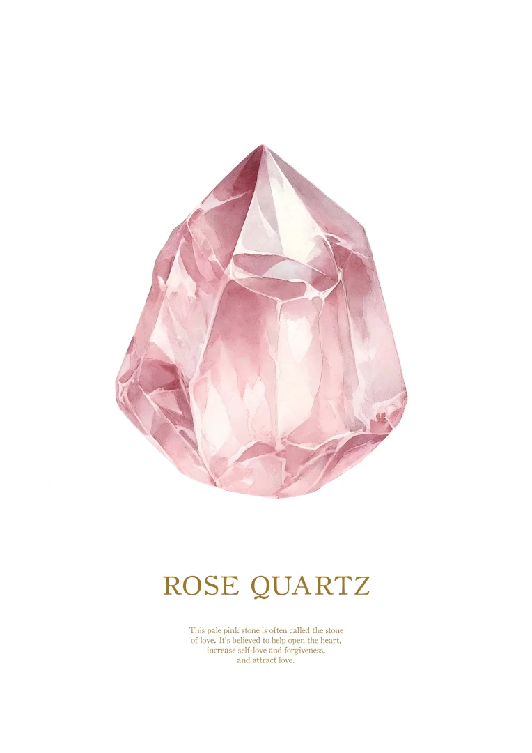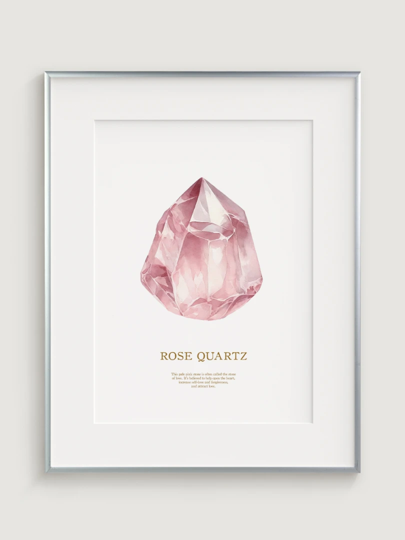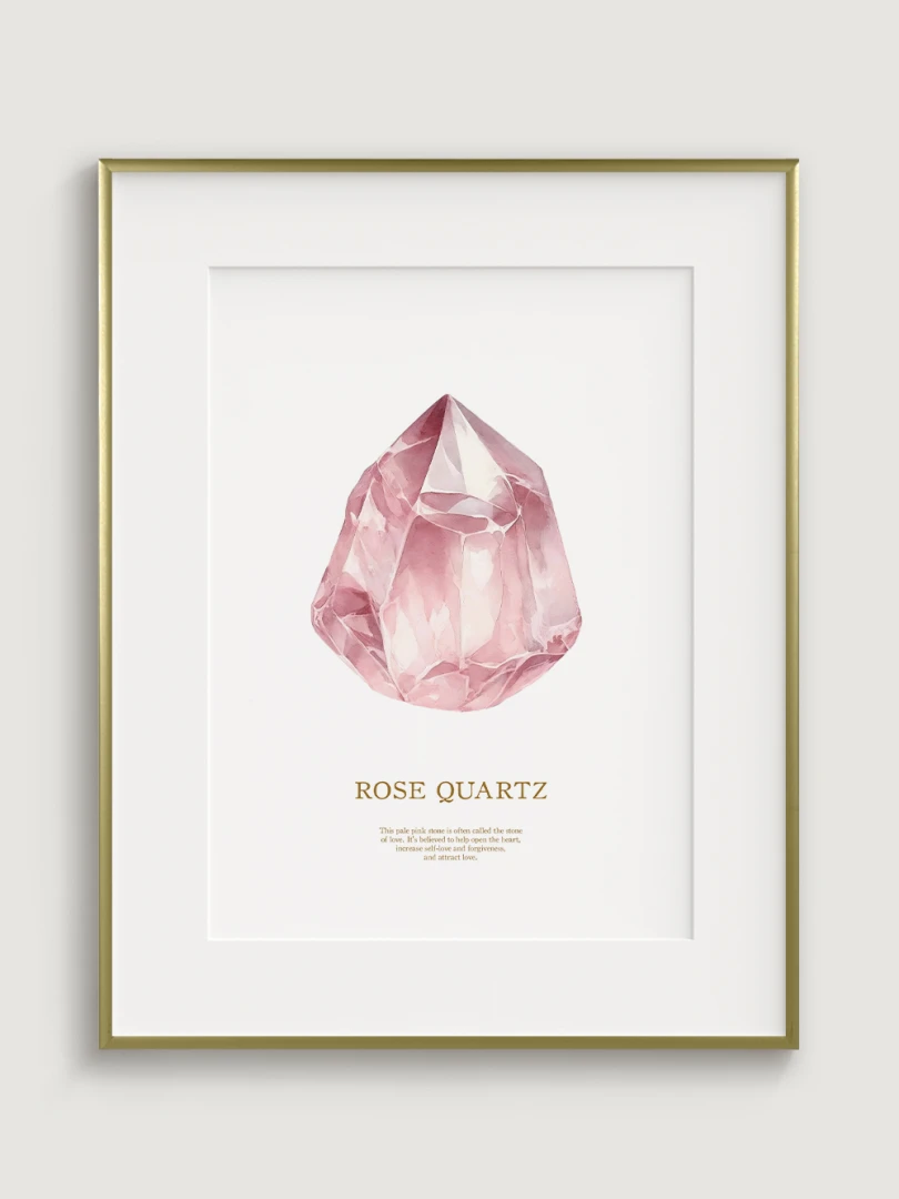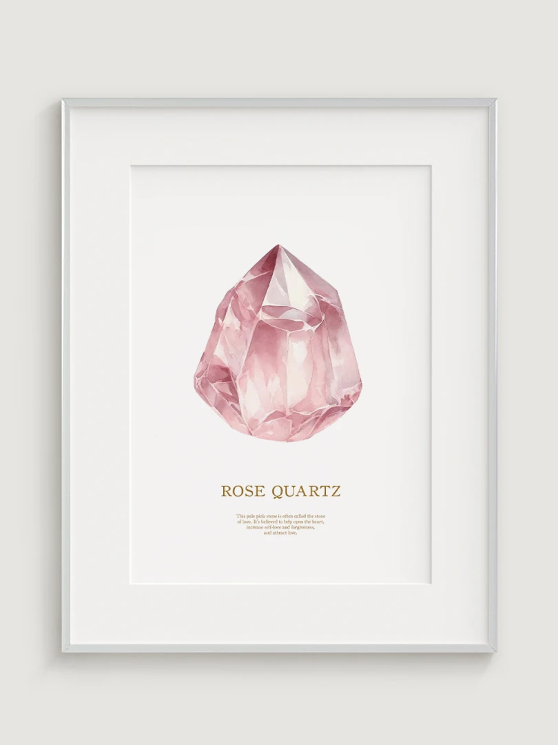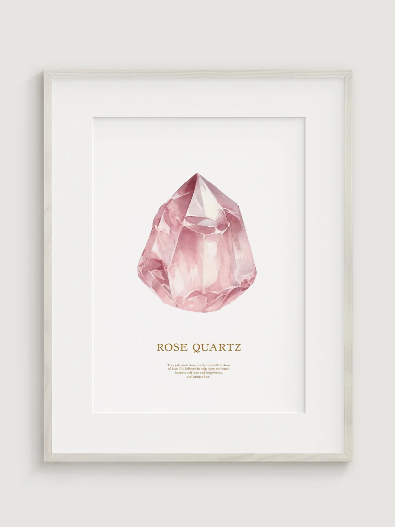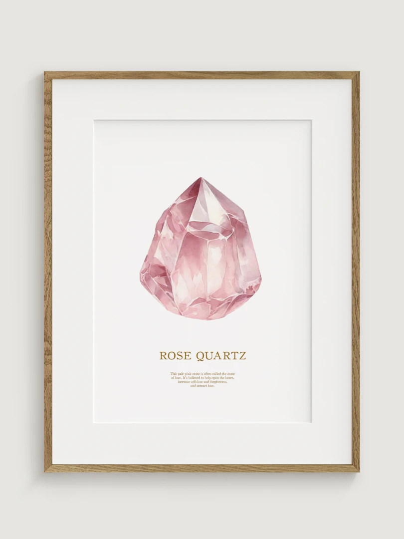 Tento pôsobivý print zobrazuje jemné, ružové tóny ruženínu, ktorý je známy svojimi liečivými a láskyplnými vlastnosťami. Ideálny pre pridanie dotyku jemnej elegancie do akejkoľvek miestnosti, tento print zachytáva údajné schopnosti kameňa prinášať lásku, harmóniu a vnútorný pokoj.