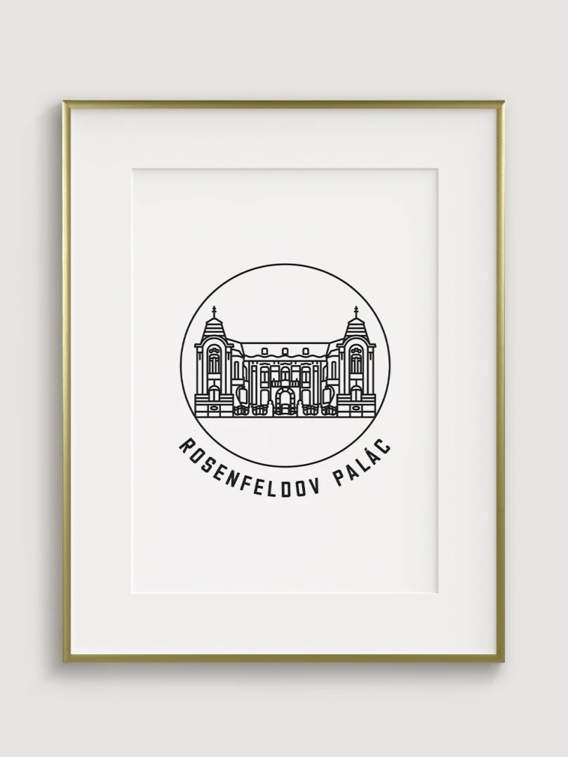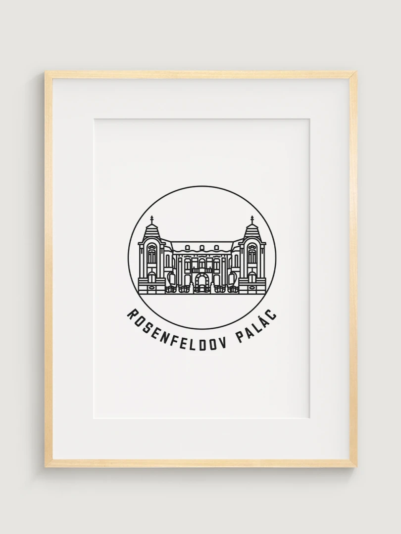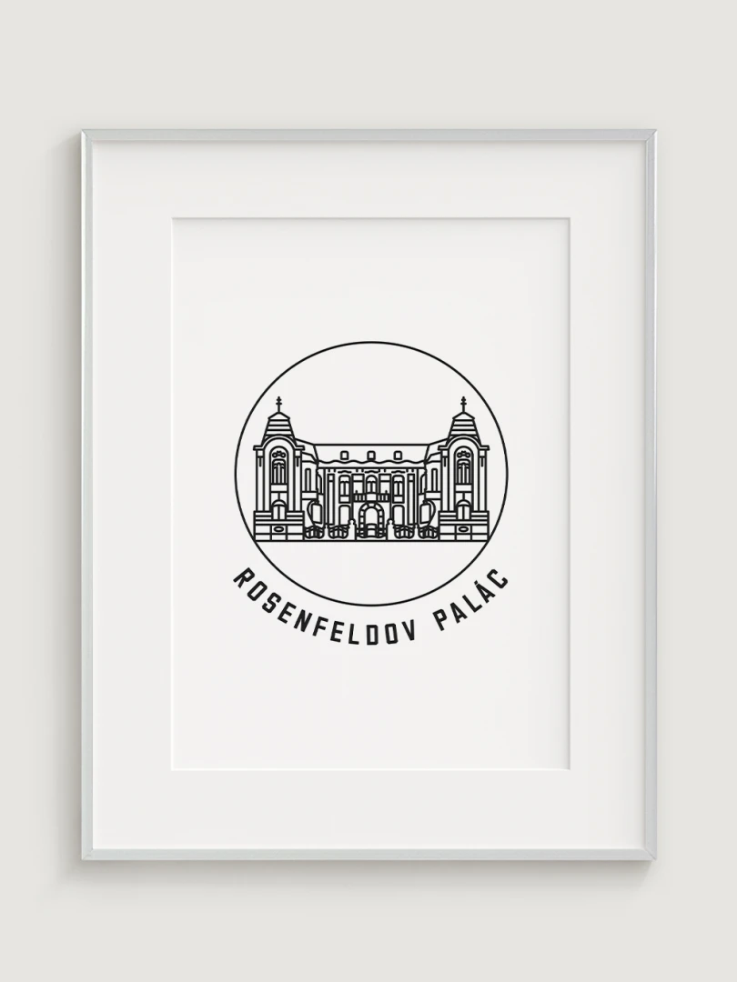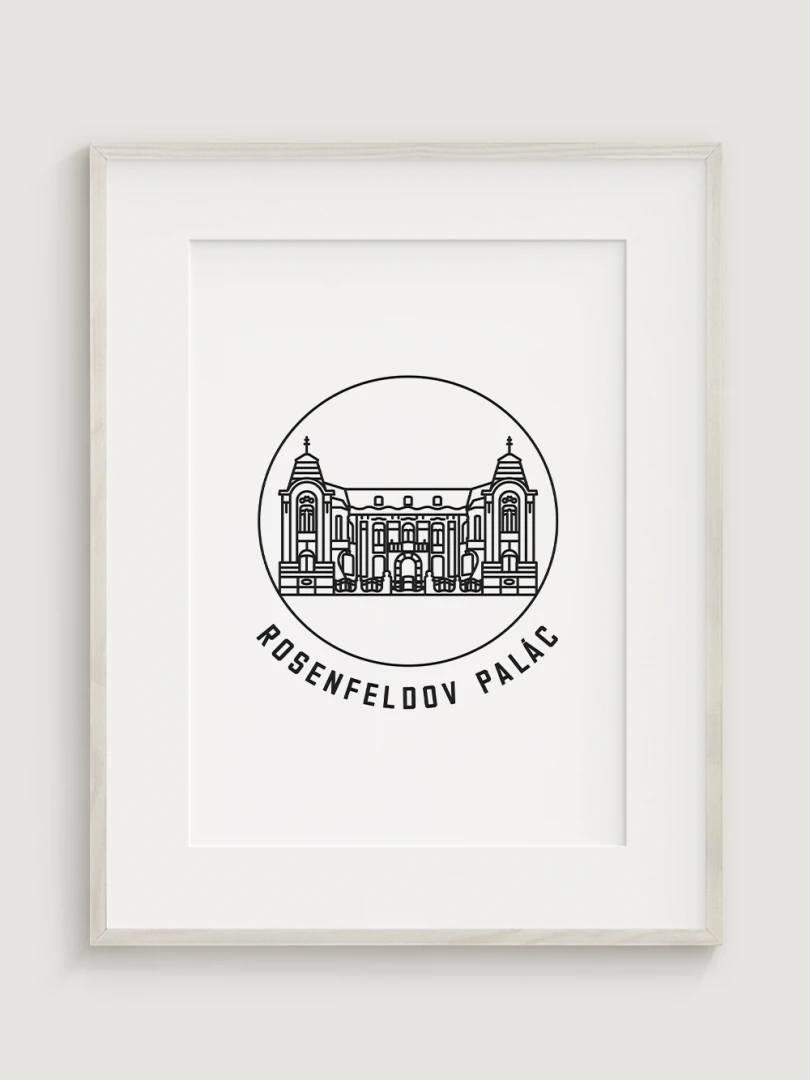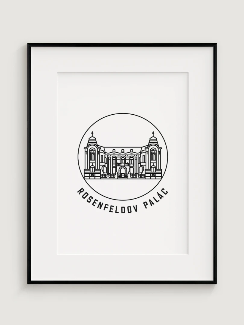 Tento print predstavuje štýlizované, minimalistické zobrazenie Rosenfeldovho paláca v Žiline, budovy, ktorá sa vyznačuje secesným dizajnom a výnimočnými architektonickými prvkami. Vypracovaný s jemnou čiernou linkovou kresbou na kvalitnom papieri, táto ilustrácia zachytáva čisté línie a detaily paláca v nadčasovom a elegantnom štýle.