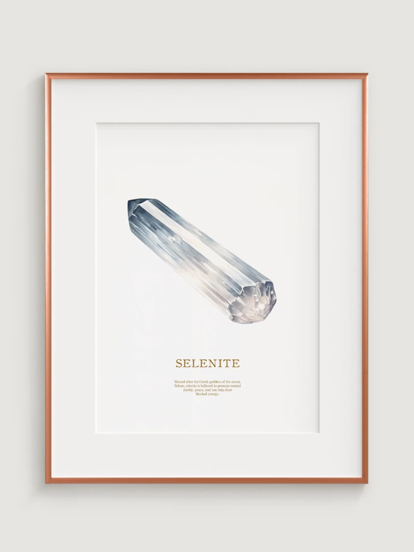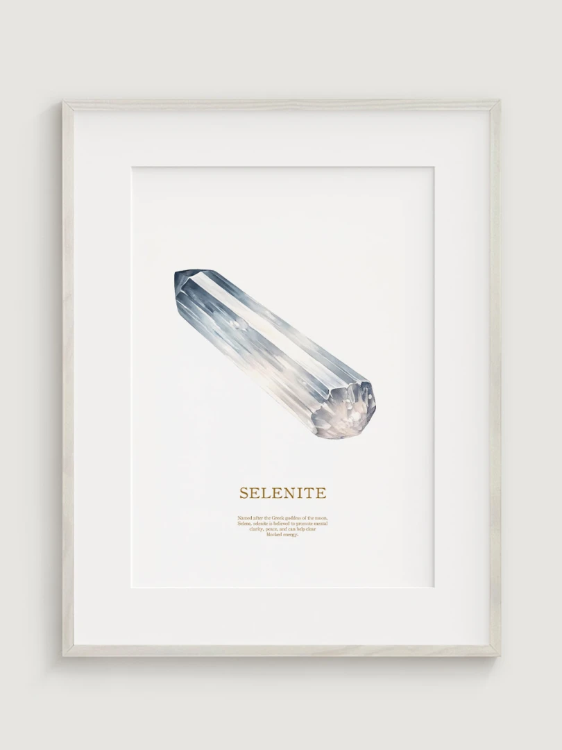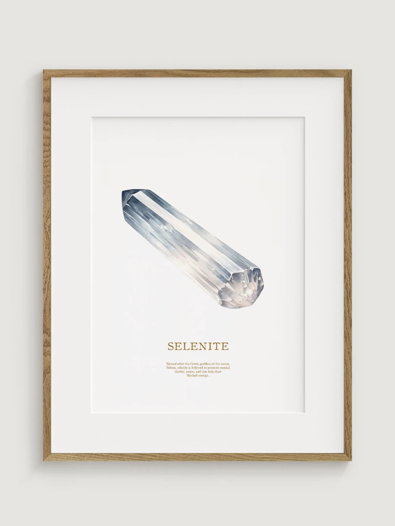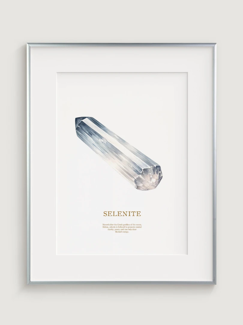 Tento print zobrazuje obraz selenitového kryštálu, ktorý vyniká svojou jedinečnou štruktúrou a svetlými, chladnými tónmi. Kryštál je zobrazený v realistických detailoch, ktoré zvýrazňujú jeho prirodzený lesk a čistotu.