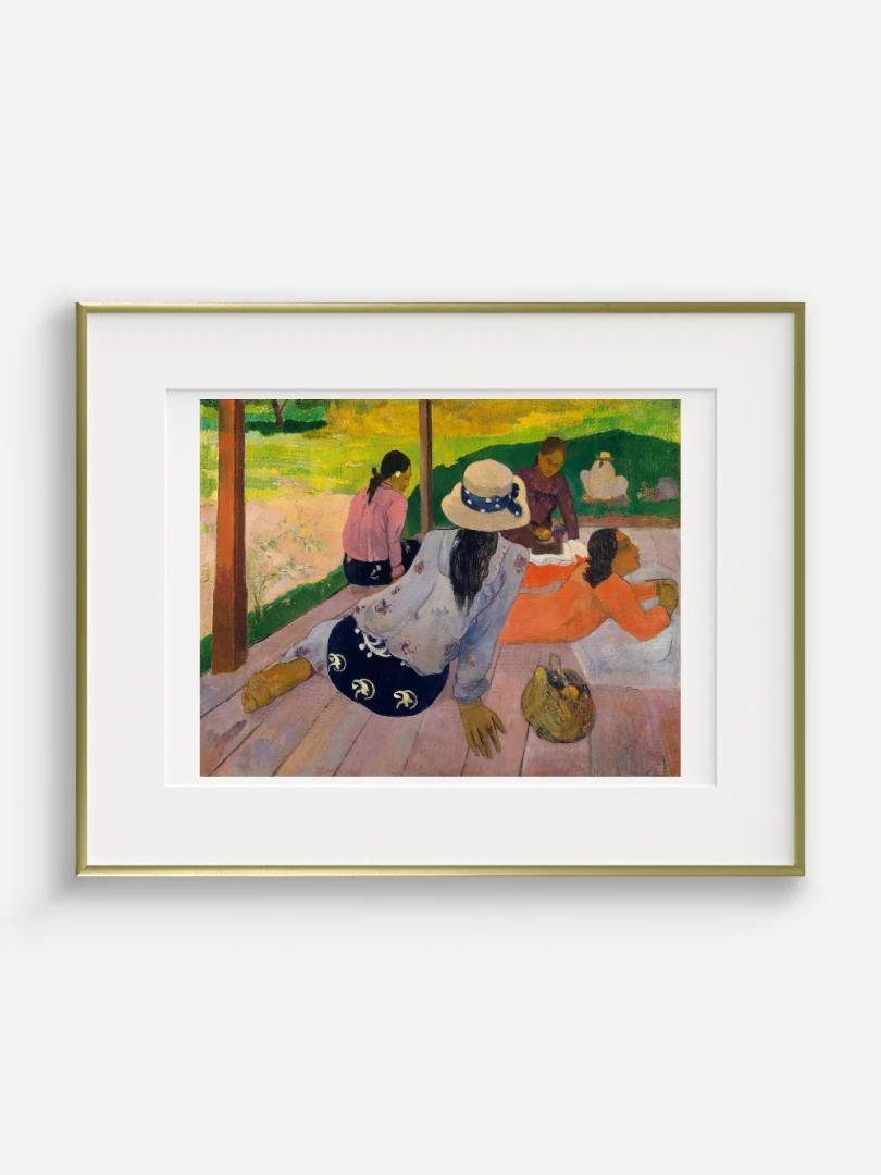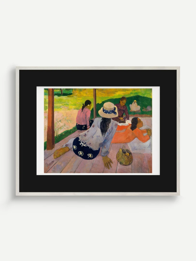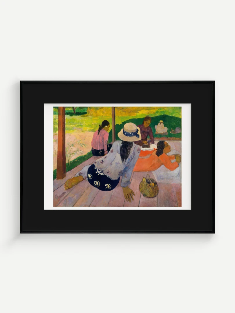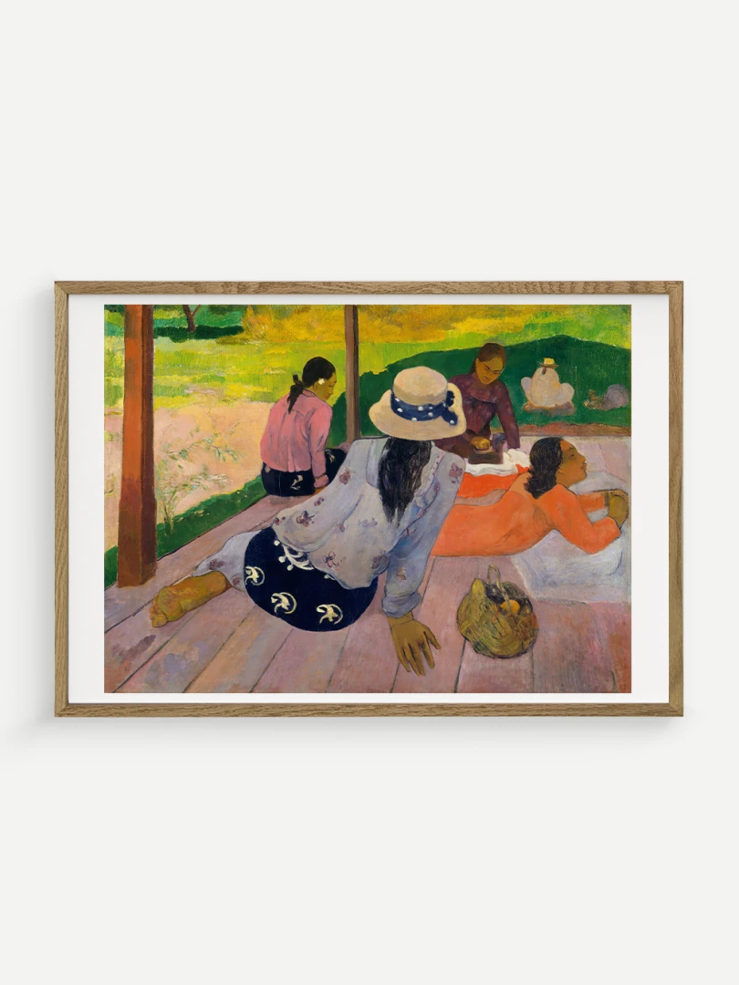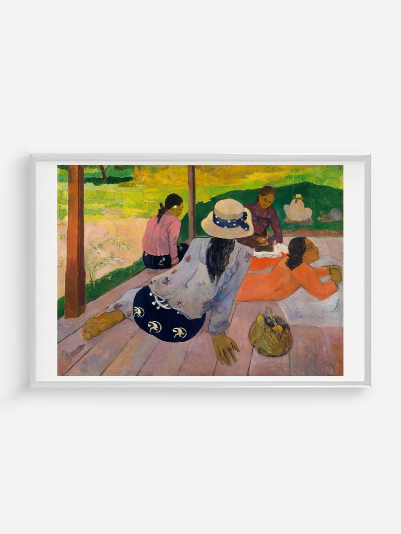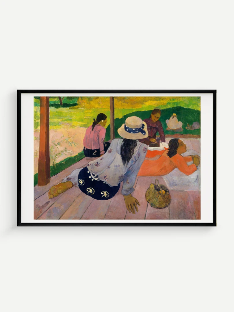 Tento nádherný umelecký print zachytáva pokojnú a harmonickú atmosféru Tahiti, ktorá fascinovala Paula Gauguina počas jeho pobytu na ostrove. Dielo „Siesta“ z roku 1892 zobrazuje skupinu tahitských žien odpočívajúcich na verande, čím dokonale vystihuje ich prirodzenú gráciu a pocit pospolitosti, ktorý mal na umelca hlboký vplyv. Jeho farebnosť a hravá kompozícia dodávajú obrazu živý a uvoľnený charakter.