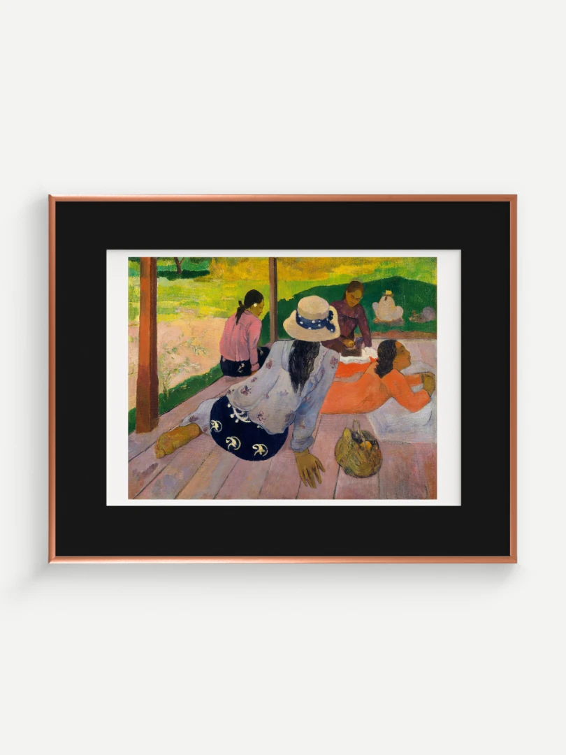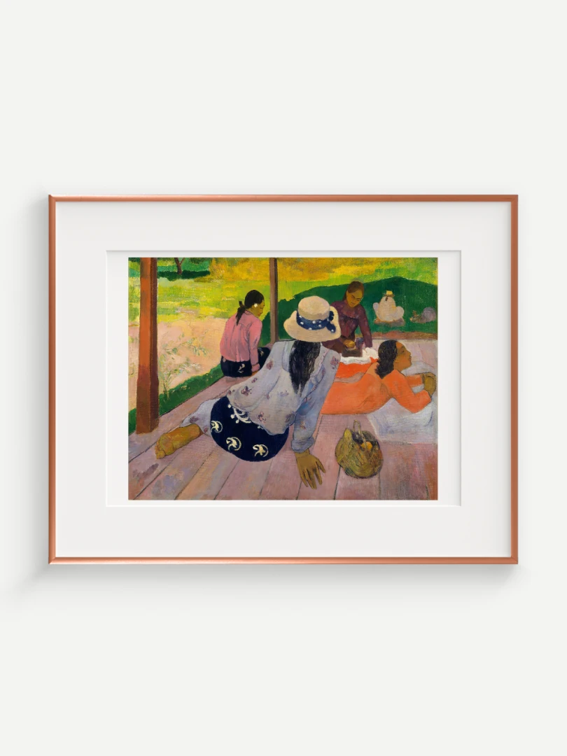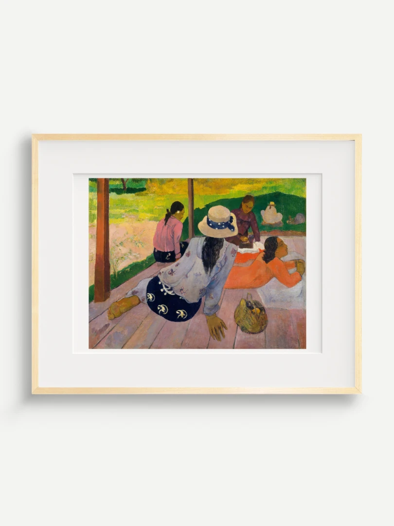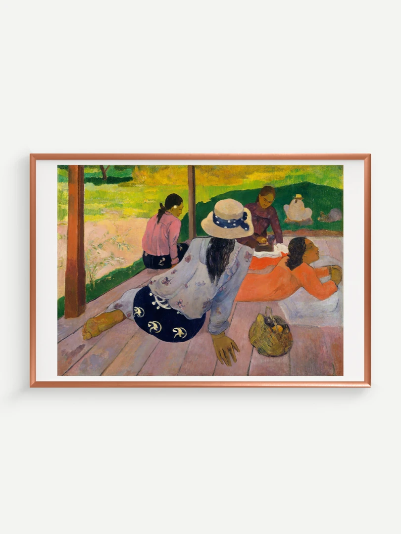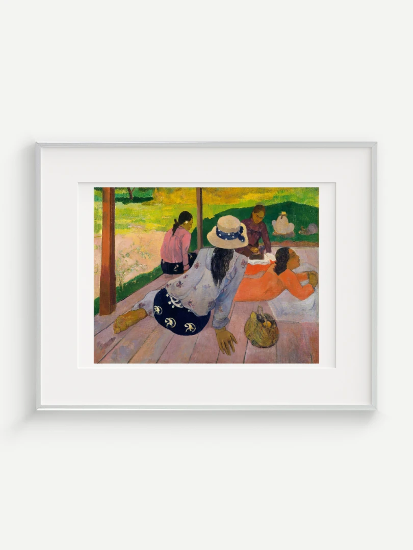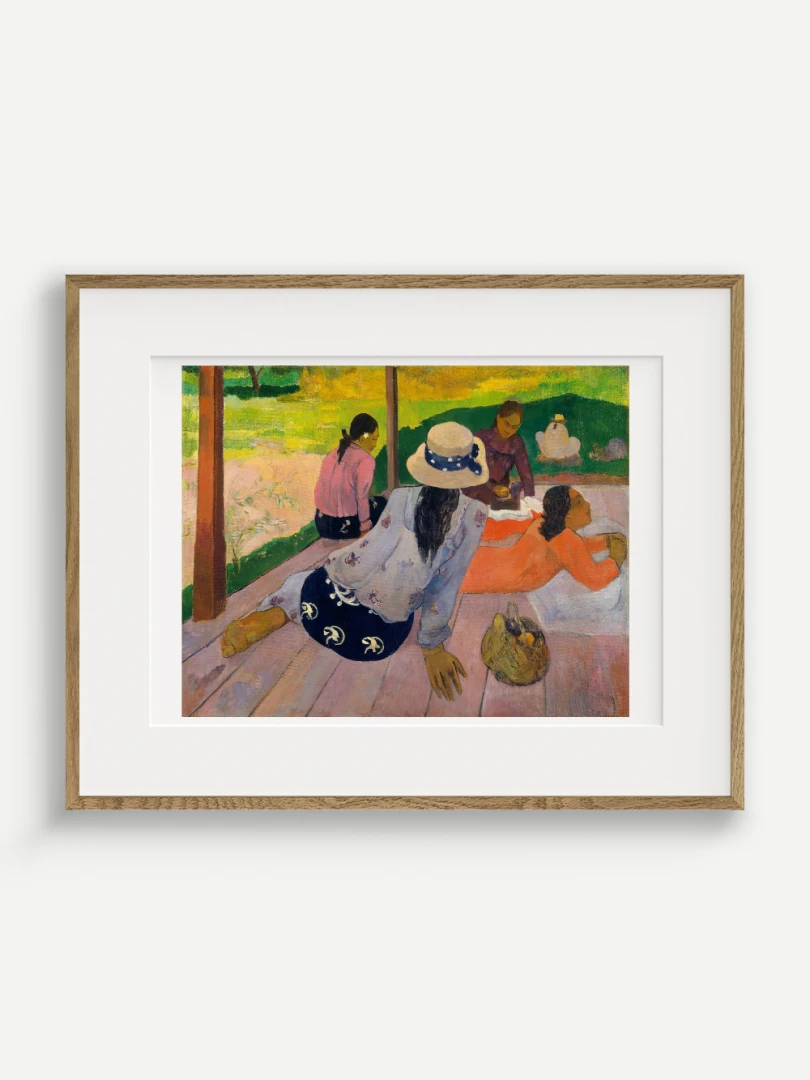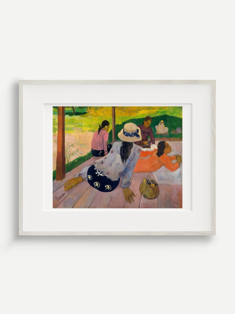 Tento nádherný umelecký print zachytáva pokojnú a harmonickú atmosféru Tahiti, ktorá fascinovala Paula Gauguina počas jeho pobytu na ostrove. Dielo „Siesta“ z roku 1892 zobrazuje skupinu tahitských žien odpočívajúcich na verande, čím dokonale vystihuje ich prirodzenú gráciu a pocit pospolitosti, ktorý mal na umelca hlboký vplyv. Jeho farebnosť a hravá kompozícia dodávajú obrazu živý a uvoľnený charakter.
