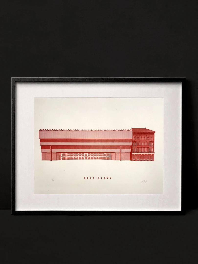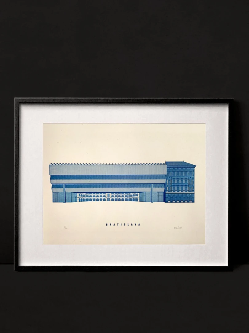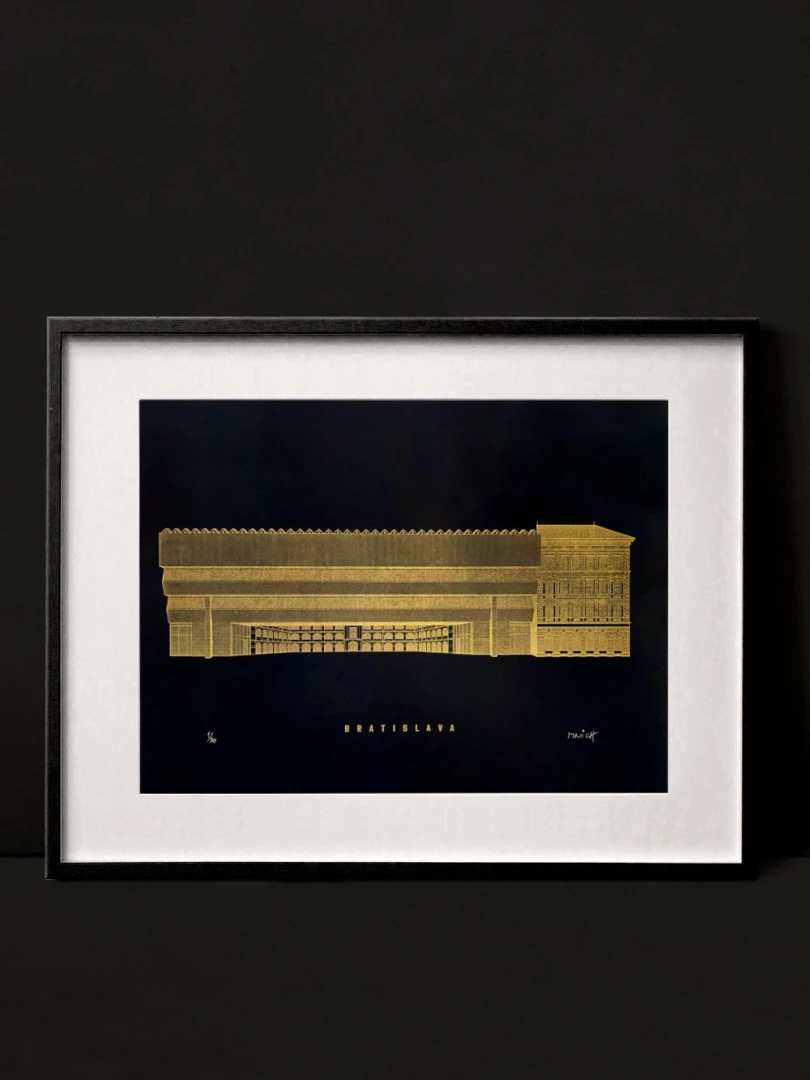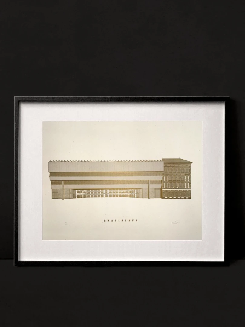 Odvážna, kontrastná a nadčasová. Takou bezpochyby je prístavba SNG od Vladimíra Dedečka na nábreží Dunaja. Mnohými zatracovaná, no odborníkmi a veľkou časťou laickej verejnosti oslavovaná. Brutalistická hmota, ktorá nemá vo svete konkurenciu, bola slávnostne otvorená v roku 1977. Jej silný kontrast s pôvodnými budovami SNG - Esterházyho palácom a Vodnými kasárňami nenecháva nikoho ľahostajným a zrejme i to bol jeden zo zámerov architekta – vzbudiť v bežnom človeku emócie, donútiť ho zamyslieť sa. Premostenie po revolúcii v roku 1989 chátralo a v roku 2001 bolo pre havarijný stav uzatvorené. Dnes, po rozsiahlej rekonštrukcii, sa opäť otvára širokej verejnosti a odkaz Vladimíra Dedečka tak žije ďalej. — Vytvorené v spolupráci s @noistypo na starom analogovom ručonom tlačiarenskom stroji zo 70 rokov minulého storočia v Novej Cvernovke a v 5 farbách v limitovaných počtoch 30 kusov zo zlatej na čiernom papiery a čiernej farby a 20 kusov z modrej a zlatej a 10KS tmavočervenej verzie. Dotlač nebudeme robiť. — Autor textu: Štefan Cipár — Autor printu: Jozef Mnich — Formát printu: A3 — Maximálne 2ks na 1 objednávku. — Rám nie je súčasťou balenia.