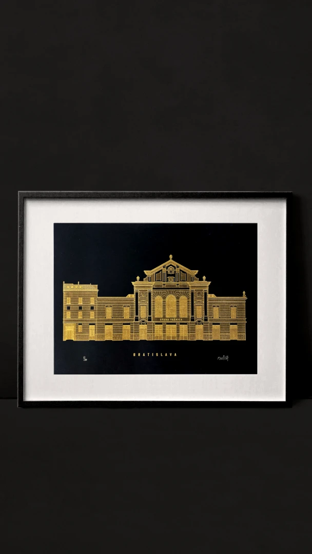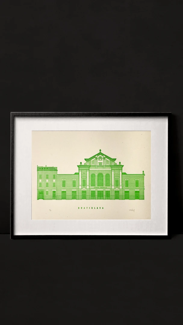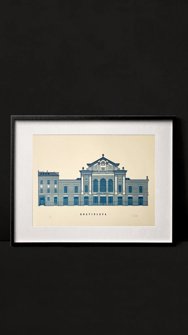 Písal sa rok 1903 keď sa mesto rozhodlo zadať prvú zákazku na stavbu tržnice. Vysledná verzia je dielom architekta Endre Makaya a mestských inžinierov, ktorí pri stavbe krytej tržnice použili priznanú ocelovú konštrukciu. Bola to na tú dobu odvážna novinka inšpirovaná progresívnymi konštrukciami z Eiffelovej dielne. Stavba budovy Starej Tržnice sa začali v roku 1908 a už po 2 rokoch a to presne 31.októbra 1910 ju otvorili. Dvere tržnice boli otvorené celých 50rokov až do roku 1960, kedy sa do jej priestorov presťahovala STV. A až v roku 2013 sa vďaka Aliancii Stará tržnica vrátil trh do jej priestorov. — Vytlačené ručne v spolupráci s @noistypo na starom tlačiarenskom stroji zo 70rokov minulého storočia v Novej Cvernovke a v 4 farbách v limitovaných počtoch 30 a 20 kusov. Dotlač nebudeme robiť — Autor printu: Jozef Mnich — Formát printu: A3 — Maximálne 2ks na 1 objednávku. — Rám nie je súčasťou balenia.