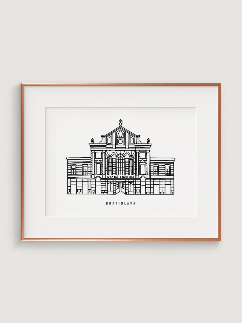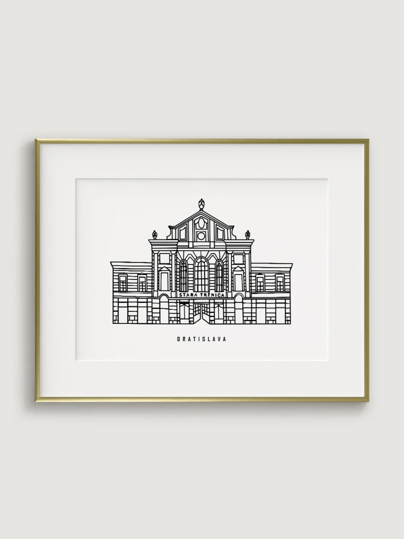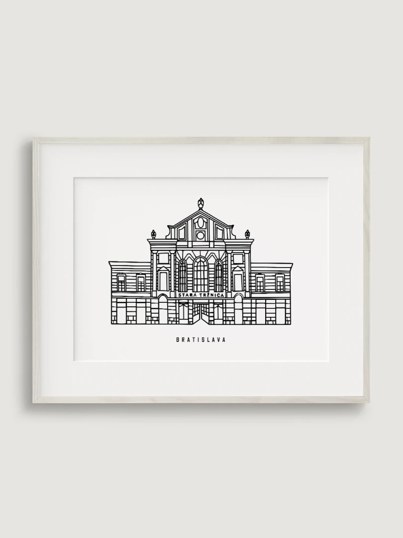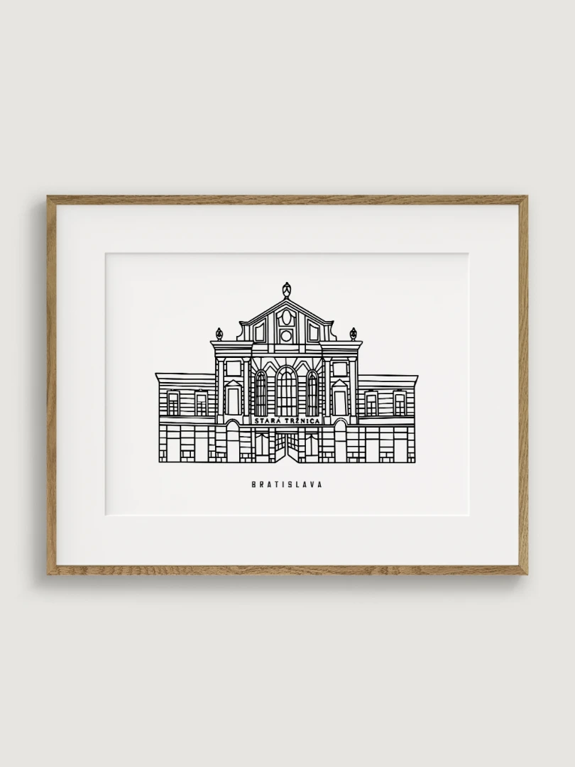 Tento print predstavuje štýlizované, minimalistické zobrazenie Starej Tržnice, známej svojou charakteristickou architektúrou a živou históriou. Vypracovaná s elegantnou čiernou linkovou kresbou na kvalitnom papieri, táto ilustrácia zachytáva veľkolepú fasádu budovy v čistom a súčasnom štýle. Nezaťažené zloženie zvýrazňuje klasické dizajnové prvky Tržnice, čím vytvára perfektné spojenie tradície a moderných umeleckých estetík.