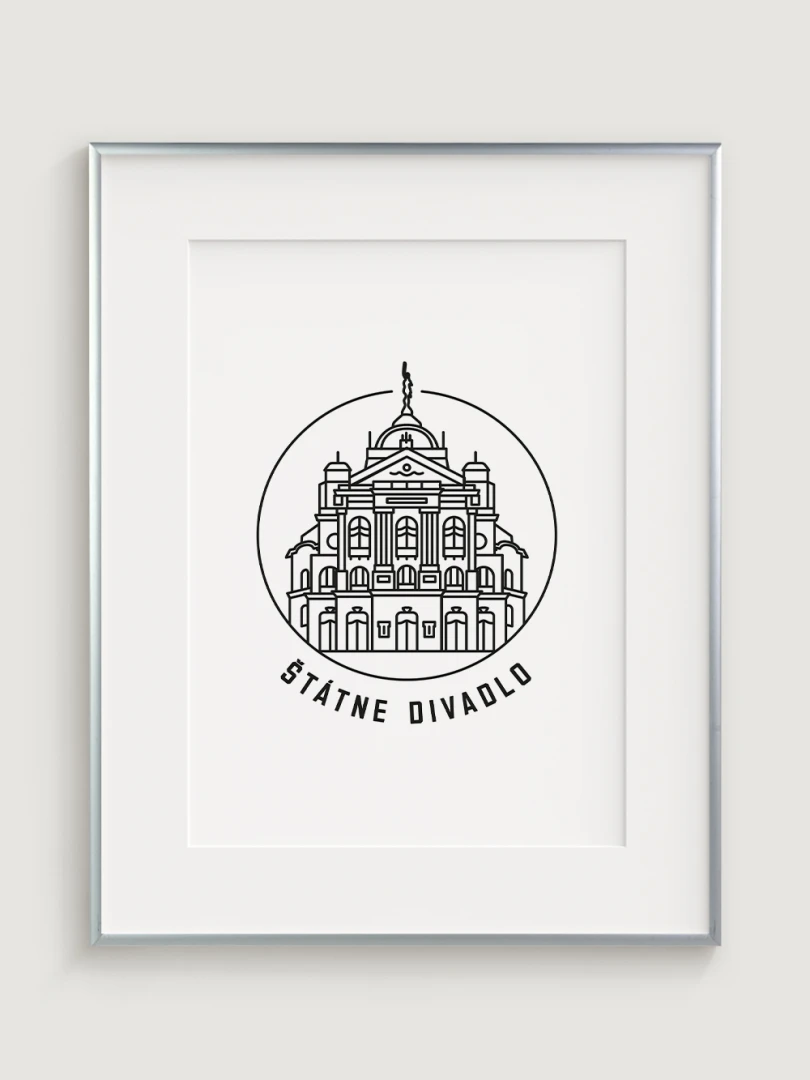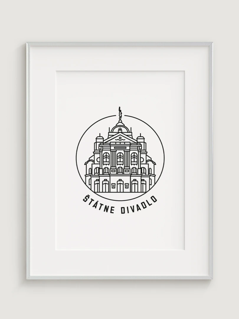 Tento print predstavuje štýlizované, minimalistické zobrazenie Štátneho divadla v Košiciach, budovy, ktorá spája historickú krásu s moderným kultúrnym významom. Vypracovaný s jemnou čiernou linkovou kresbou na kvalitnom papieri, táto ilustrácia verne odráža eleganciu a detailnú architektúru divadla v nadčasovom štýle.