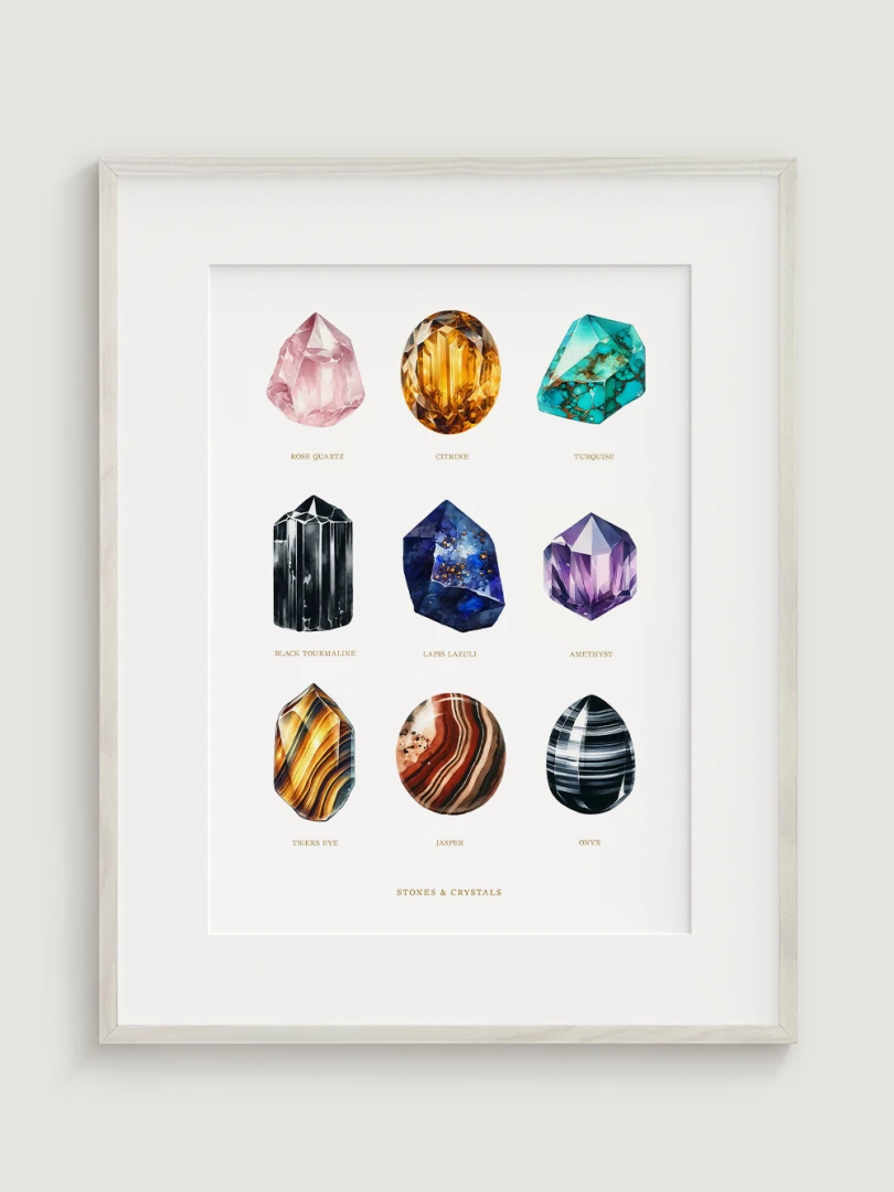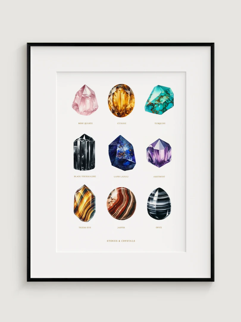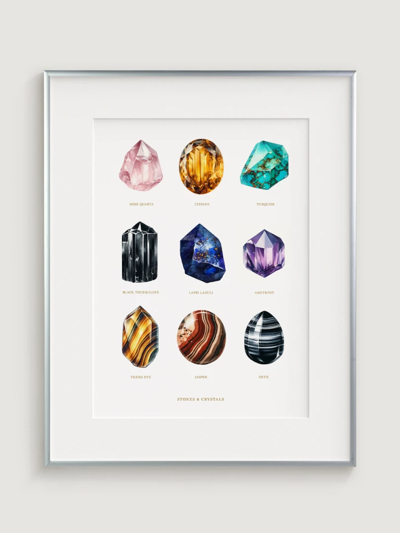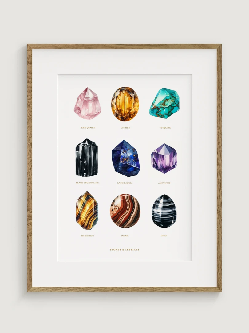 Každý drahokam je starostlivo ilustrovaný tak, aby vynikli jeho jedinečné kvality a farby, čo robí tento print dokonalým doplnkom do každej miestnosti, ktorá by mohla využiť dotyk prírodnej krásy. Sofistikovaný dizajn a edukačný aspekt tlače ho tiež robia ideálnym pre priestory venované wellness a relaxácii, ako sú napríklad jógové štúdia alebo terapeutické miestnosti.