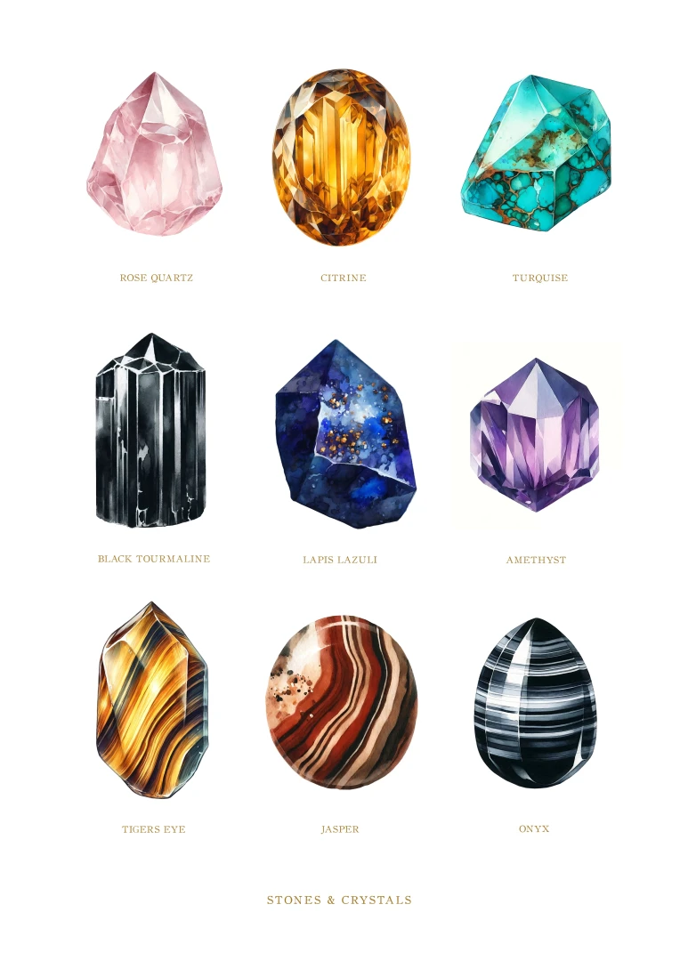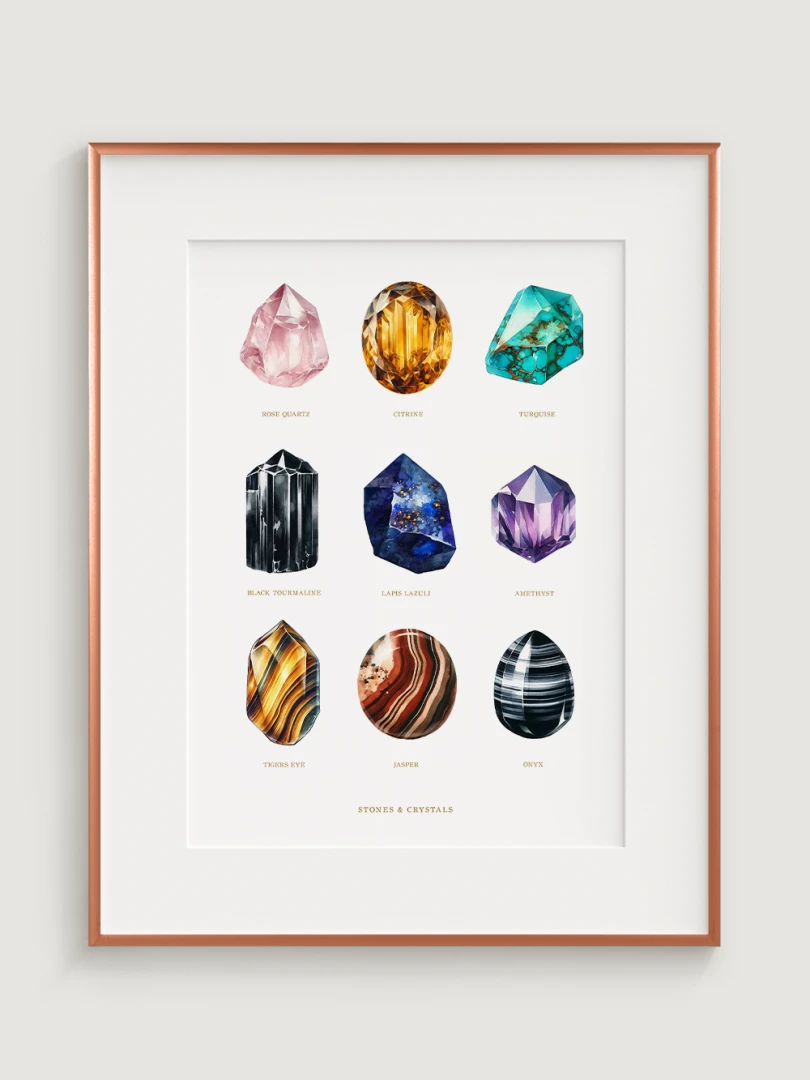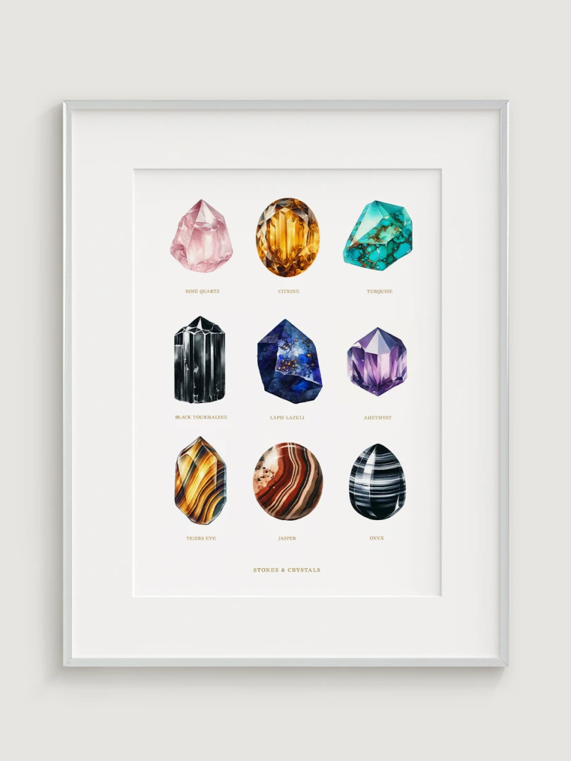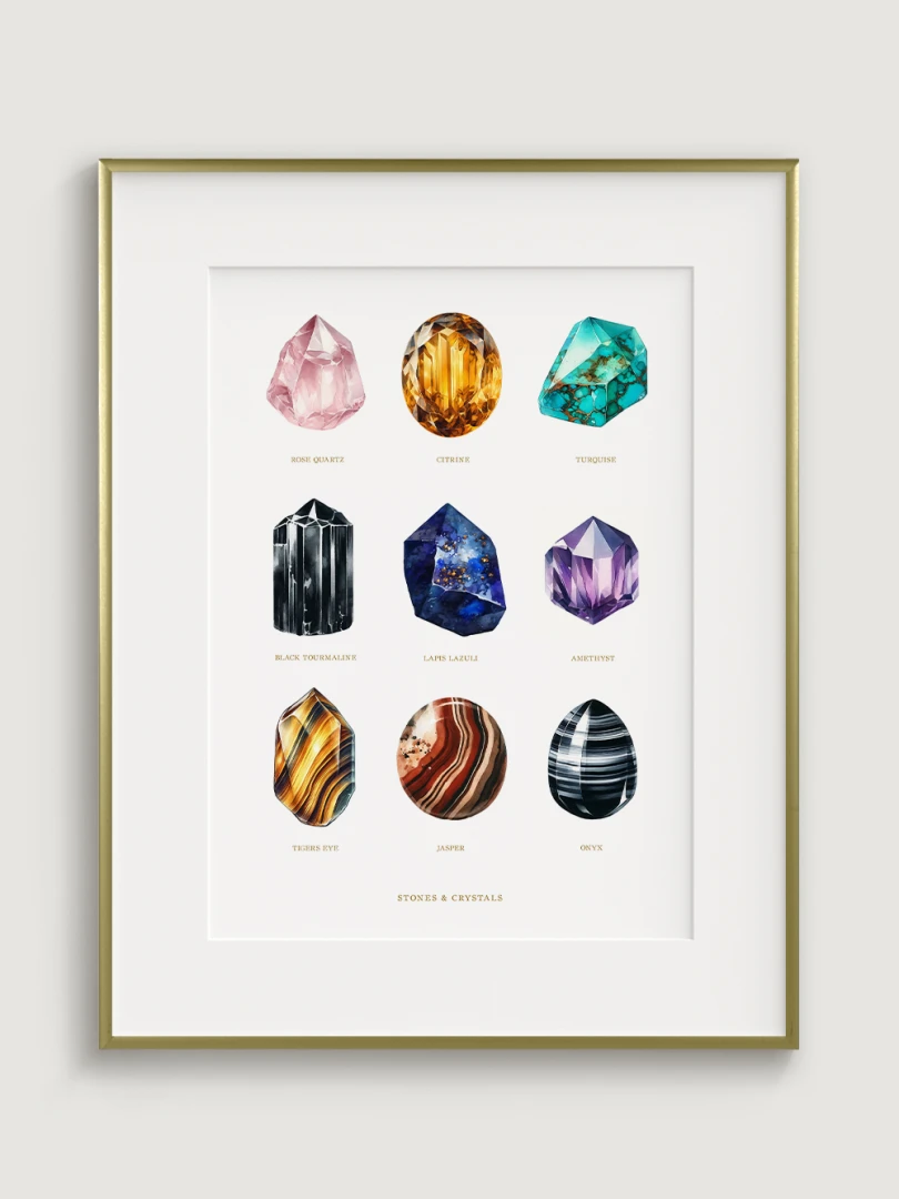 Každý drahokam je starostlivo ilustrovaný tak, aby vynikli jeho jedinečné kvality a farby, čo robí tento print dokonalým doplnkom do každej miestnosti, ktorá by mohla využiť dotyk prírodnej krásy. Sofistikovaný dizajn a edukačný aspekt tlače ho tiež robia ideálnym pre priestory venované wellness a relaxácii, ako sú napríklad jógové štúdia alebo terapeutické miestnosti.