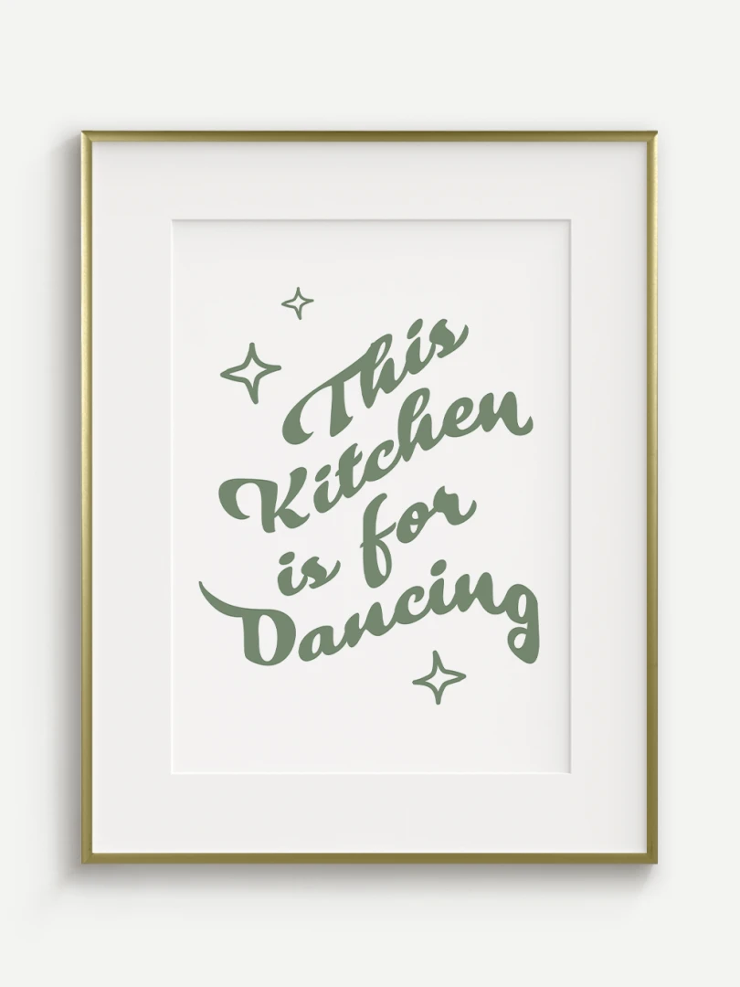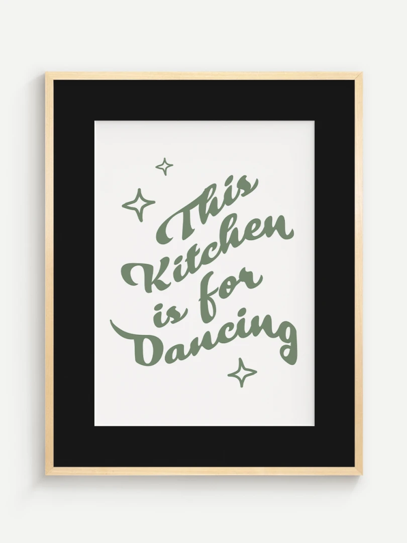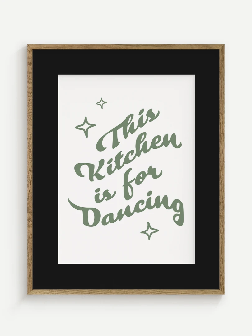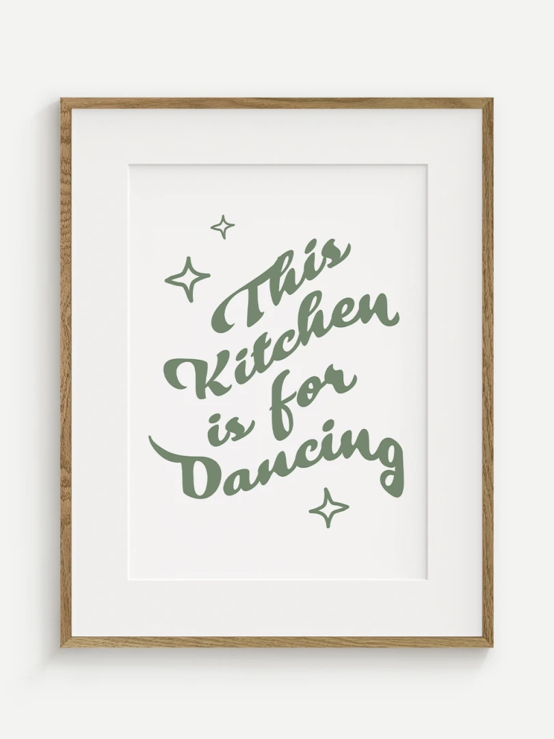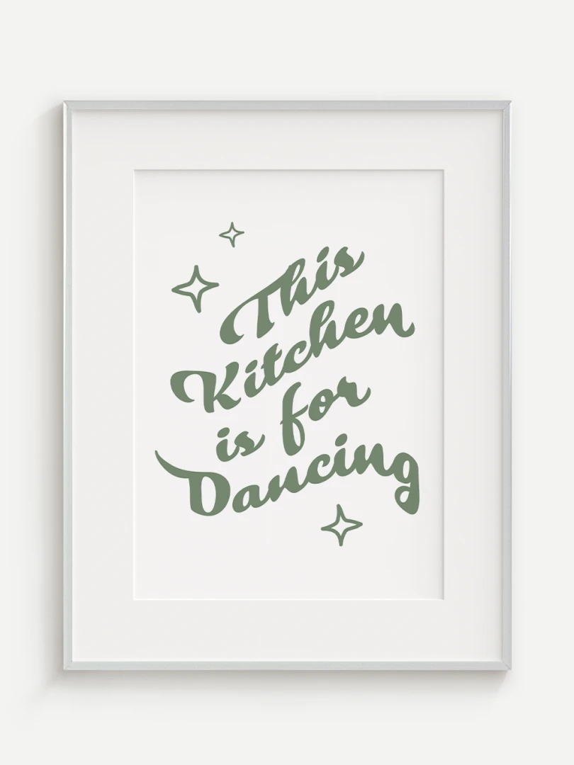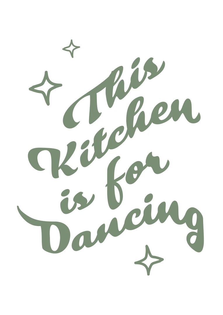 Tento print oslavuje radosť z varenia, dobrého jedla a spontánnych tanečných momentov v kuchyni. Hravý nápis "This Kitchen is for Dancing" v jemnej zelenej farbe a elegantnej ručne písanej typografii vytvára uvoľnenú atmosféru a dodáva priestoru osobitý šarm.