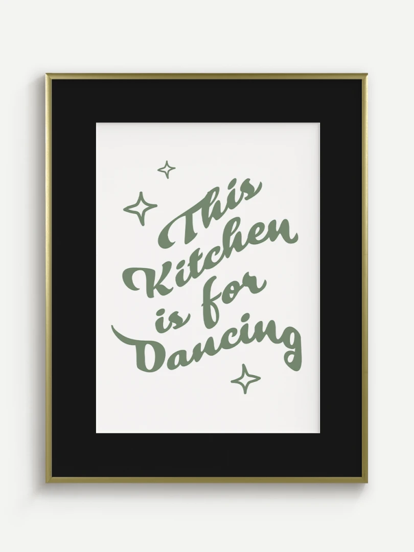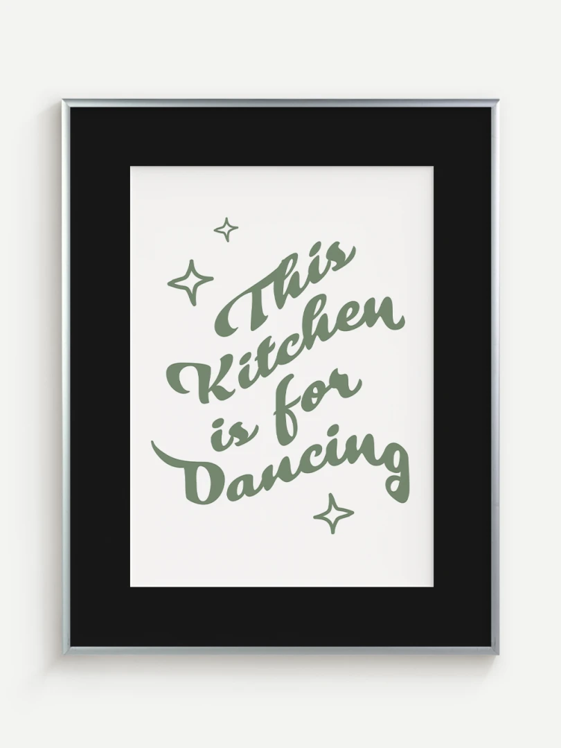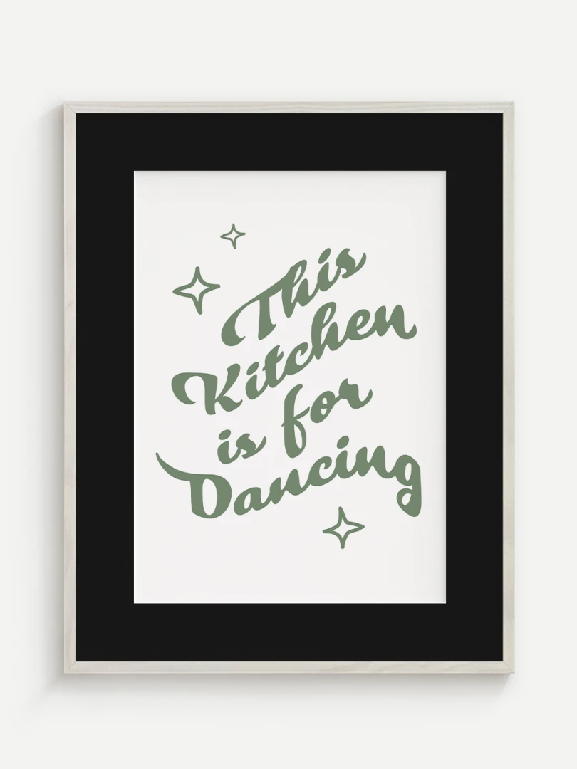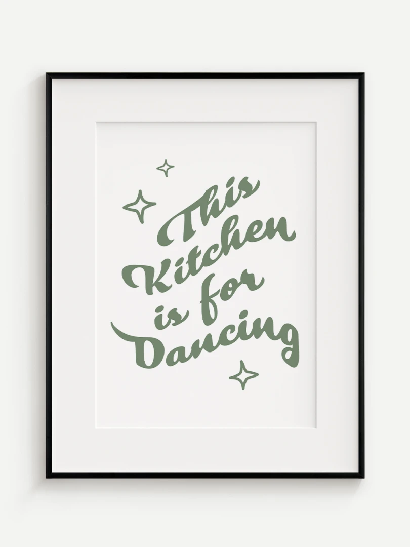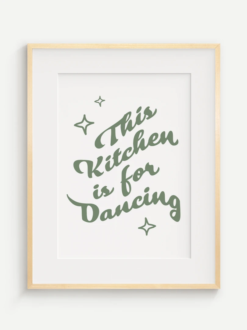 Tento print oslavuje radosť z varenia, dobrého jedla a spontánnych tanečných momentov v kuchyni. Hravý nápis "This Kitchen is for Dancing" v jemnej zelenej farbe a elegantnej ručne písanej typografii vytvára uvoľnenú atmosféru a dodáva priestoru osobitý šarm.