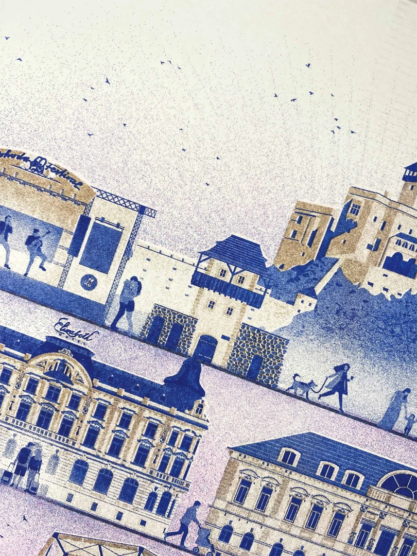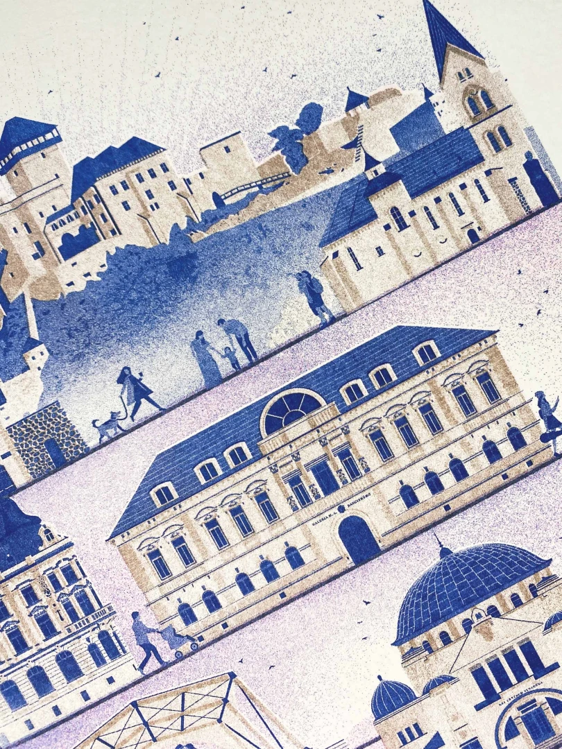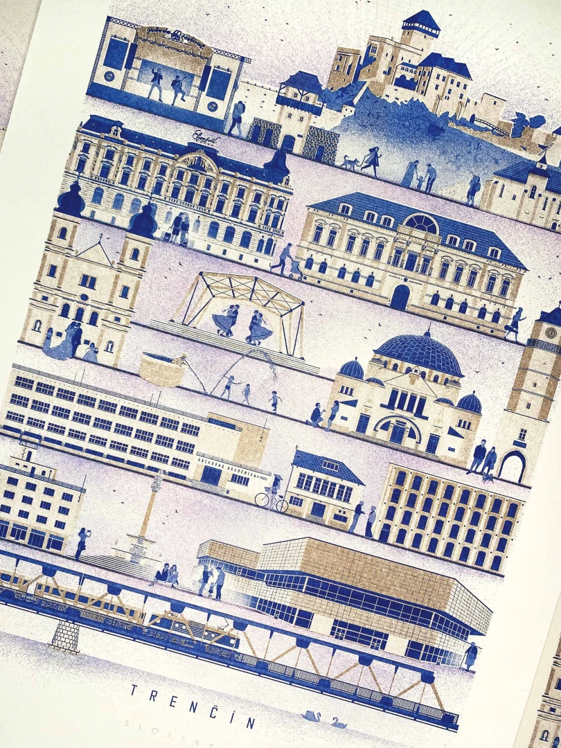 Trenčín alebo Laugaricio je jedno z najstarších slovenských miest. Začiatkom nášho letopočtu až sem siahali hranice Rímskej ríše. Najznámejšou zmienkou prítomnosti Rimanov je pamätný nápis na hradnej skale – oslavujúci víťazstvo cisára Marka Aurélia nad Kvádmi v roku 179. V 11. storočí vzniká v Trenčíne azda jeho najznámejšia pamiatka – Trenčiansky hrad. Kto do Trenčína cestuje kvôli architektúre, prídete si na svoje. Na návštevníkov čaká pestrý prierez históriou a štýlmi – od Kostola narodenia Panny Márie , cez Mestskú vežu, synagógu z roku 1913, zvyšky závodu Merina až po unikátny Dom armády z roku 1985. — Autor textu: Štefan Cipár — Autor printu: Tomáš Ondrášek — Formát printu: A3 — Náklad: limitovaný počet 200ks (Dotlače nebudeme robiť.) — Vytlačené risografom na papier Munken Pure Rough 170g — Maximálne 2ks na 1 objednávku.