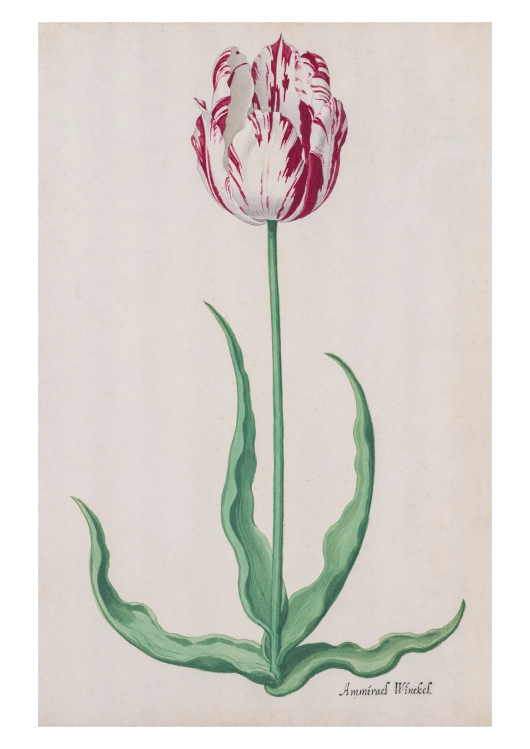 Zobrazený tulipán Ammirael Winckel, pomenovaný po jednej z najväčších pestovateľských rodín tej doby, patril medzi najvzácnejšie odrody. Jeho charakteristické pruhovanie – spôsobené vírusom, ktorý ovplyvňoval pigmentáciu – bolo mimoriadne žiadané a zvyšovalo jeho exkluzivitu. Takéto ilustrácie slúžili ako súčasť tzv. tulip books – ilustrovaných katalógov, ktoré boli dôležitým marketingovým nástrojom v období, keď sa s tulipánmi obchodovalo ako s luxusným artiklom.
