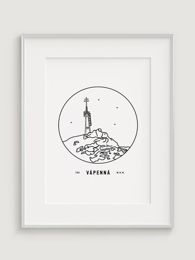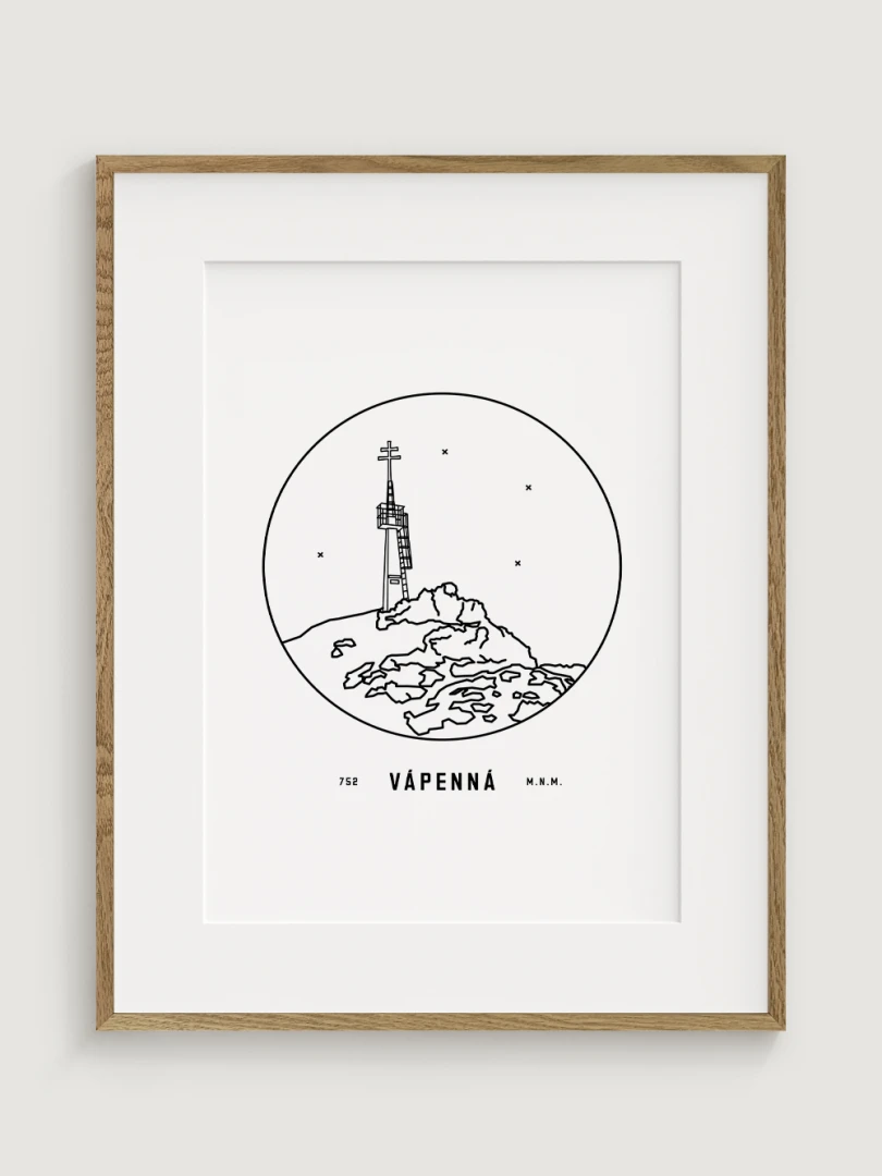 Vápenná je znázornená v detailnej kruhovej vinete s uvedením jeho názvu a nadmorskej výšky, čo vytvára jedinečný a estetický doplnok pre milovníkov prírody a hôr. Tento print je ideálnym darčekom pre tých, ktorí si chcú domov priniesť kúsok slovenskej krajiny a majestátnosť jej vrcholov.