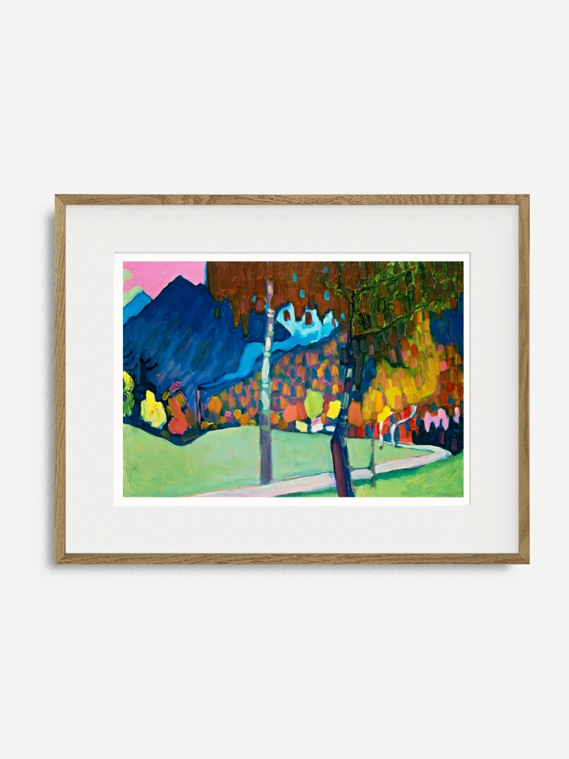 Tento výtvarný print Jesenná štúdia v Oberau z roku 1908 vznikol počas pobytu Wassilyho Kandinského v bavorskej obci Murnau a jej okolí. Ide o štúdiu krajiny, v ktorej autor pracuje s výraznou farebnosťou a zjednodušenými tvarmi, no stále zachováva čitateľný motív prírody. Domy, stromy a terén sú redukované na farebné plochy a línie, ktoré vytvárajú jasný rytmus kompozície.