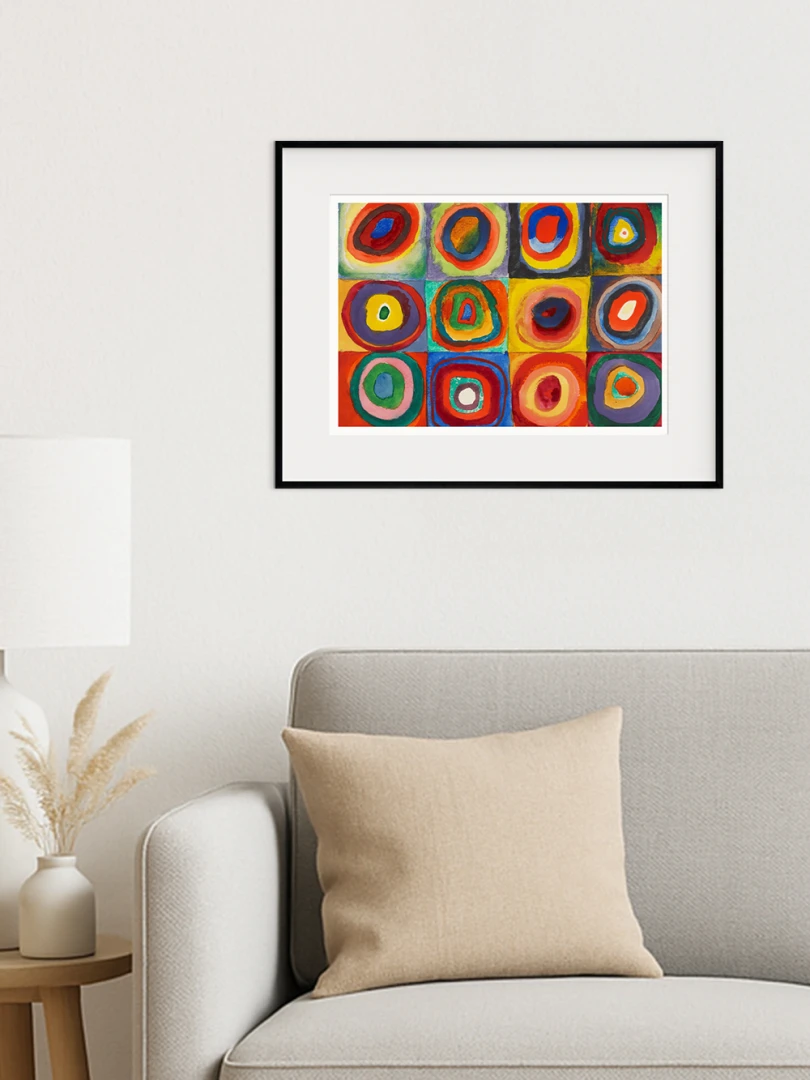 Dielo jasne ukazuje Kandinského presvedčenie, že farba pôsobí nezávisle od tvaru a že jej význam sa mení v závislosti od kontextu. Print pôsobí racionálne aj hravo zároveň. Vhodný je do pracovne, ateliéru alebo moderného interiéru, kde podporí vizuálne myslenie, cit pre farbu a sústredenie.