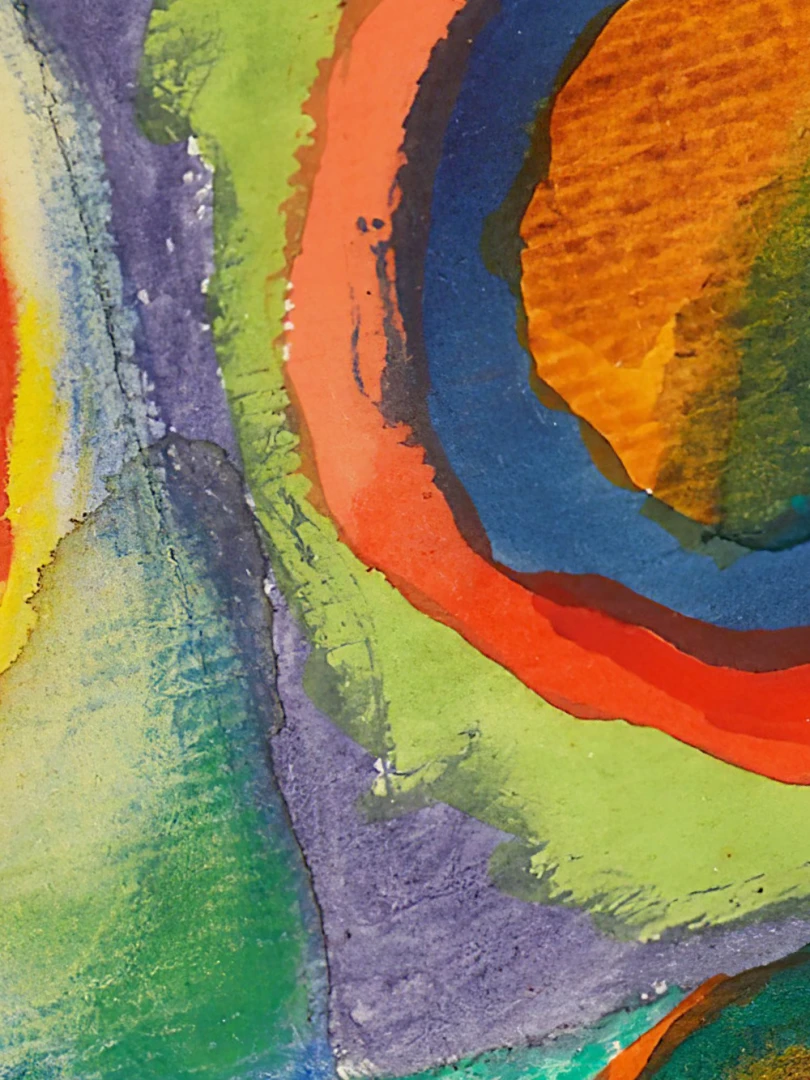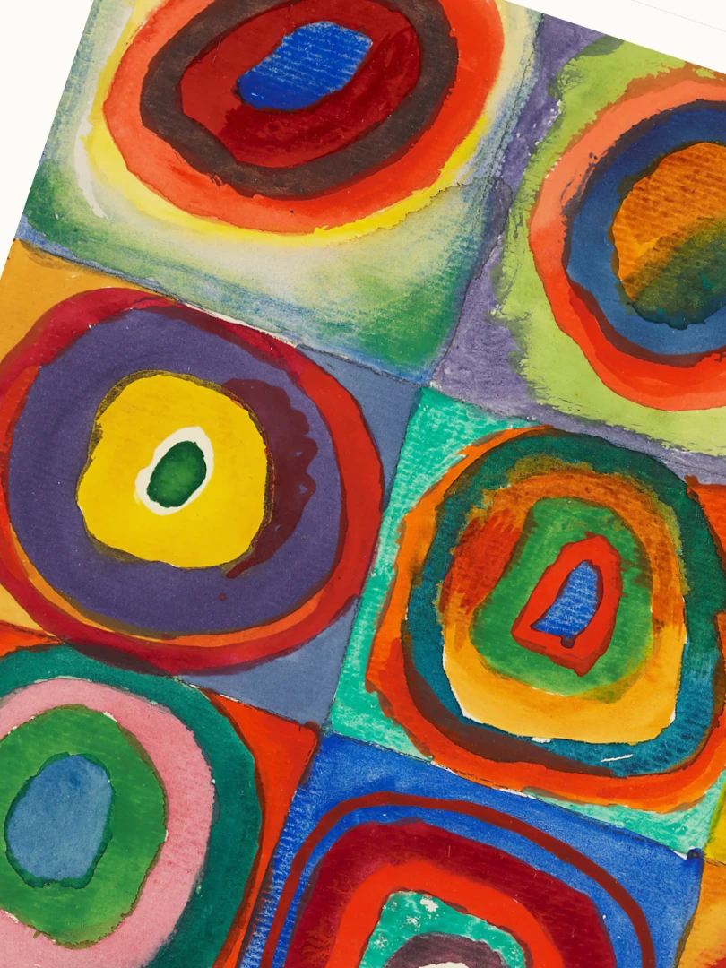 Tento výtvarný print Štúdia farieb: Štvorce s koncentrickými kruhmi z roku 1913 patrí medzi kľúčové didaktické diela Wassilyho Kandinského. Vznikol v období jeho pedagogickej a teoretickej práce a slúžil ako vizuálna analýza vzťahov medzi farbami. Rovnaký kruh je opakovane zasadený do rôznych farebných polí, čím sa mení jeho vnímanie, intenzita a emocionálny účinok.