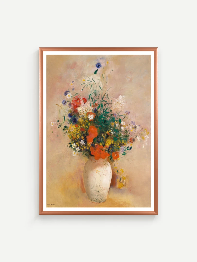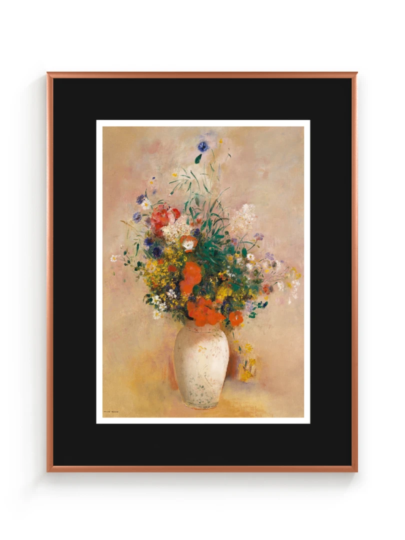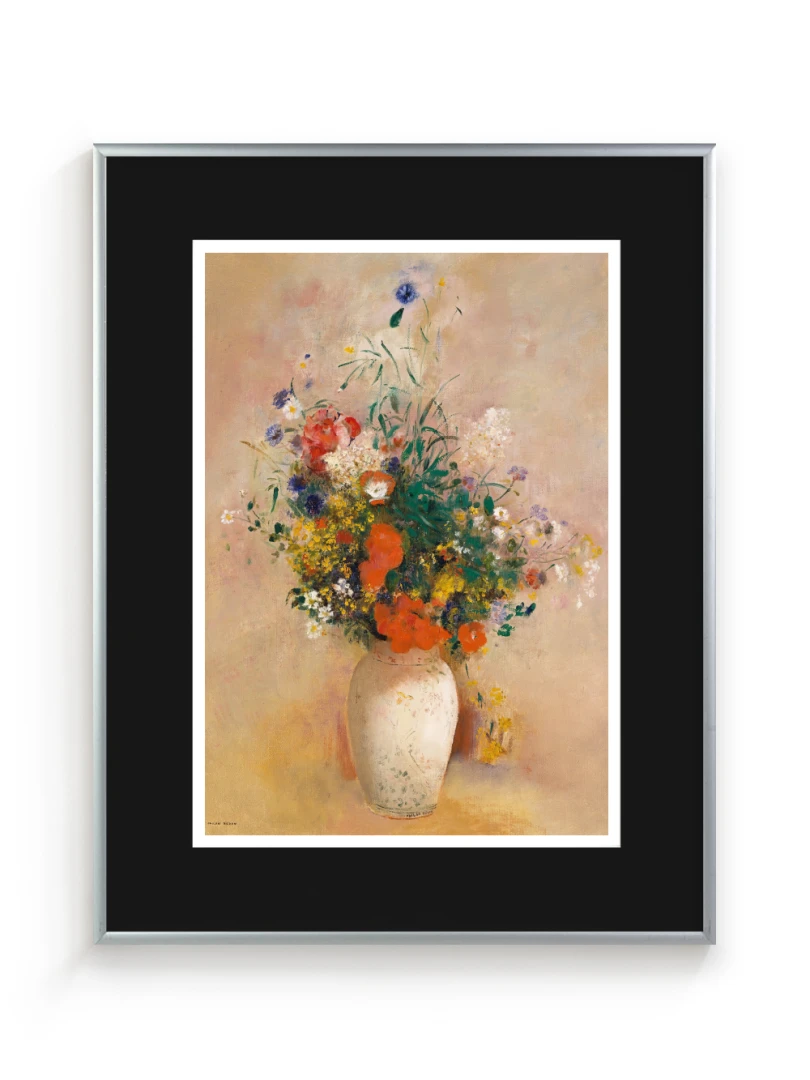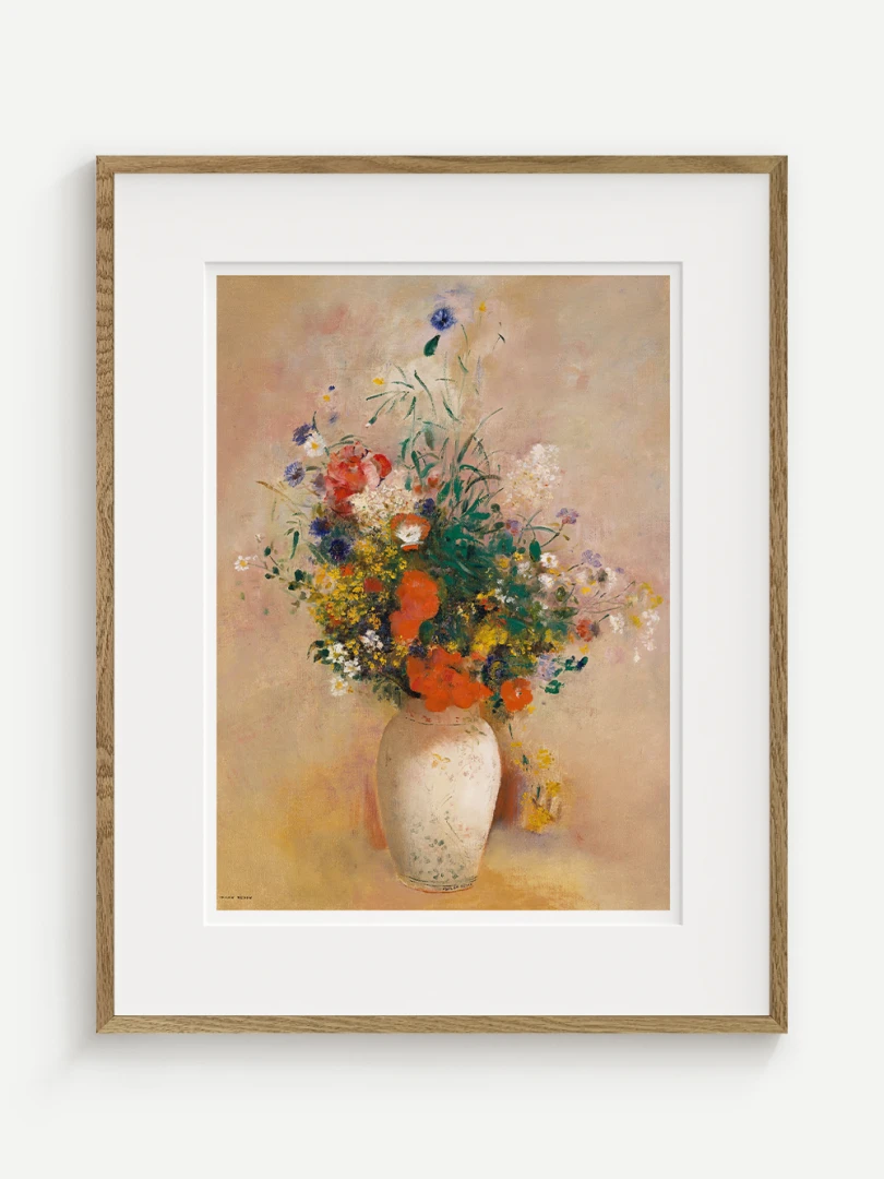 Tento print vychádza z obrazu Váza s kvetinami (Vase of Flowers), ktorý v roku 1905 vytvoril francúzsky symbolistický maliar Odilon Redon. Dielo zobrazuje kyticu pestrých kvetov v jednoduchej váze, pričom kompozícia a farebnosť vytvárajú dojem snovej atmosféry. Redon, známy svojimi dielami plnými fantázie a symboliky, tu využíva sýte farby a jemné línie.