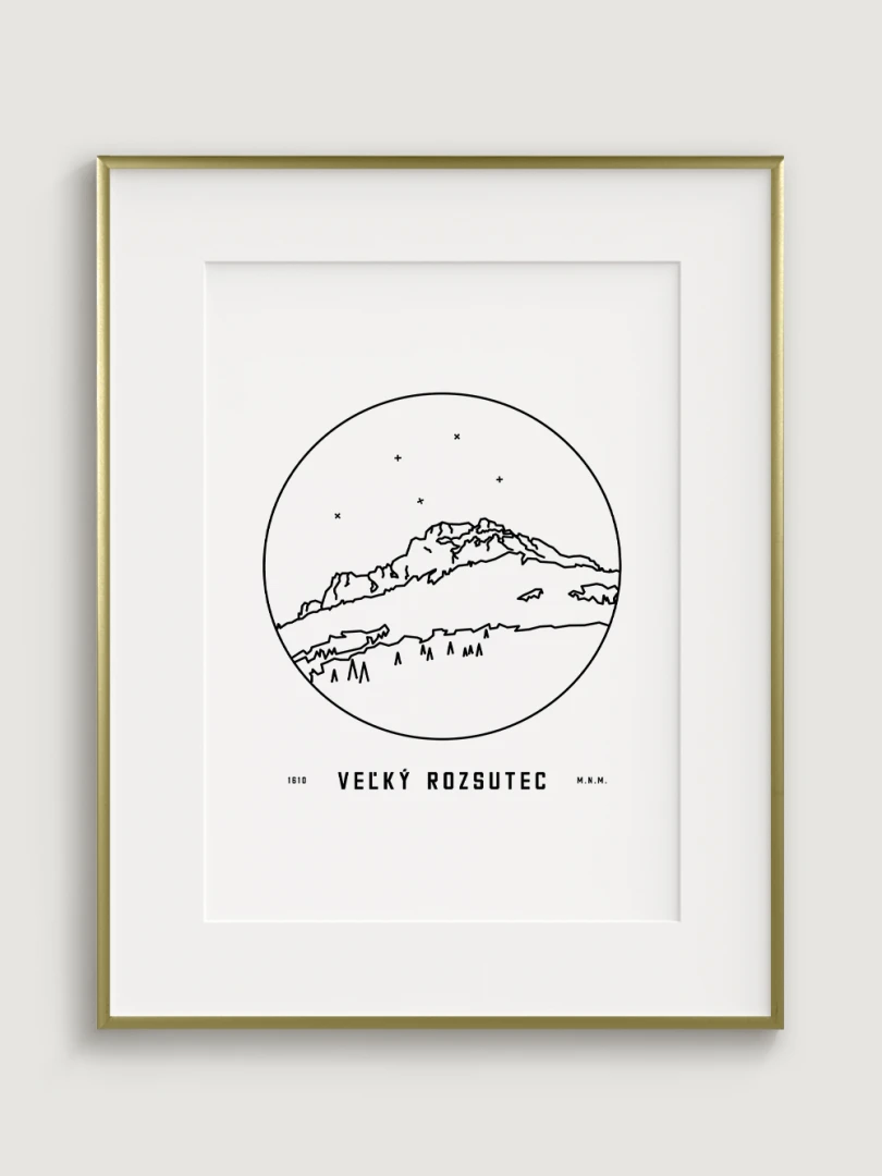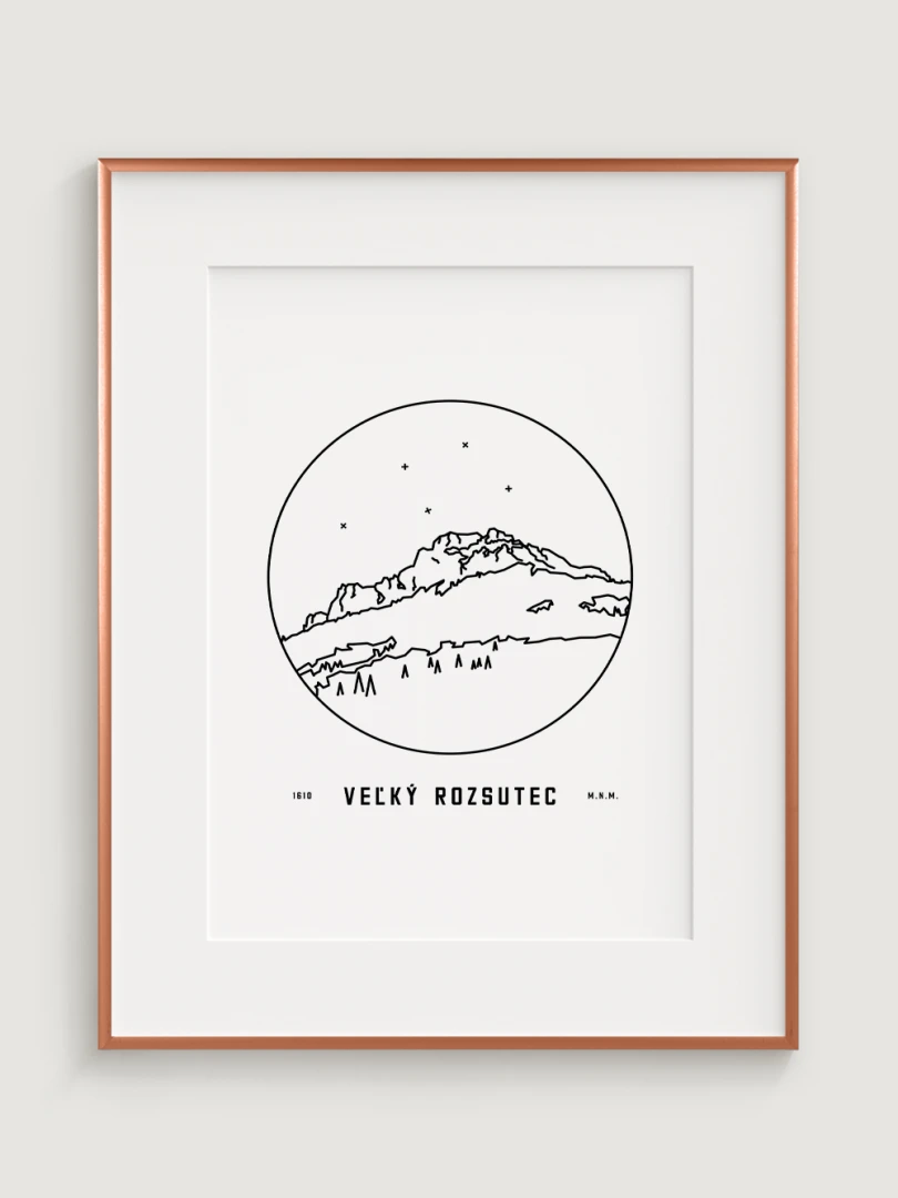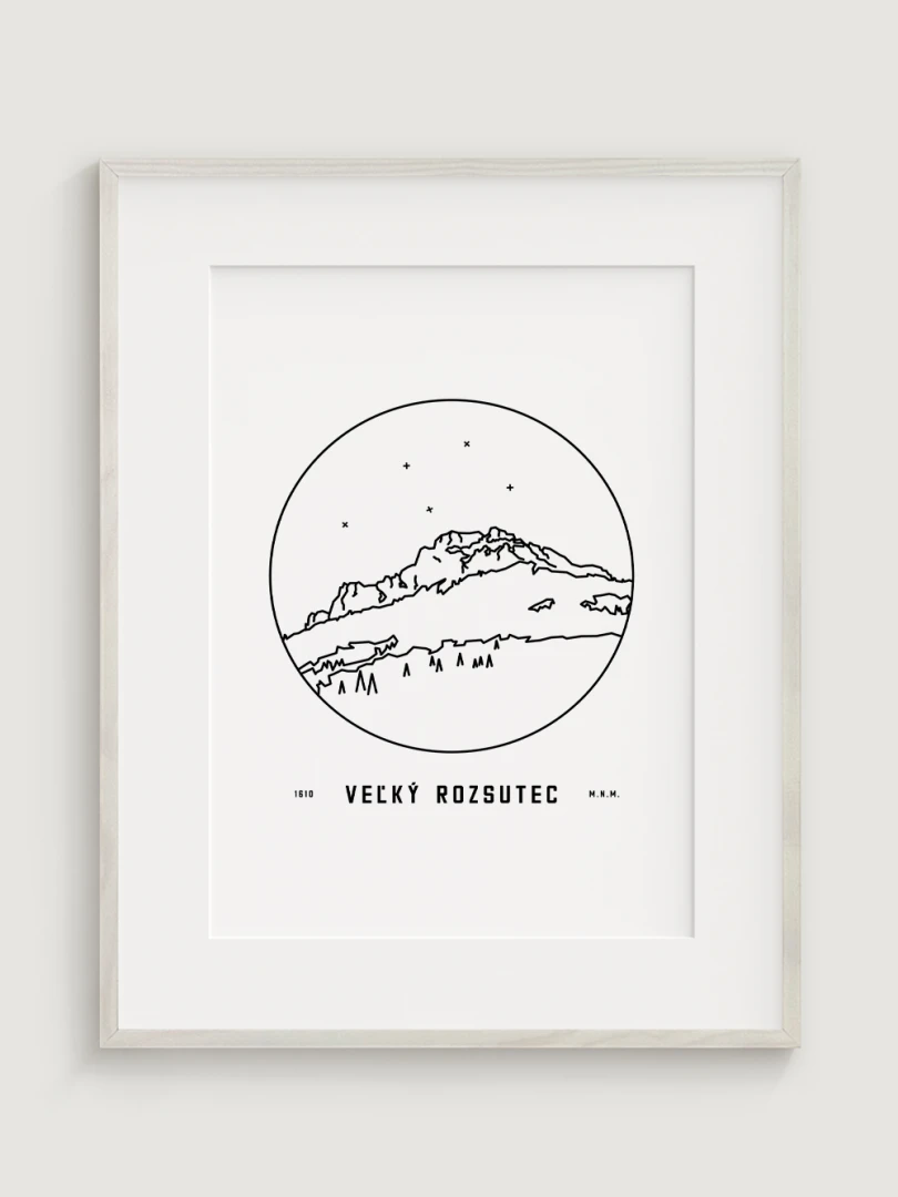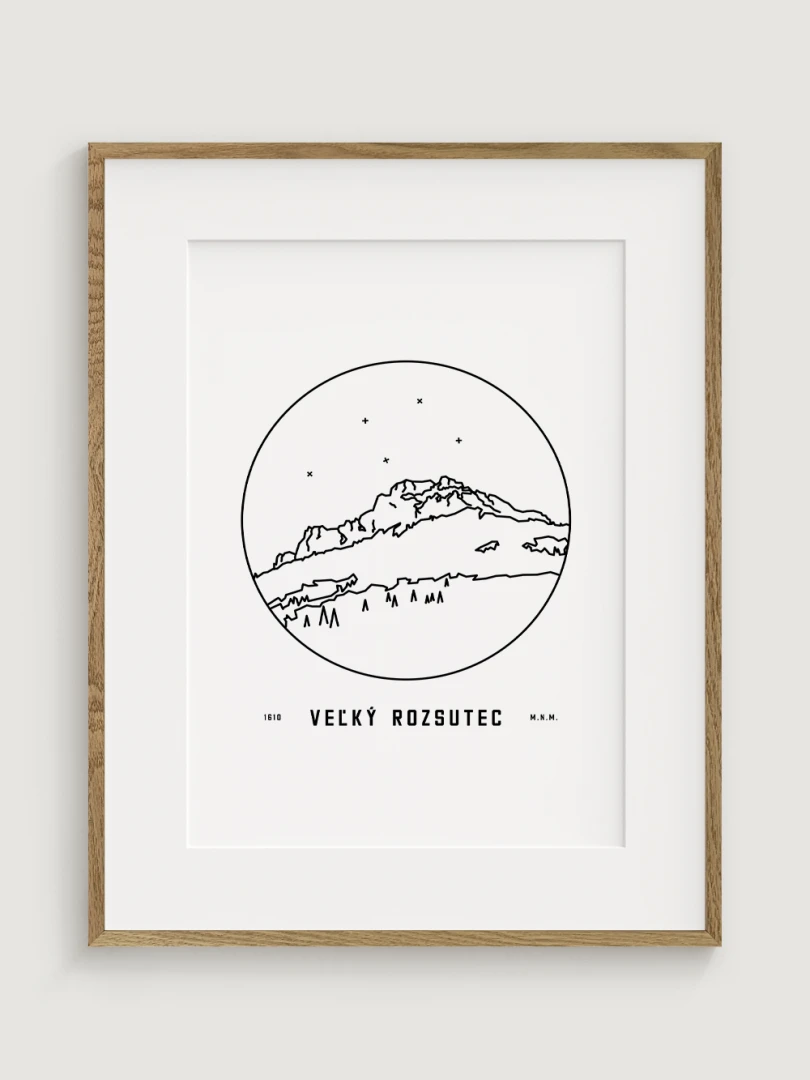 Veľky Rozsutec je znázornený v detailnej kruhovej vinete s uvedením jeho názvu a nadmorskej výšky, čo vytvára jedinečný a estetický doplnok pre milovníkov prírody a hôr. Tento print je ideálnym darčekom pre tých, ktorí si chcú domov priniesť kúsok slovenskej krajiny a majestátnosť jej vrcholov.