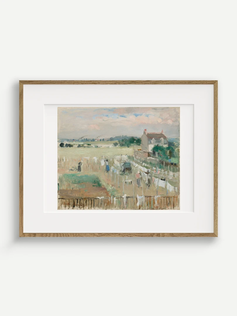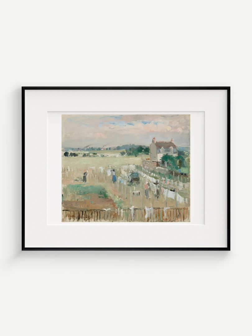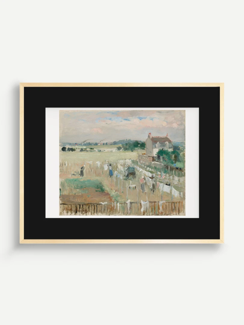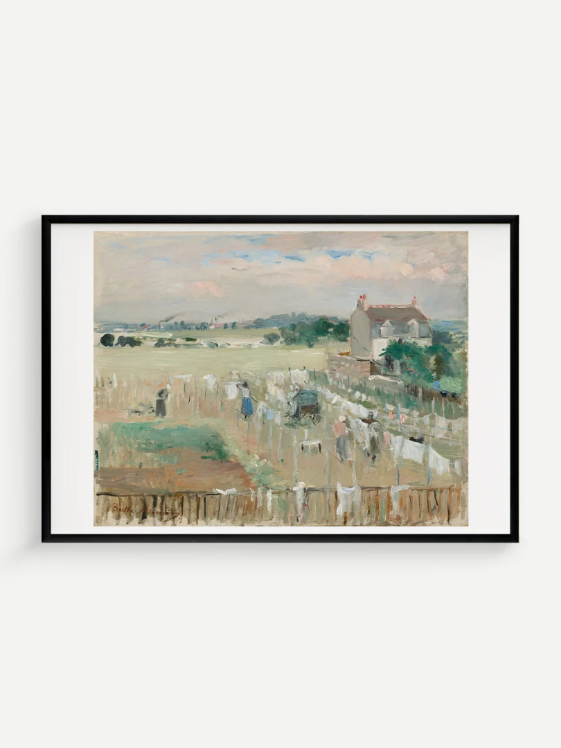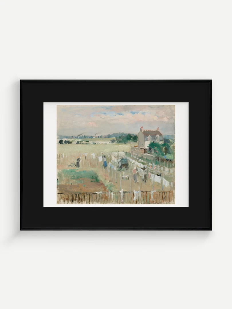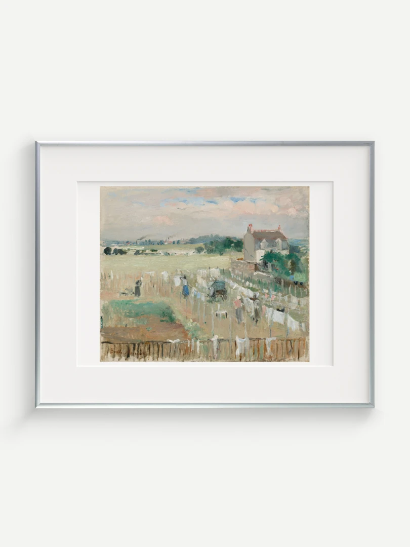 Tento nádherný umelecký print zachytáva bežný každodenný okamih, ktorý Berthe Morisot pretvorila na scénu plnú svetla a pohybu. Dielo „Vešanie prádla“ patrí medzi jej najikonickejšie maľby a dokonale vystihuje impresionistický štýl, kde dominuje hra svetla, voľné štetecné ťahy a prirodzená atmosféra.