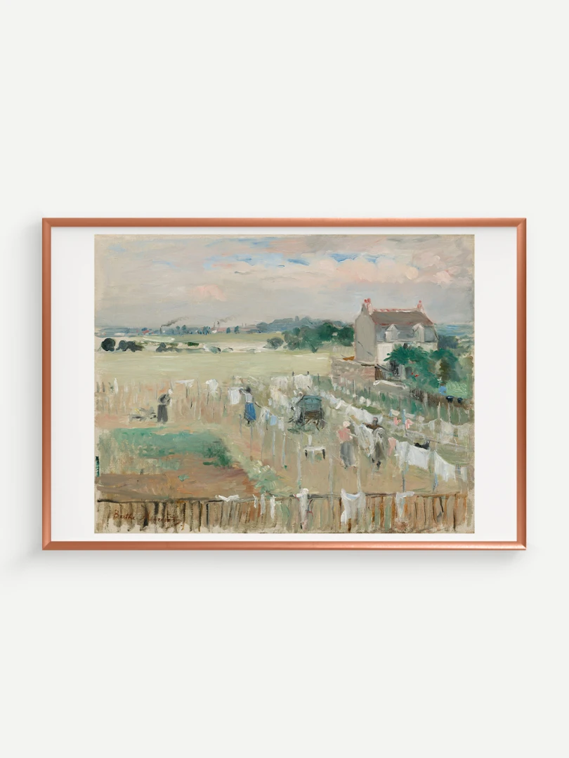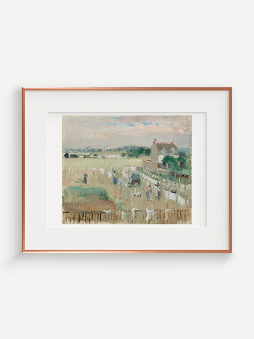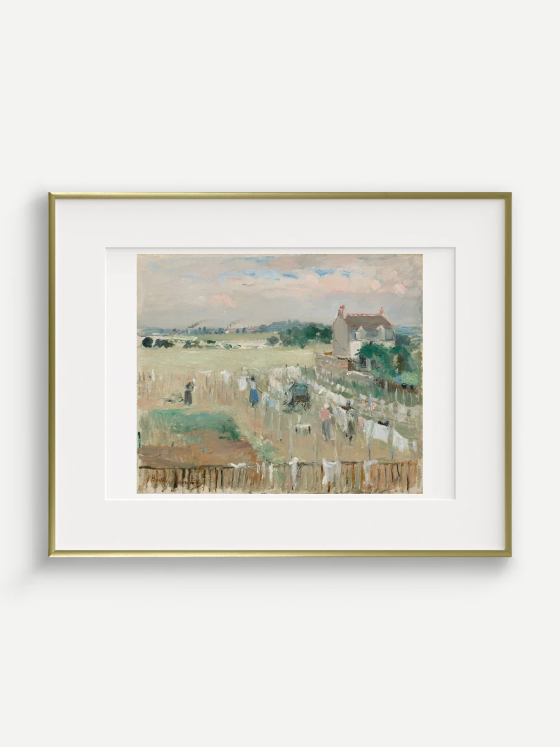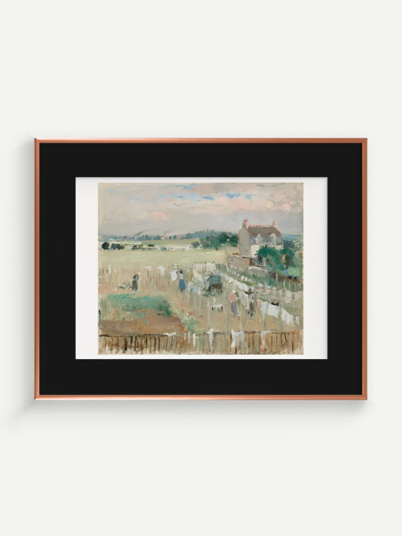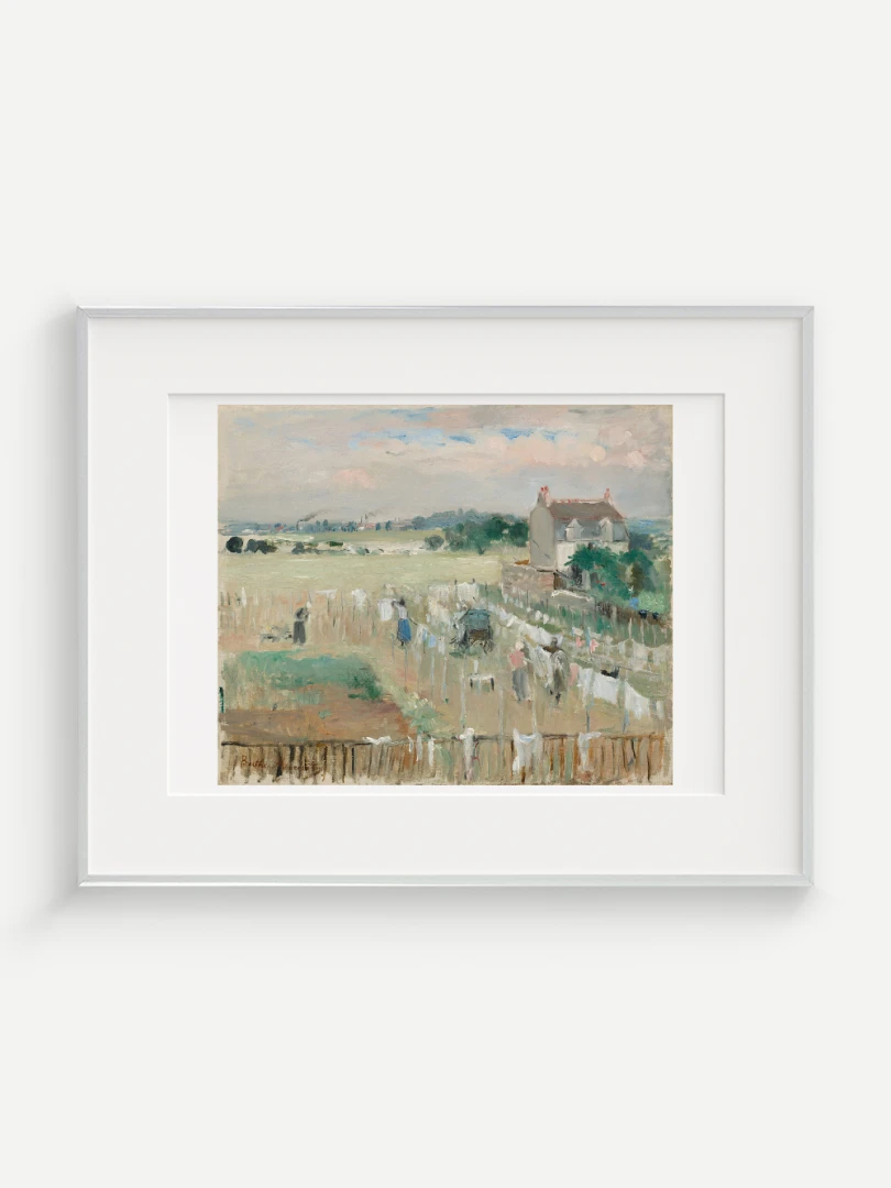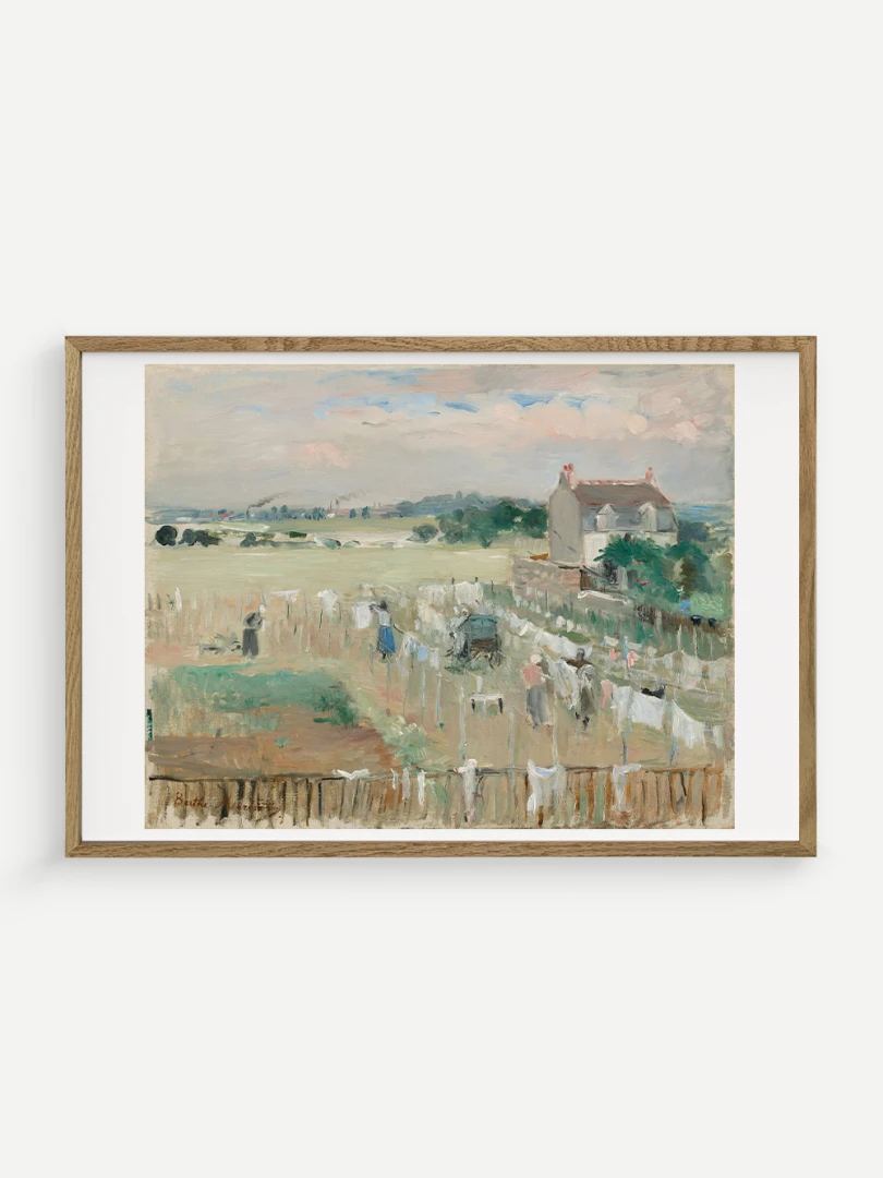 Tento nádherný umelecký print zachytáva bežný každodenný okamih, ktorý Berthe Morisot pretvorila na scénu plnú svetla a pohybu. Dielo „Vešanie prádla“ patrí medzi jej najikonickejšie maľby a dokonale vystihuje impresionistický štýl, kde dominuje hra svetla, voľné štetecné ťahy a prirodzená atmosféra.