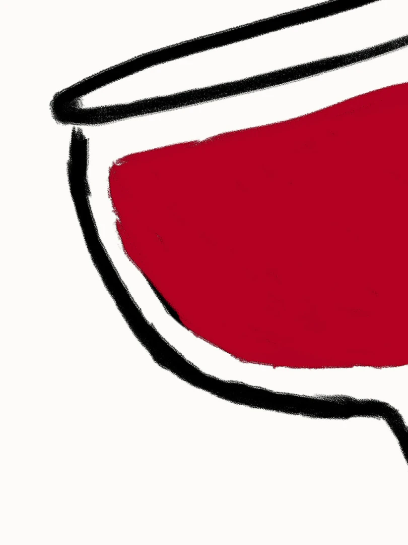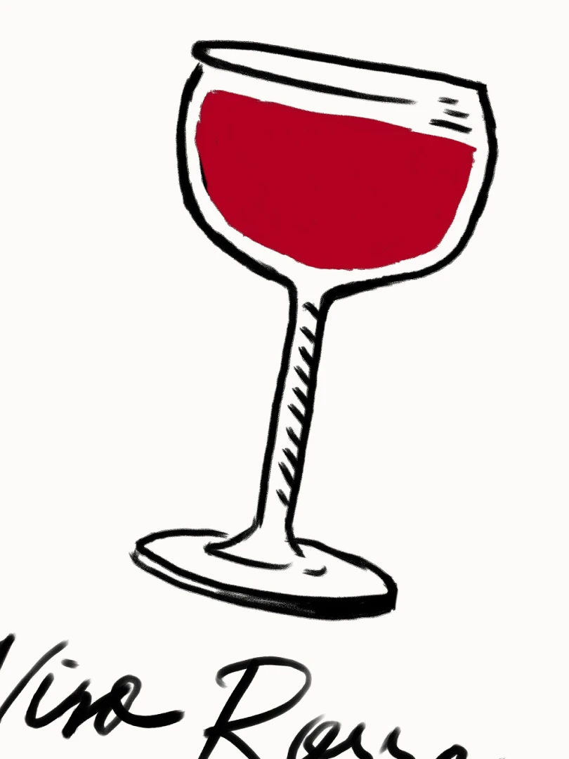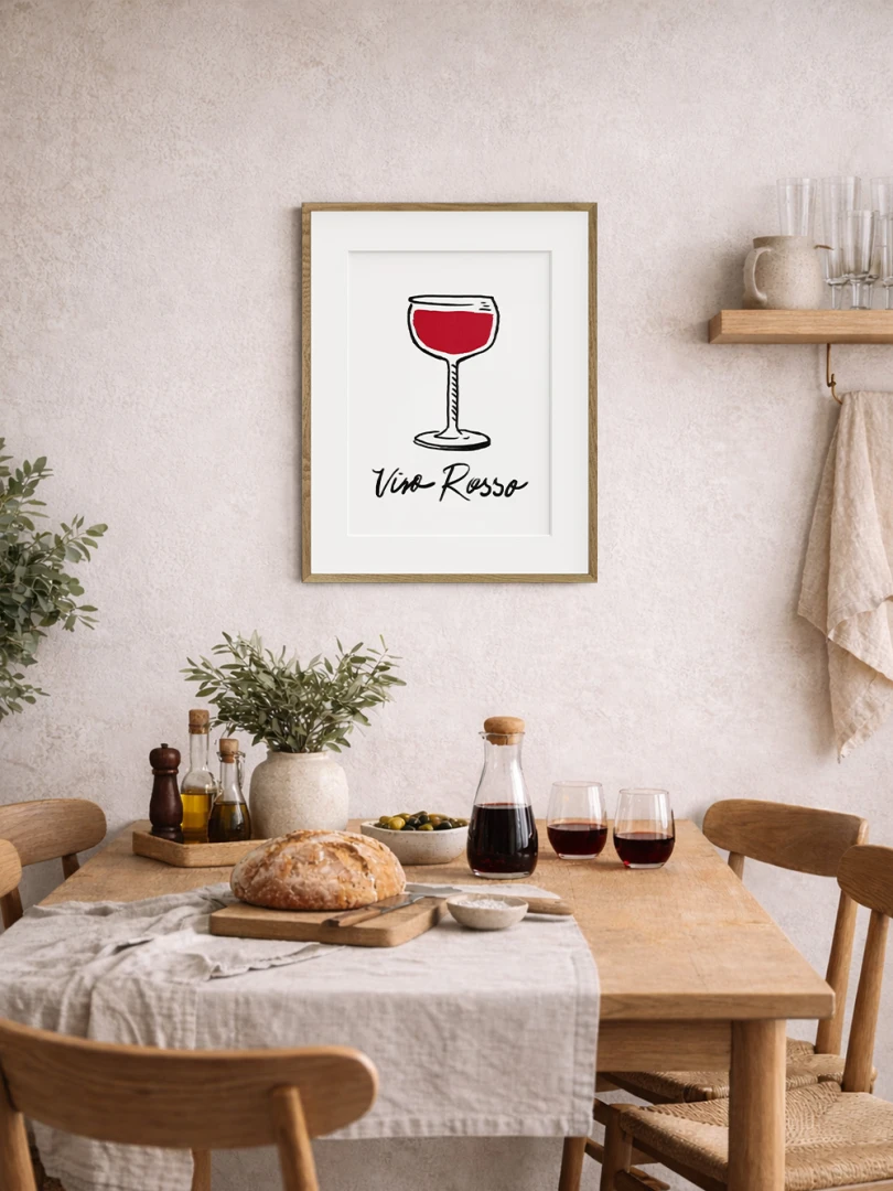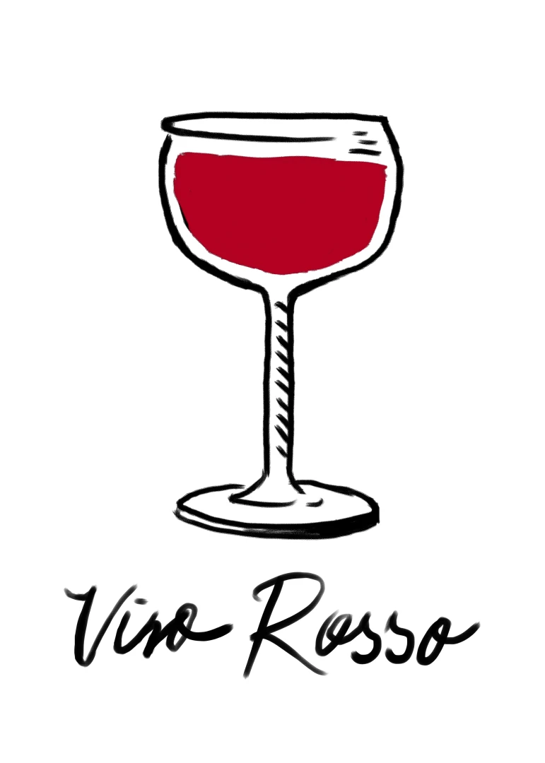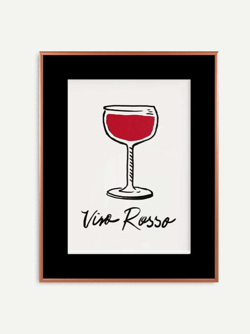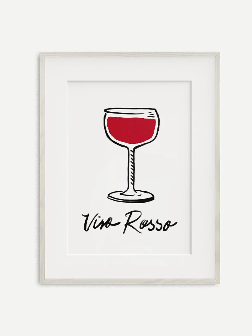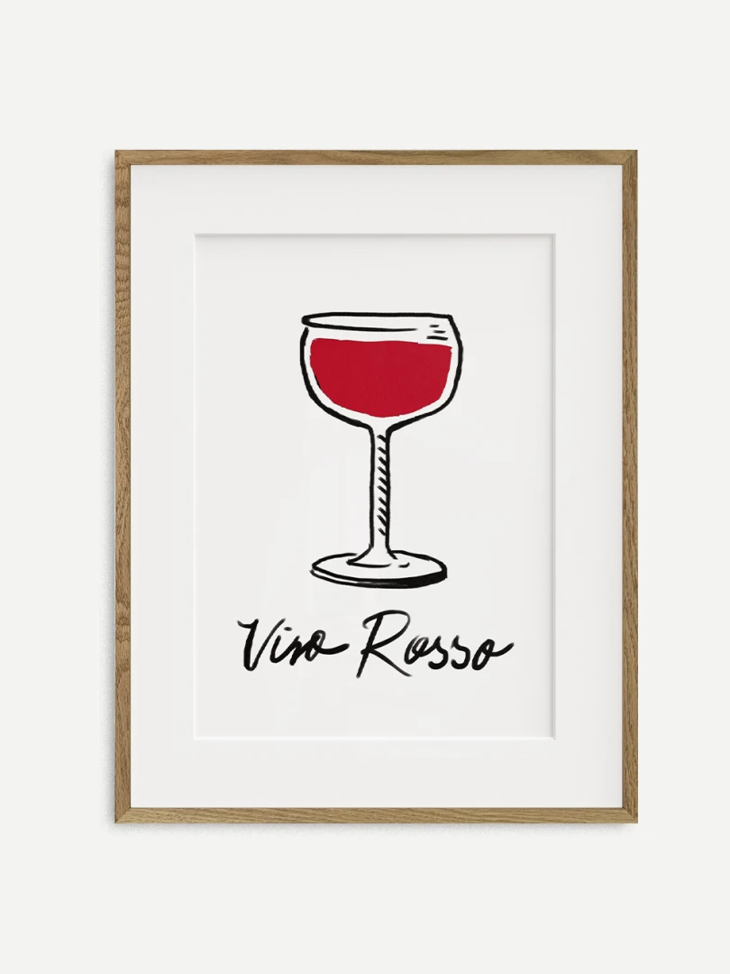 Tento print zobrazuje pohár vína v jednoduchej líniovej ilustrácii doplnenej výraznou červenou plochou. Motív je čistý, priamy a ľahko čitateľný. Nápis Vino Rosso pod kresbou dodáva kompozícii uvoľnený, mierne hravý charakter. Minimalistické spracovanie a obmedzená farebnosť vytvárajú silný vizuálny akcent bez zbytočných detailov. Ilustrácia pôsobí moderne a zároveň odkazuje na atmosféru talianskych večerov a jednoduchých pôžitkov.