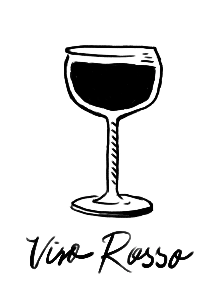 Tento print zobrazuje pohár vína v jednoduchej líniovej ilustrácii doplnenej výraznou čiernou plochou. Motív je čistý, priamy a ľahko čitateľný. Nápis Vino Rosso pod kresbou dodáva kompozícii uvoľnený, mierne hravý charakter. Minimalistické spracovanie a obmedzená farebnosť vytvárajú silný vizuálny akcent bez zbytočných detailov. Ilustrácia pôsobí moderne a zároveň odkazuje na atmosféru talianskych večerov a jednoduchých pôžitkov.