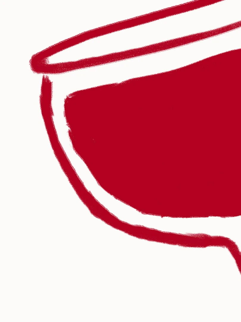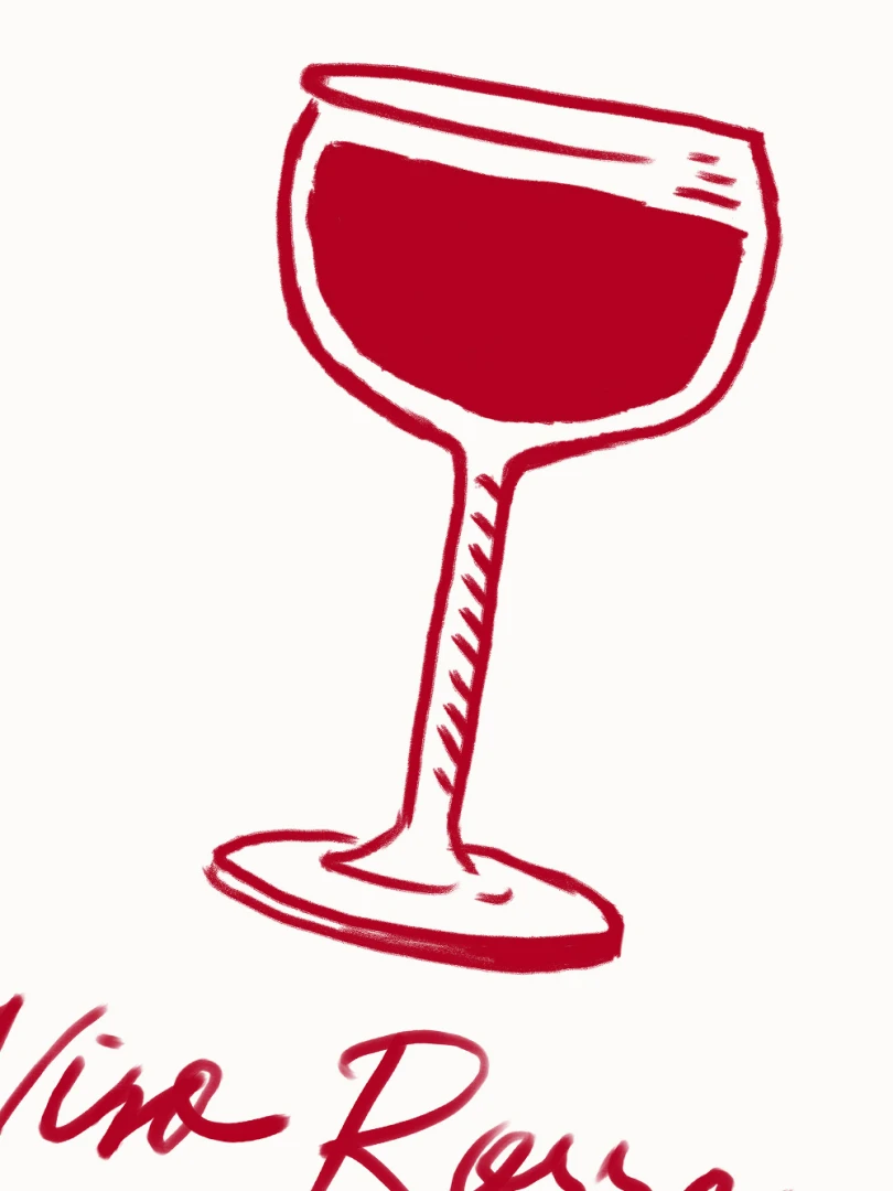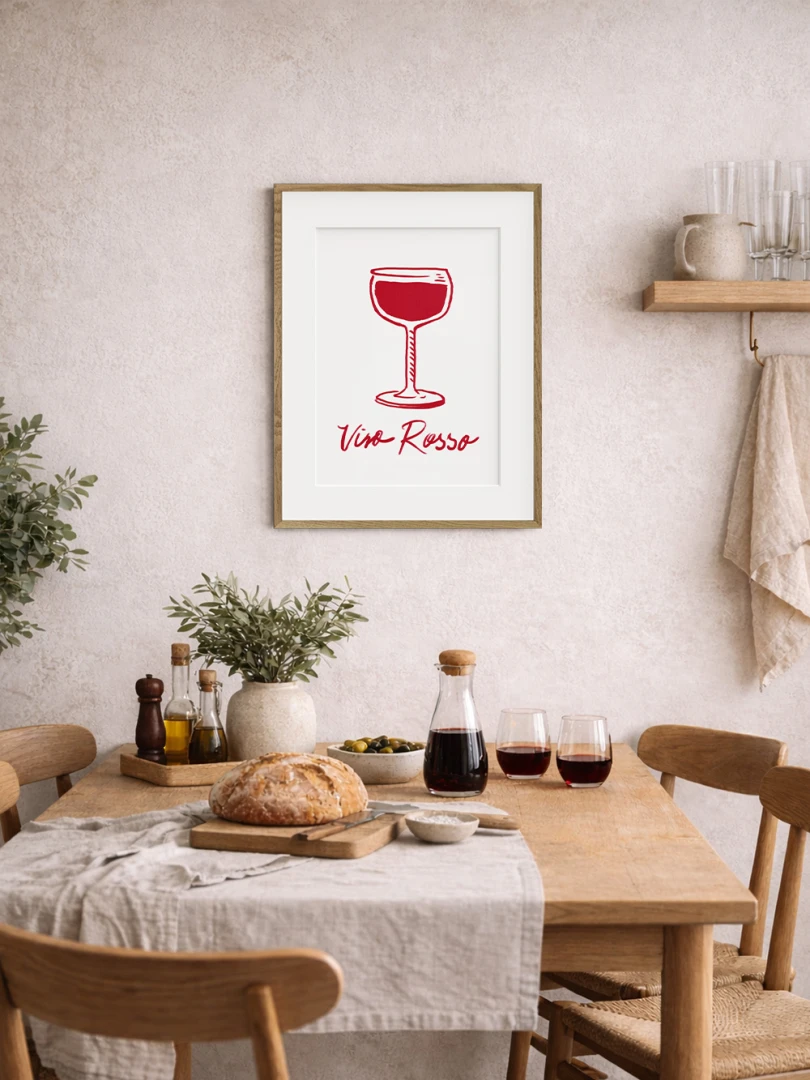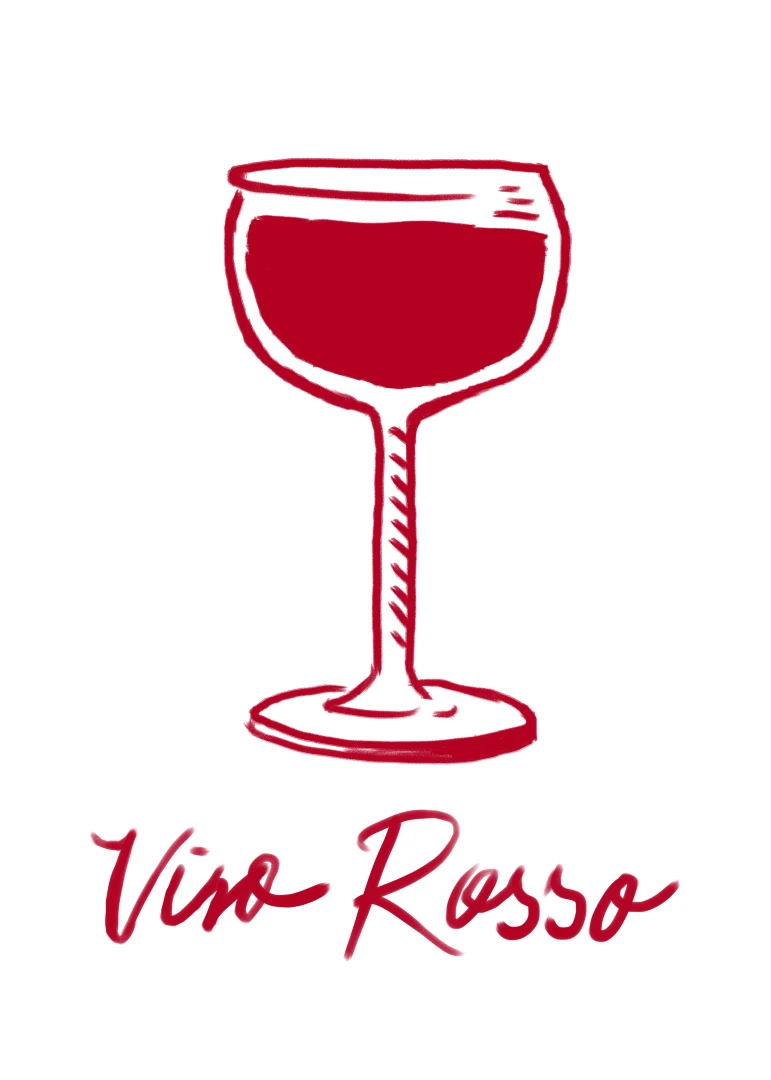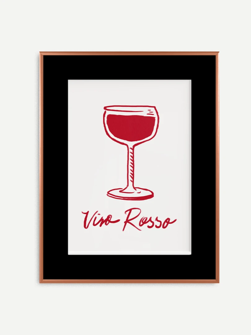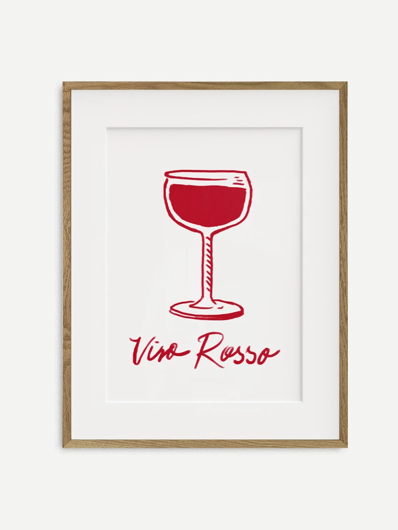 Tento print zobrazuje pohár červeného vína v jednoduchej líniovej ilustrácii doplnenej výraznou červenou plochou. Motív je čistý, priamy a ľahko čitateľný. Nápis Vino Rosso pod kresbou dodáva kompozícii uvoľnený, mierne hravý charakter. Minimalistické spracovanie a obmedzená farebnosť vytvárajú silný vizuálny akcent bez zbytočných detailov. Ilustrácia pôsobí moderne a zároveň odkazuje na atmosféru talianskych večerov a jednoduchých pôžitkov.