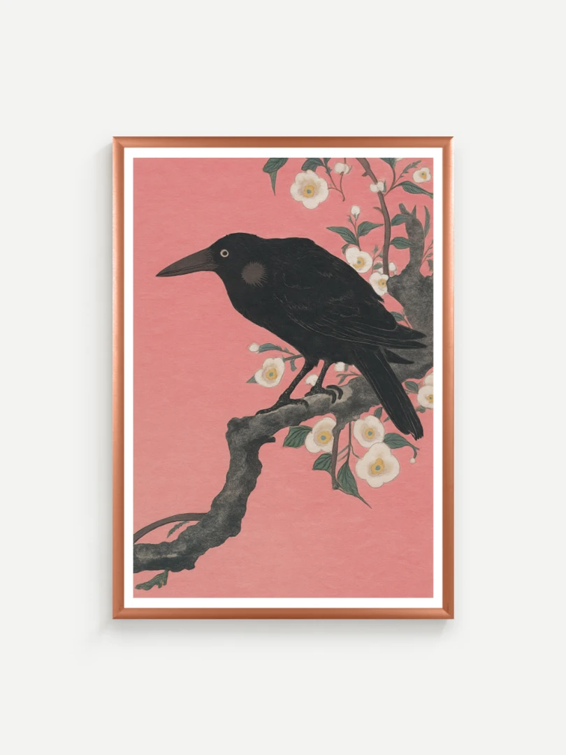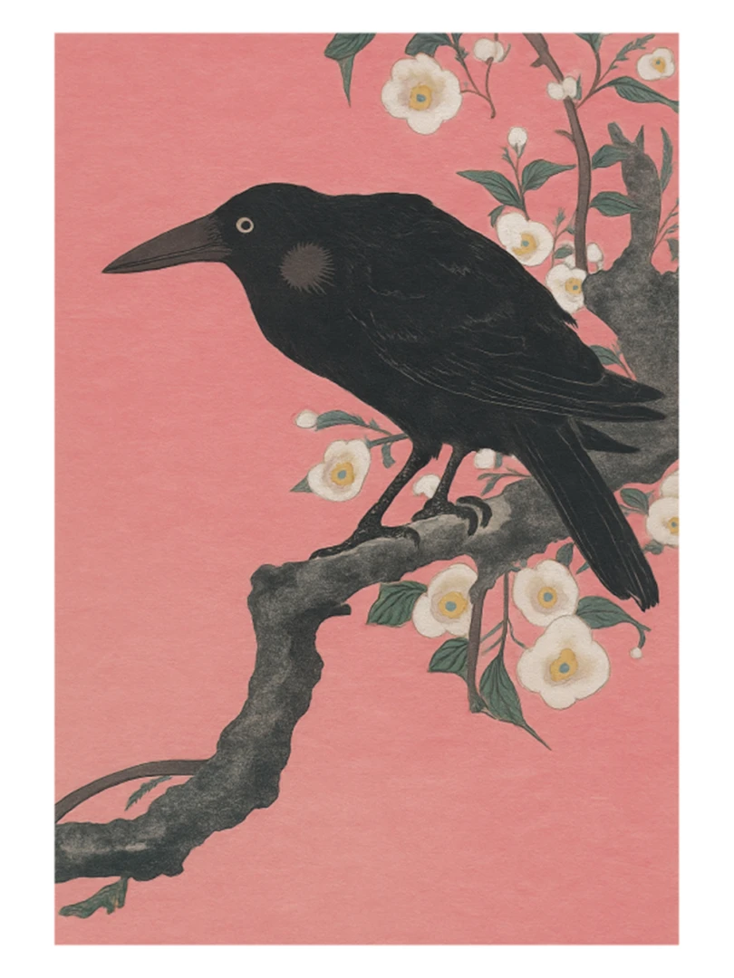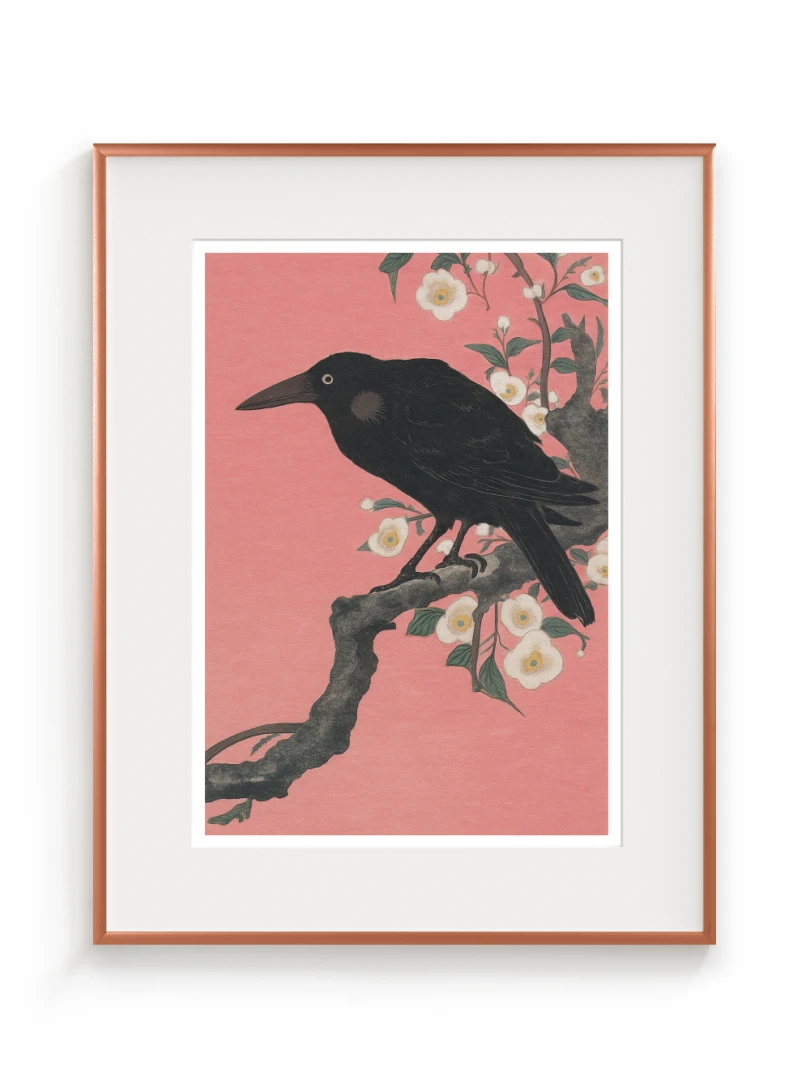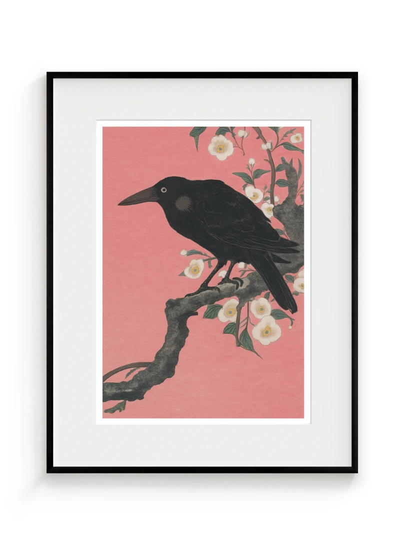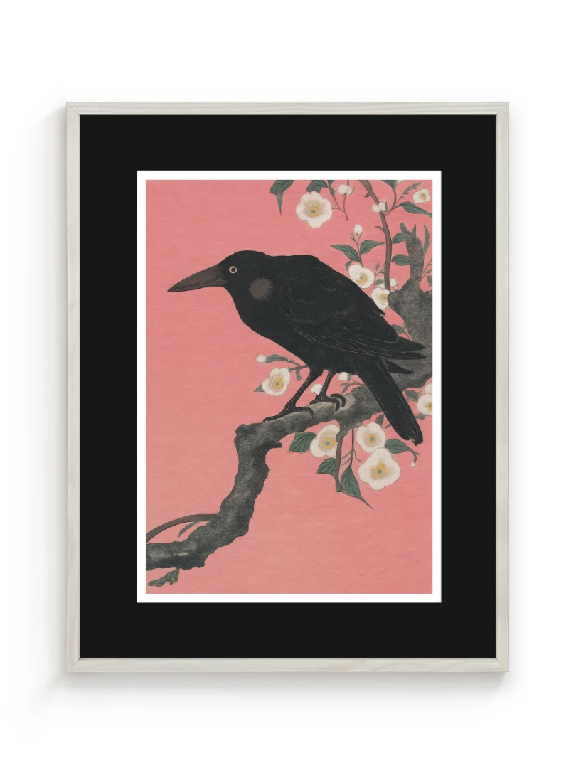 Print vychádza z pôvodného japonského drevorytu Crow on a Cherry Branch (Vrana na Čerešňoveh vetve) ktor vytvoril Ohara Koson.