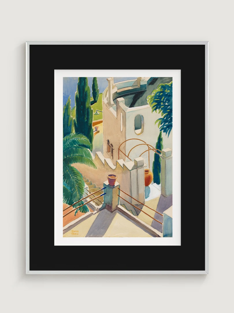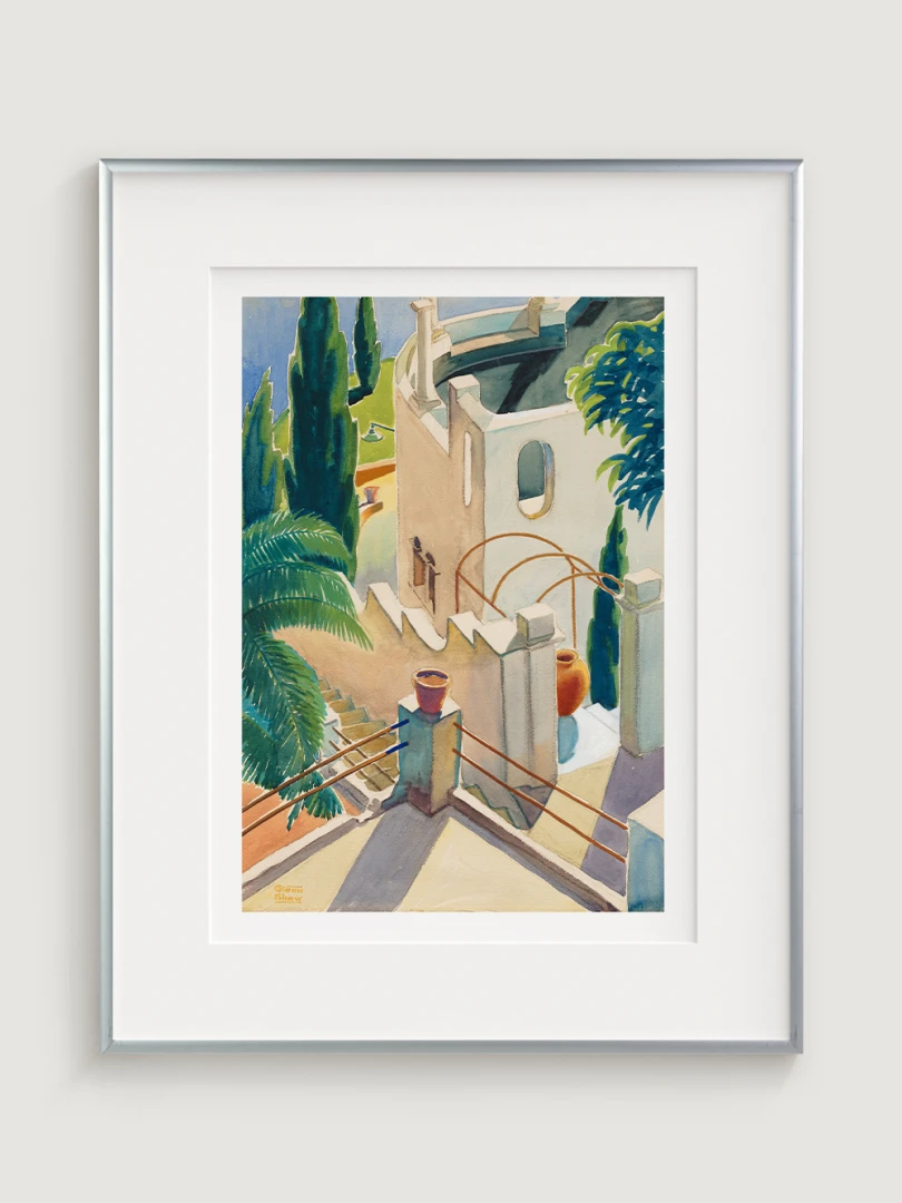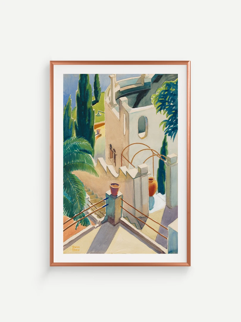 Tento print zachytáva scénu z obrazu Z nášho balkóna (From Our Balcony), ktorý americký umelec Glenn Moore Shaw namaľoval v roku 1928. Dielo pôsobí intímne a zároveň otvorene – cez jemné kovové zábradlie balkóna sa pred nami rozprestiera výhľad na pokojné ulice lemované palmami, ktoré okamžite evokujú južnú, prímorskú atmosféru. V kombinácii s teplým svetlom a tlmenými tónmi pôsobí obraz takmer tropicky – akoby zachytával neskoré popoludnie v tichej, slnkom prehriatej štvrti.