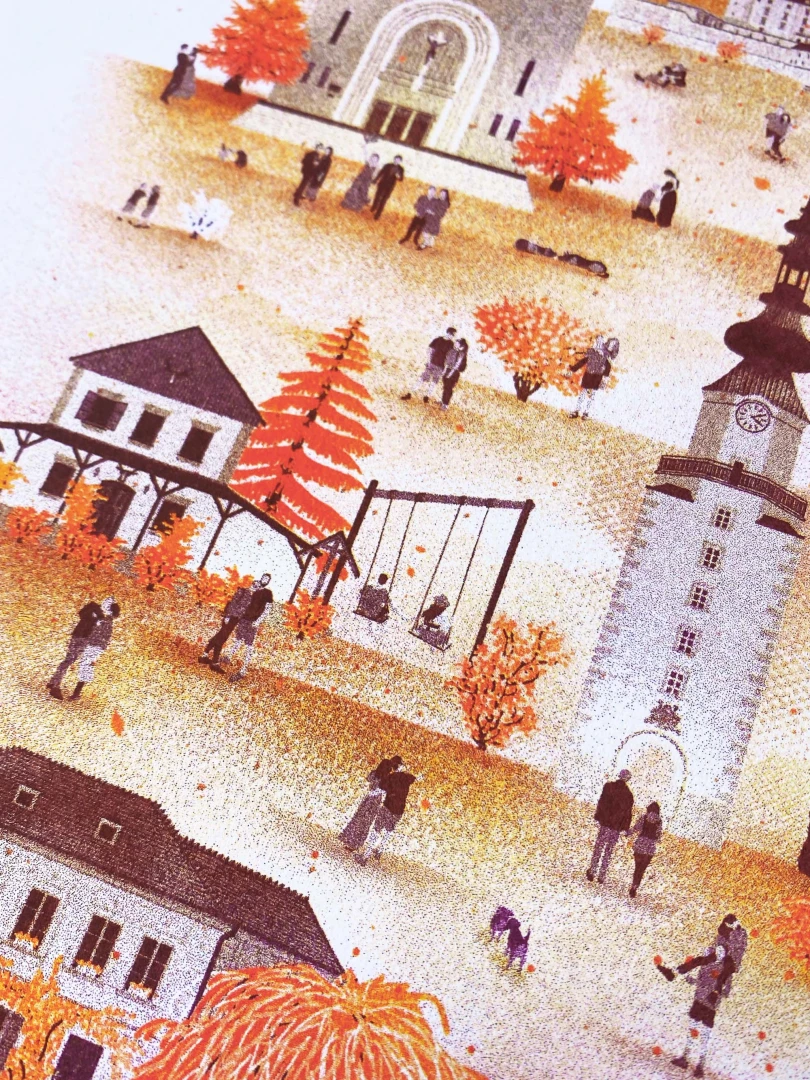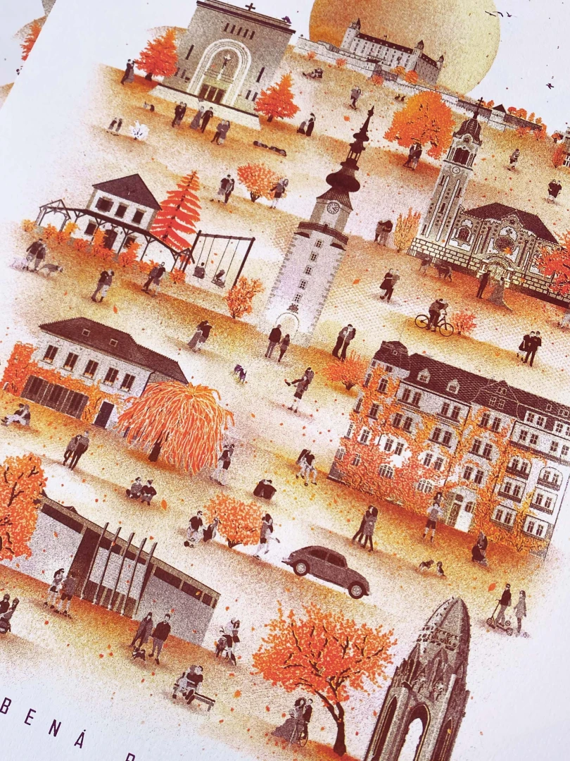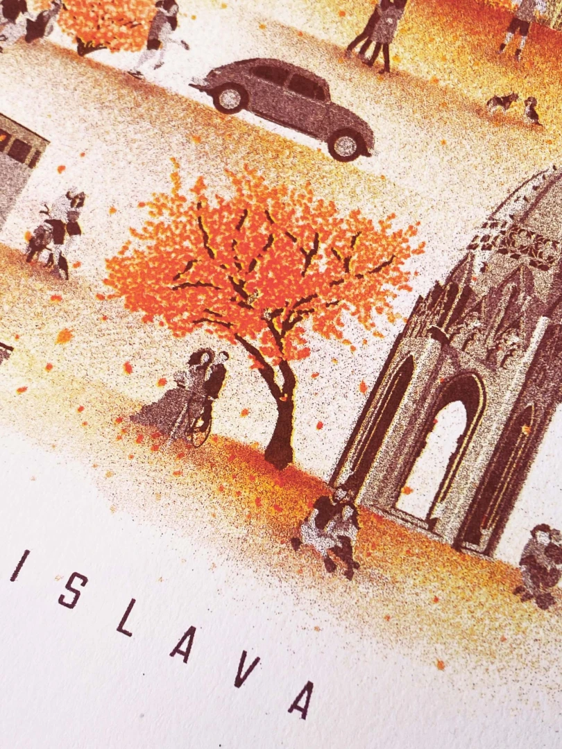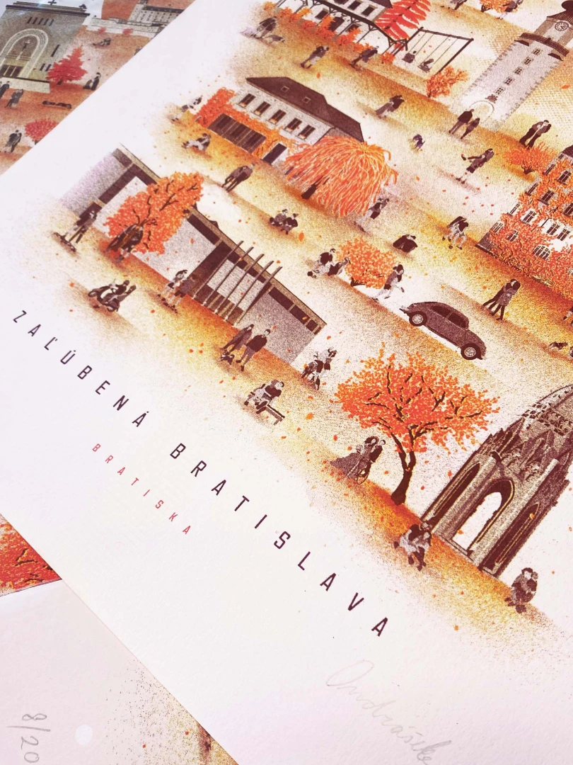 Hovorí sa, že láska je slepá, ale predsa zaľúbení vždy preferujú isté miesta viac. Bratislava nie je výnimkou a láska tu možno aj ľutuje, že je slepá, pretože by v našom meste nevedela, ktoré miesto skôr navštíviť – toľko krásy je v ponuke. Či už sú to prechádzky v štvrti okolo Modrého kostolíka a brečtanom zahaleného domu na Klemensovej alebo Kalvária, Horský park a Slavín, všetky tieto miesta majú tú správnu atmosféru. Na pravej strane Dunaja na zaľúbených čaká tieň gotickej veže z františkánskeho kostola v Sade Janka Kráľa alebo súkromie Danubiany v zajatí rieky. V Bratislave je jednoduché sa zamilovať – ešte aj mesto totiž hrá v prospech lásky. — Autor textu: Štefan Cipár — Autor printu: Tomáš Ondrášek — Grafická spolupráca: Jozef Mnich, Marek Ciesarík — Formát printu: A3 — Náklad: limitovaný počet 200ks (Dotlače nebudeme robiť.) — Vytlačené risografom na papier Munken Pure Rough 170g. — Maximálne 2ks na 1 objednávku.