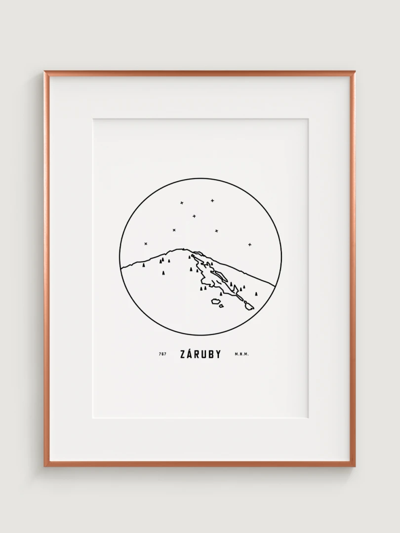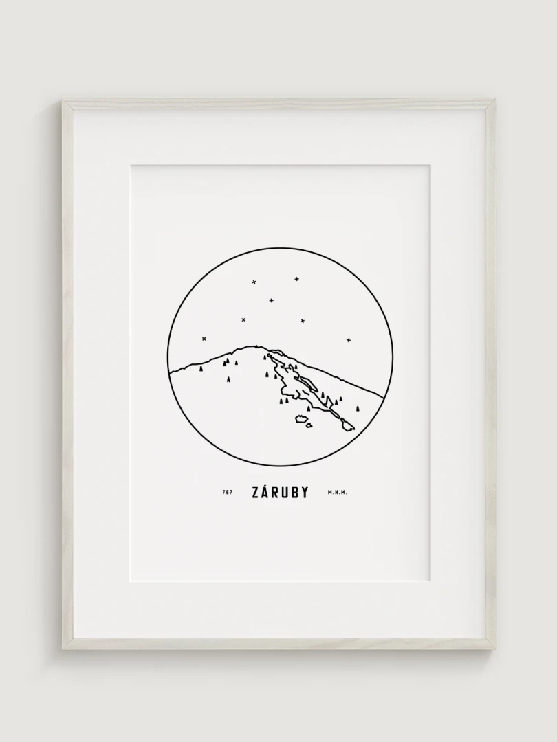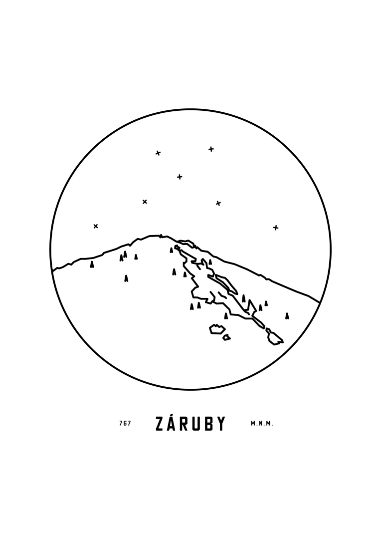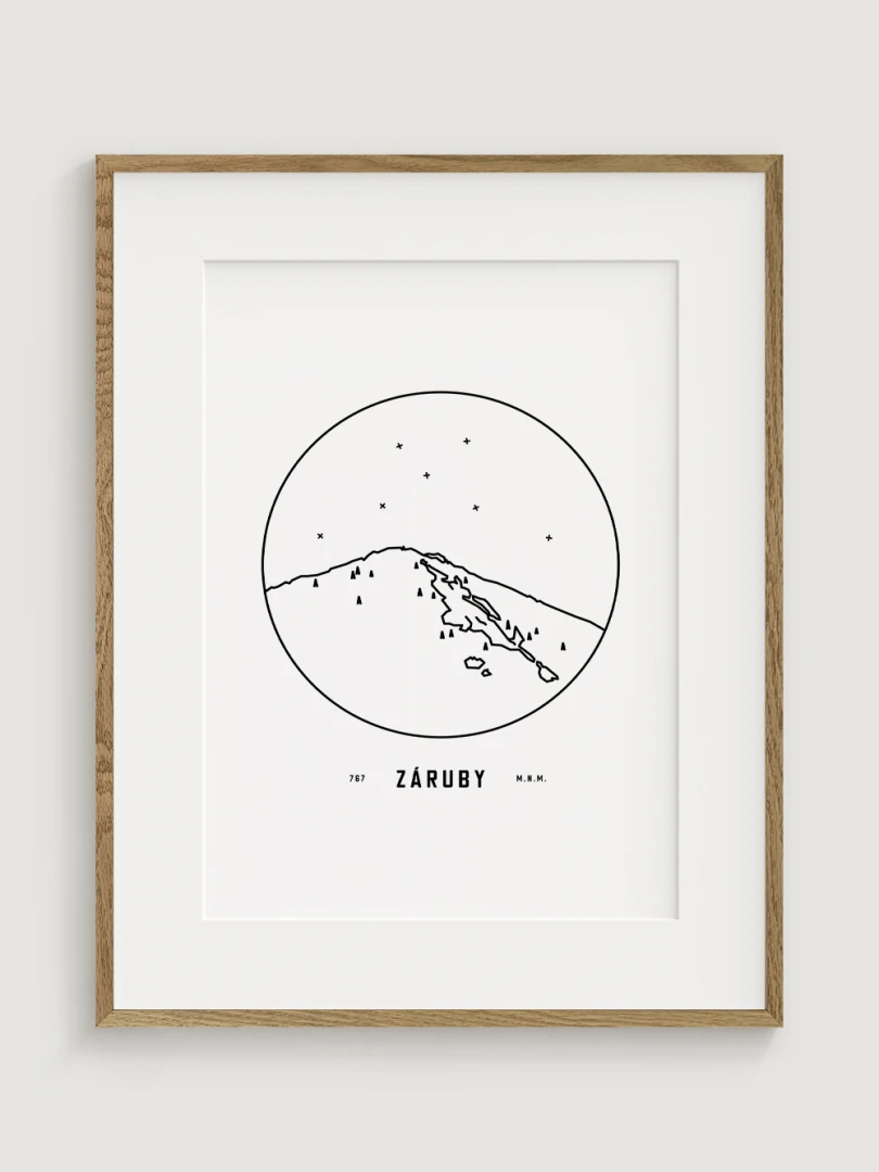 Záruby sú znázornené v detailnej kruhovej vinete s uvedením jeho názvu a nadmorskej výšky, čo vytvára jedinečný a estetický doplnok pre milovníkov prírody a hôr. Tento print je ideálnym darčekom pre tých, ktorí si chcú domov priniesť kúsok slovenskej krajiny a majestátnosť jej vrcholov.