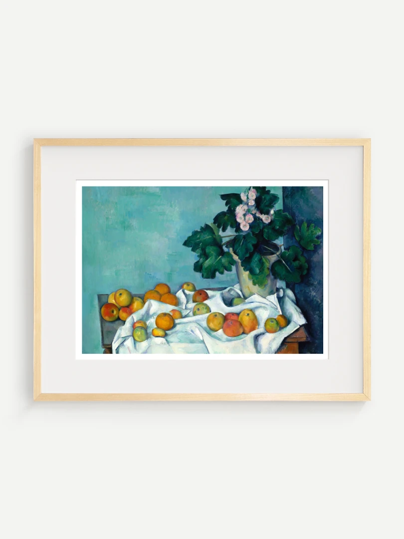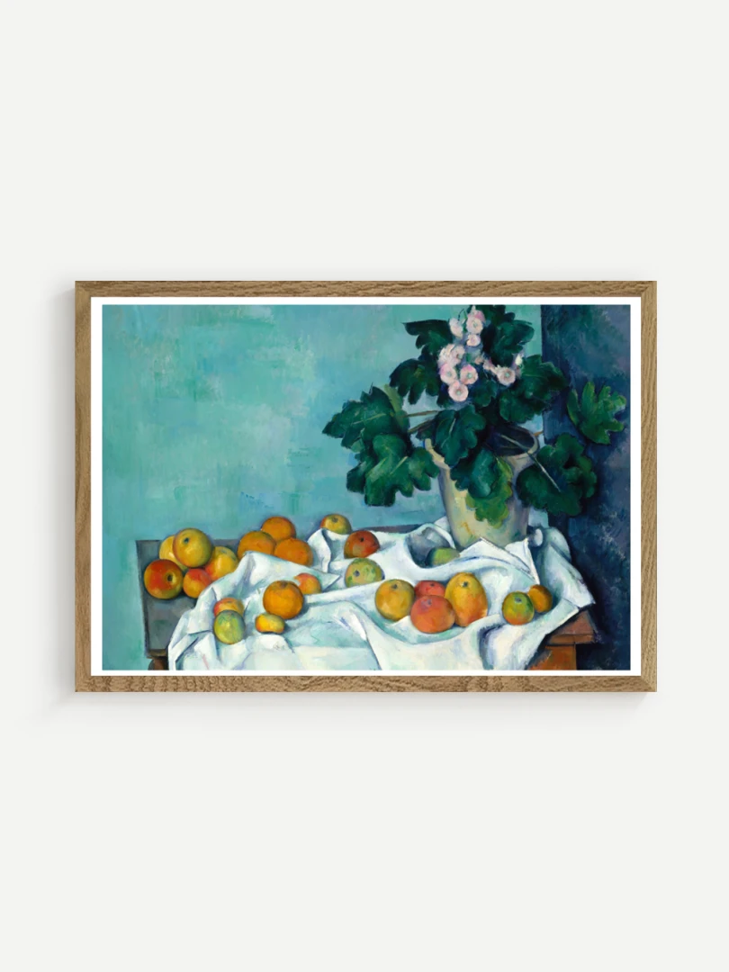Tento print vychádza z obrazu Zátišie s jablkami a prvosienkou (Still Life with Apples and a Pot of Primroses), ktorý Paul Cézanne namaľoval približne v roku 1890. Na prvý pohľad ide o klasické zátišie: stôl, ovocie, kvetináč, skladaný textil. No v Cézannovom podaní sa bežné objekty premieňajú na kompozíciu hmoty, svetla a priestoru, kde každý predmet má svoju váhu a ticho.