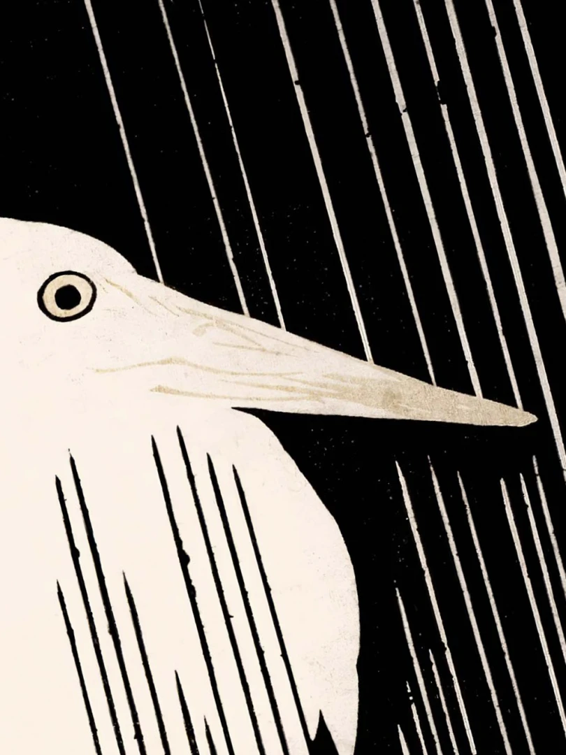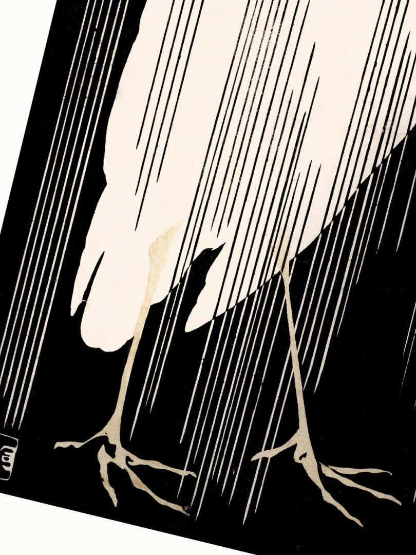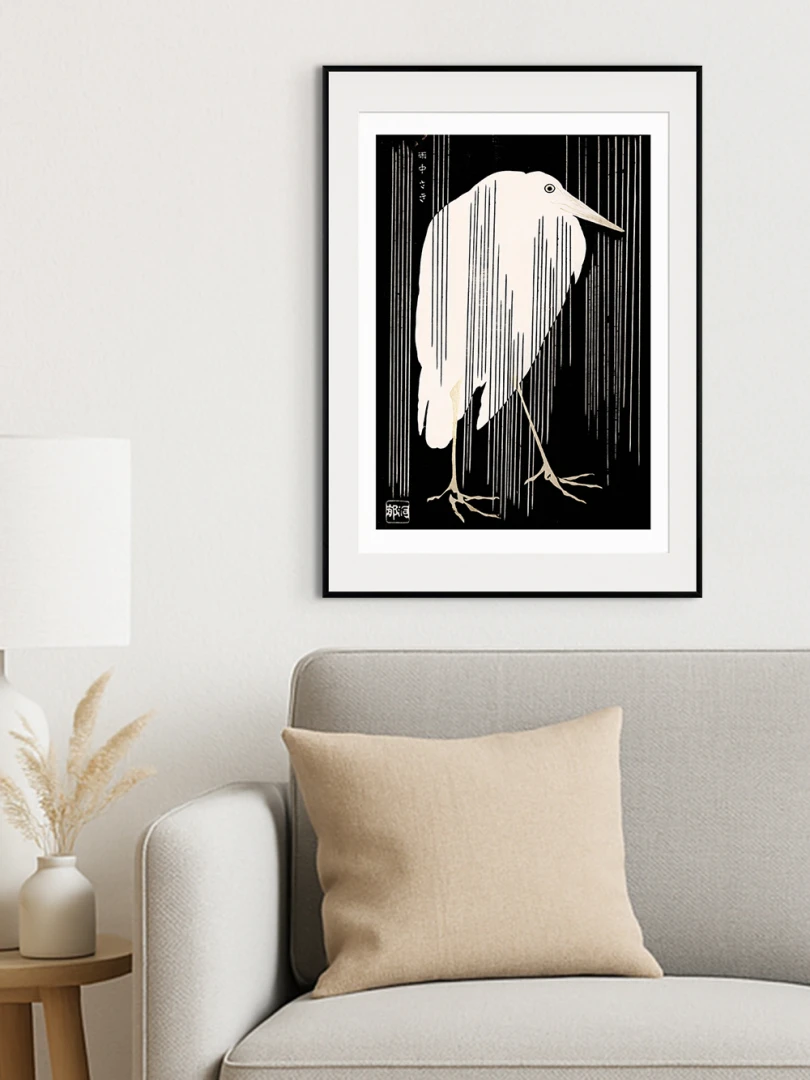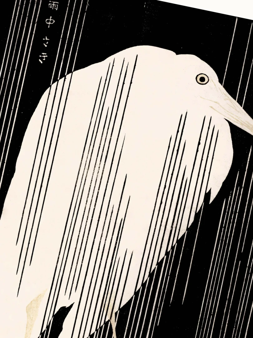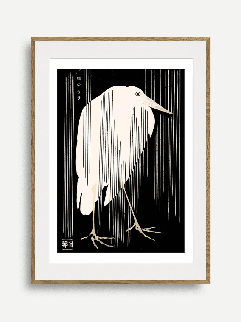 Tento print vychádza z diela Žeriav s padajúcim dažďom (Crane with Falling Rain), ktoré okolo roku 1925 vytvoril japonský majster drevorytu Yoshijirō Urushibara. Zachytáva osamelého žeriava v daždi – scénu, ktorá je výnimočne jednoduchá, no citlivo vyvážená a vizuálne silná. Jemné línie, tlmená farebnosť a pokojná kompozícia vytvárajú meditujúcu náladu, typickú pre najlepšie diela japonskej grafiky.