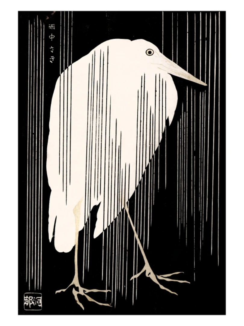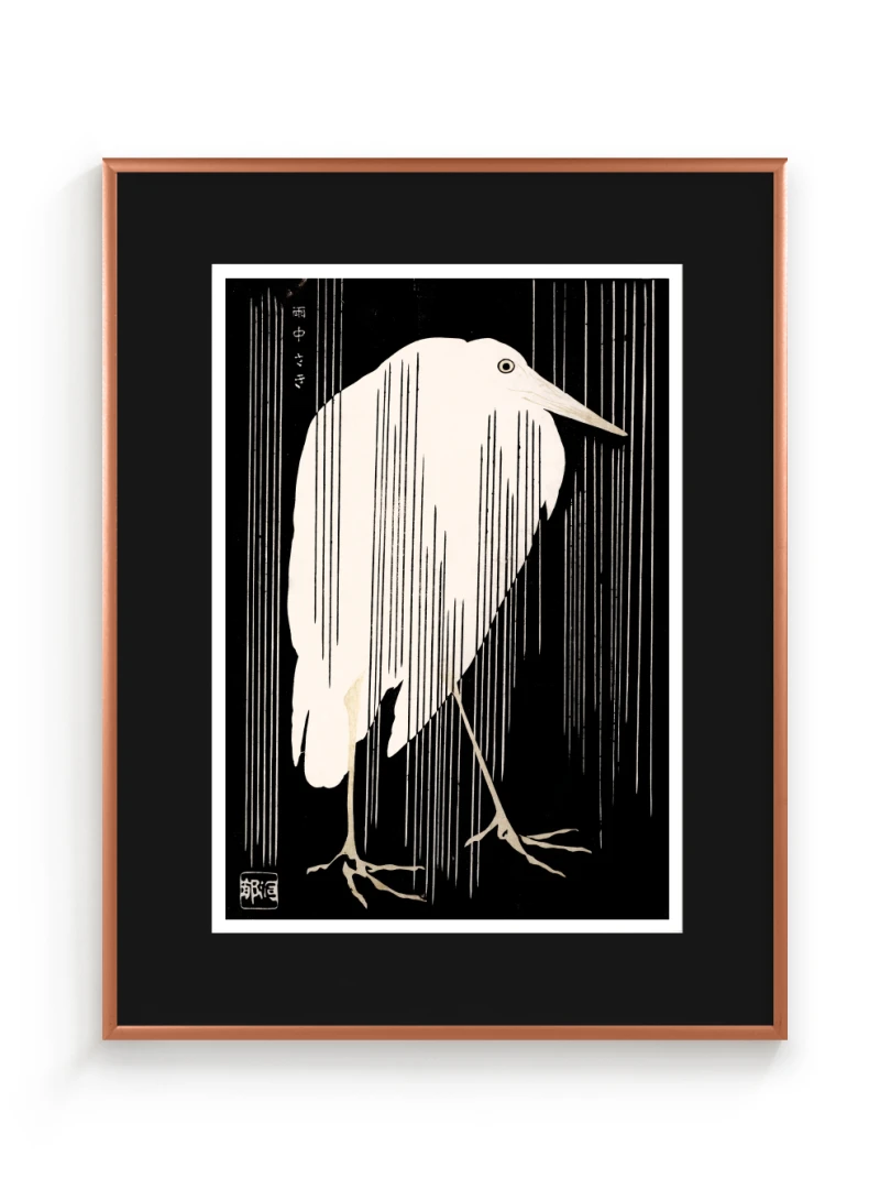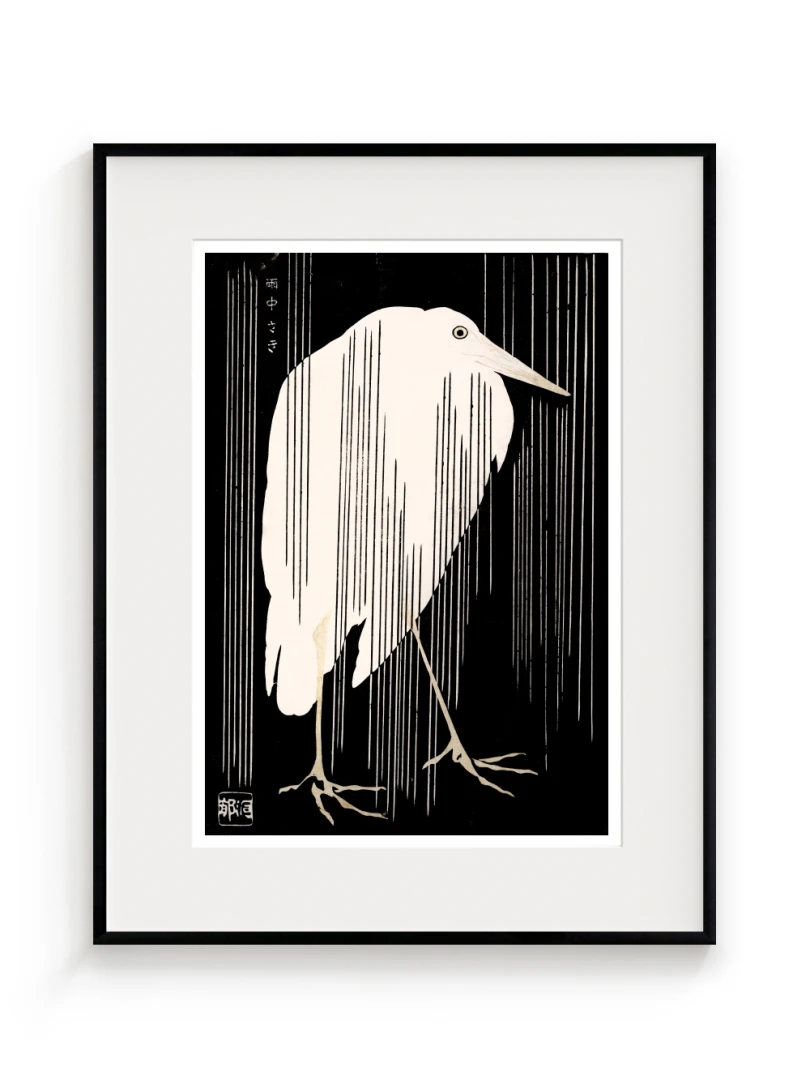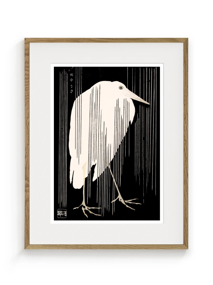 Tento print vychádza z diela Žeriav s padajúcim dažďom (Crane with Falling Rain), ktoré okolo roku 1925 vytvoril japonský majster drevorytu Yoshijirō Urushibara. Zachytáva osamelého žeriava v daždi – scénu, ktorá je výnimočne jednoduchá, no citlivo vyvážená a vizuálne silná. Jemné línie, tlmená farebnosť a pokojná kompozícia vytvárajú meditujúcu náladu, typickú pre najlepšie diela japonskej grafiky.