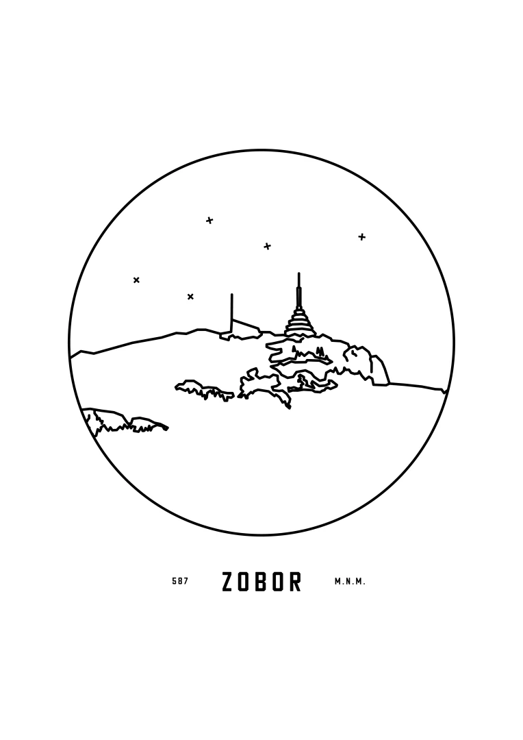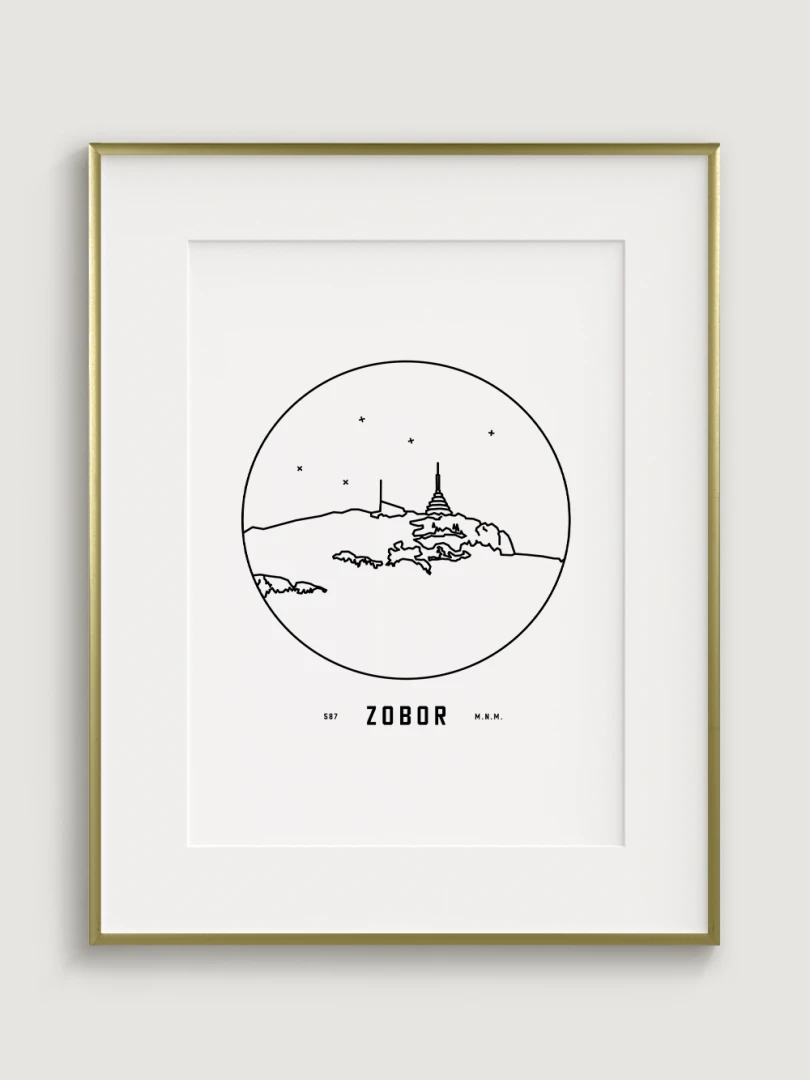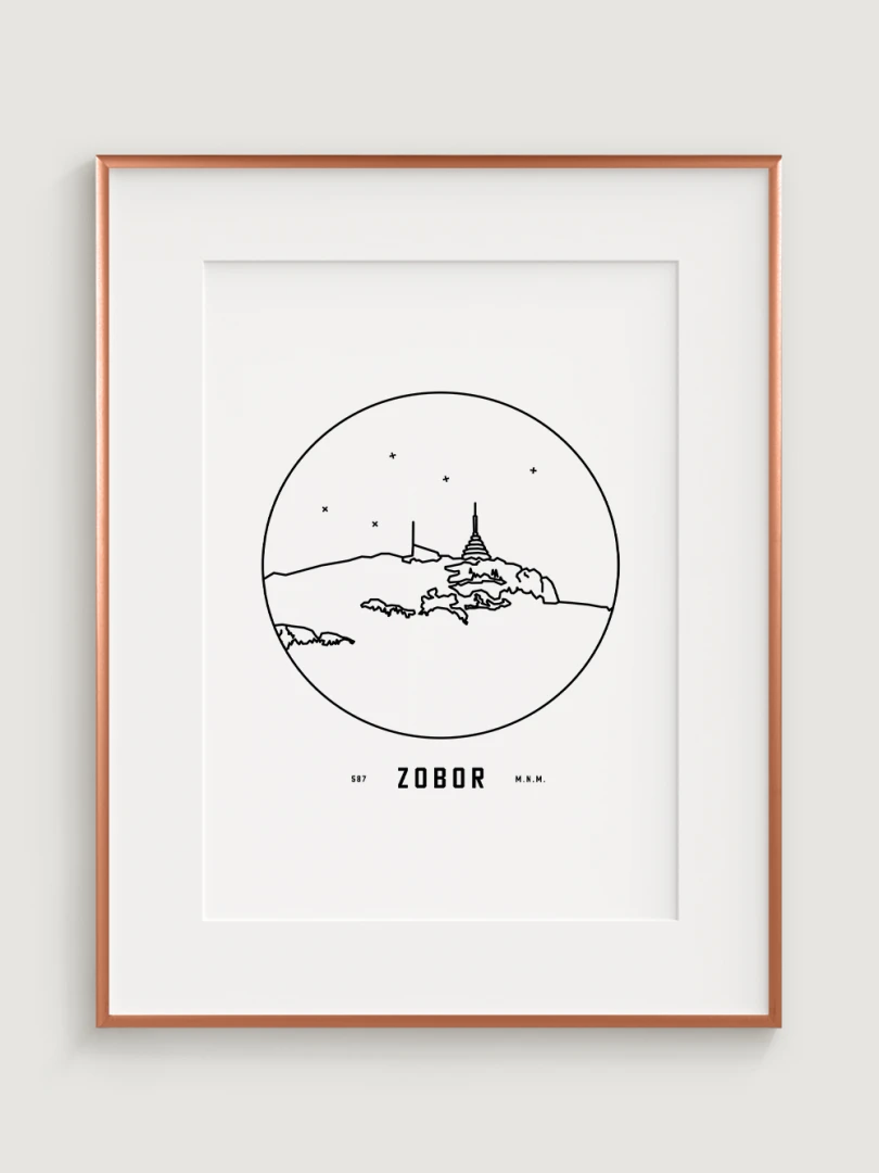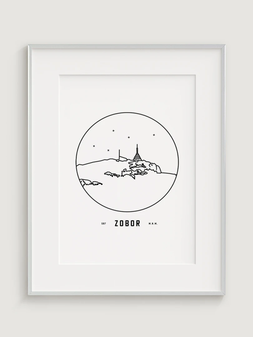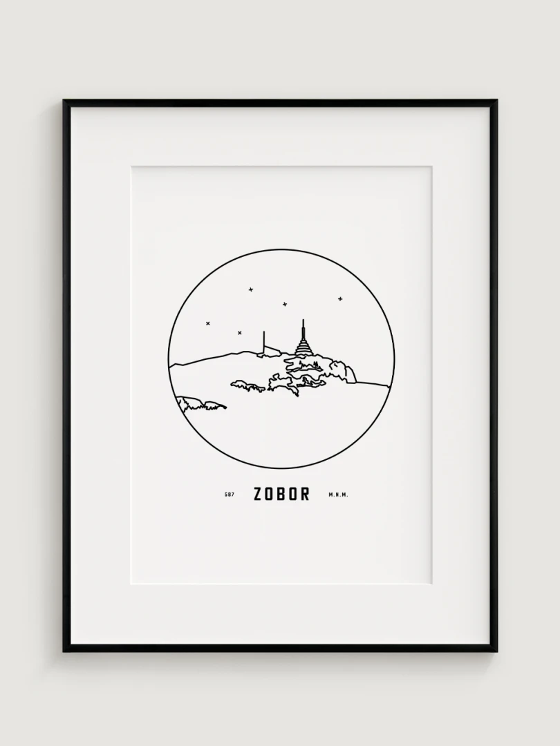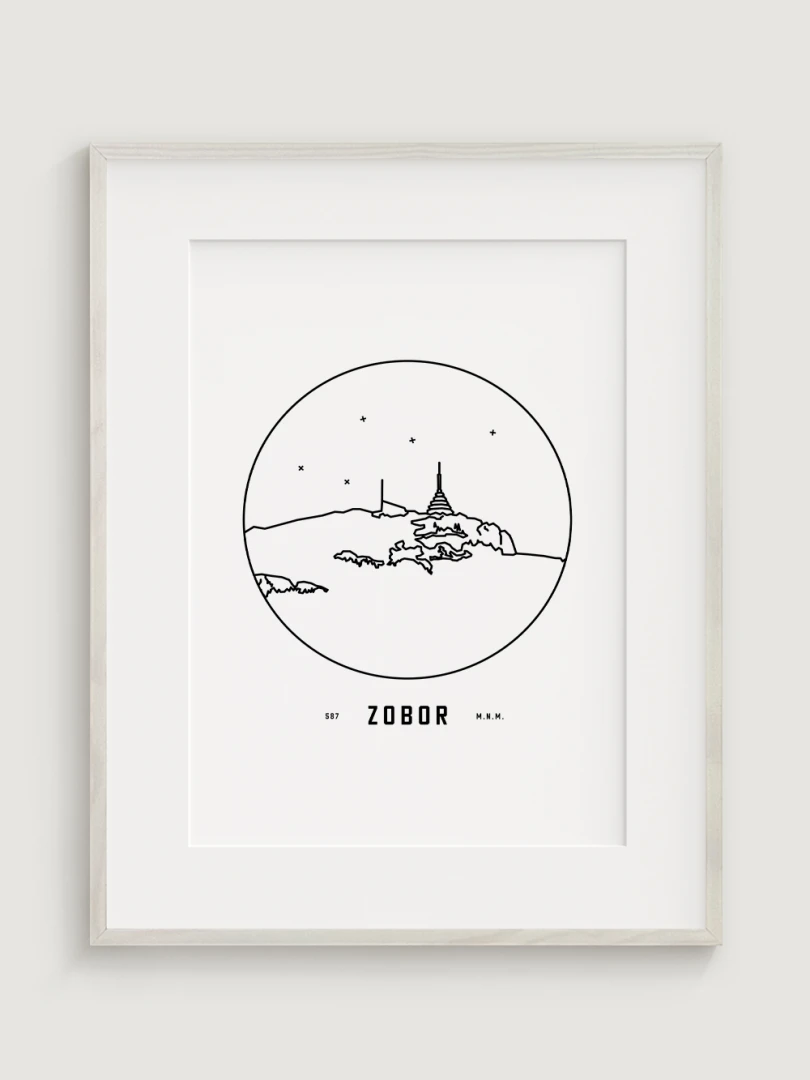 Vrch Zobor je znázornený v detailnej kruhovej vinete s uvedením jeho názvu a nadmorskej výšky, čo vytvára jedinečný a estetický doplnok pre milovníkov prírody a hôr. Tento print je ideálnym darčekom pre tých, ktorí si chcú domov priniesť kúsok slovenskej krajiny a majestátnosť jej vrcholov.