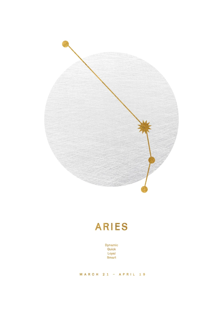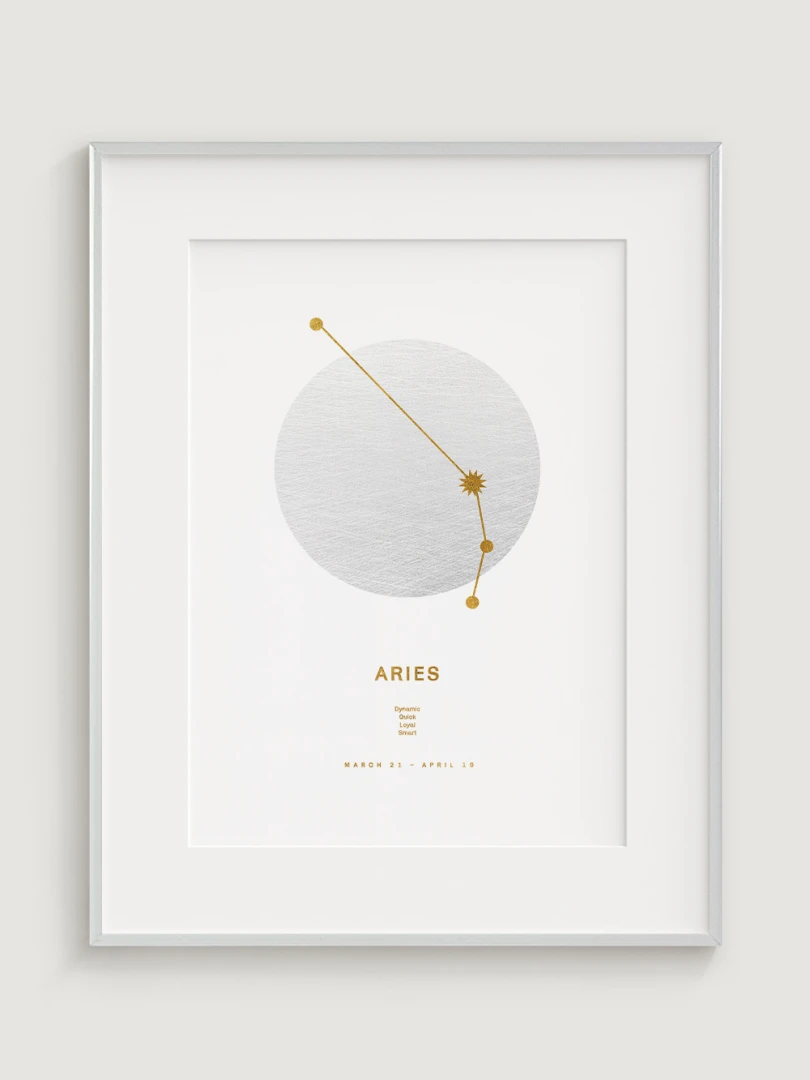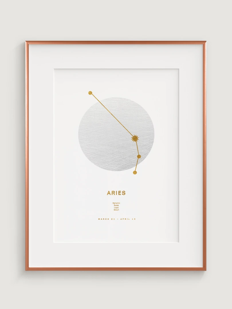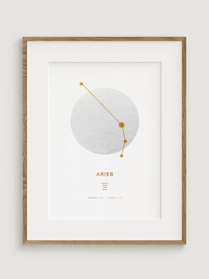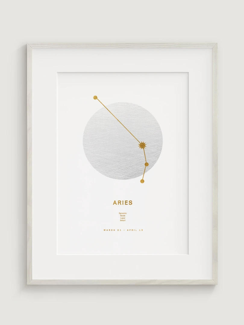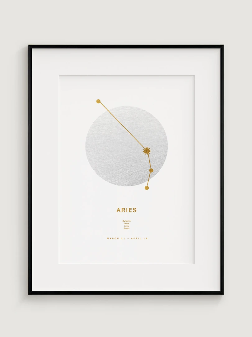 Ideálny pre tých, ktorí sa narodili pod týmto znamením, tento print obsahuje súhvezdie Barana. Umelecky spracované zlatými čiarami, ktoré formujú jeho ikonický tvar na pozadí s bielym dizajnom.