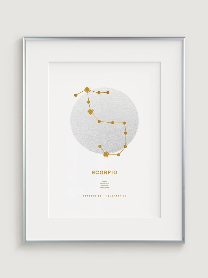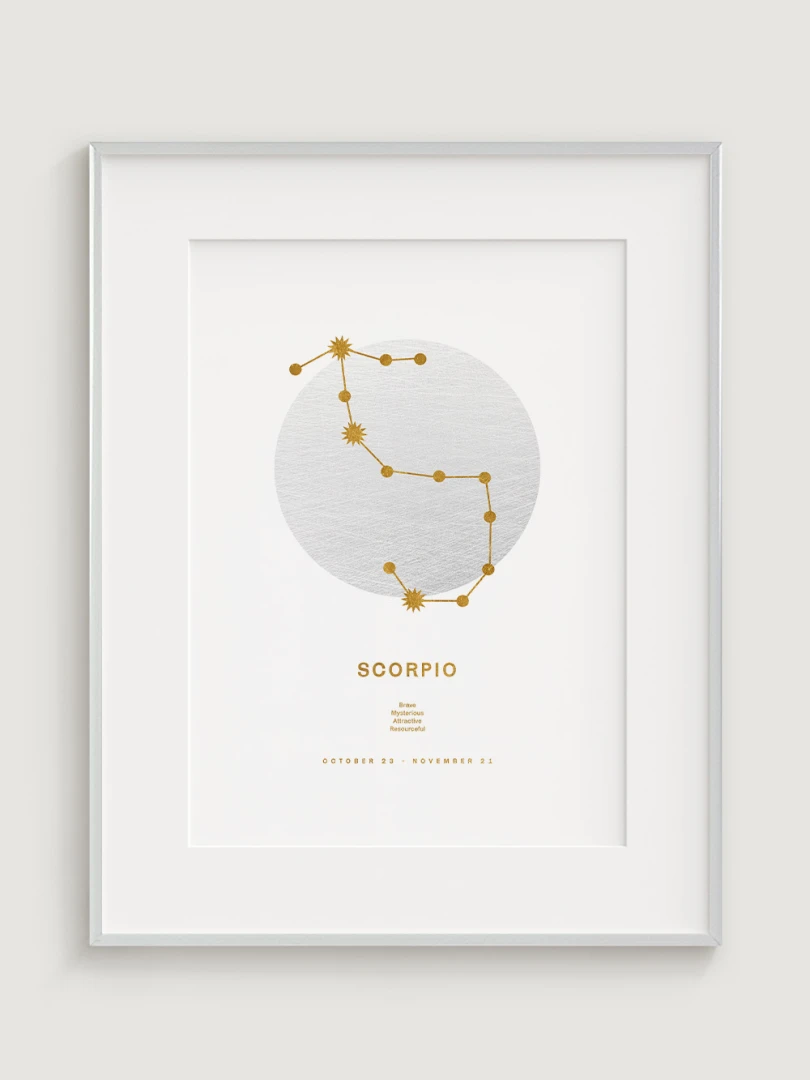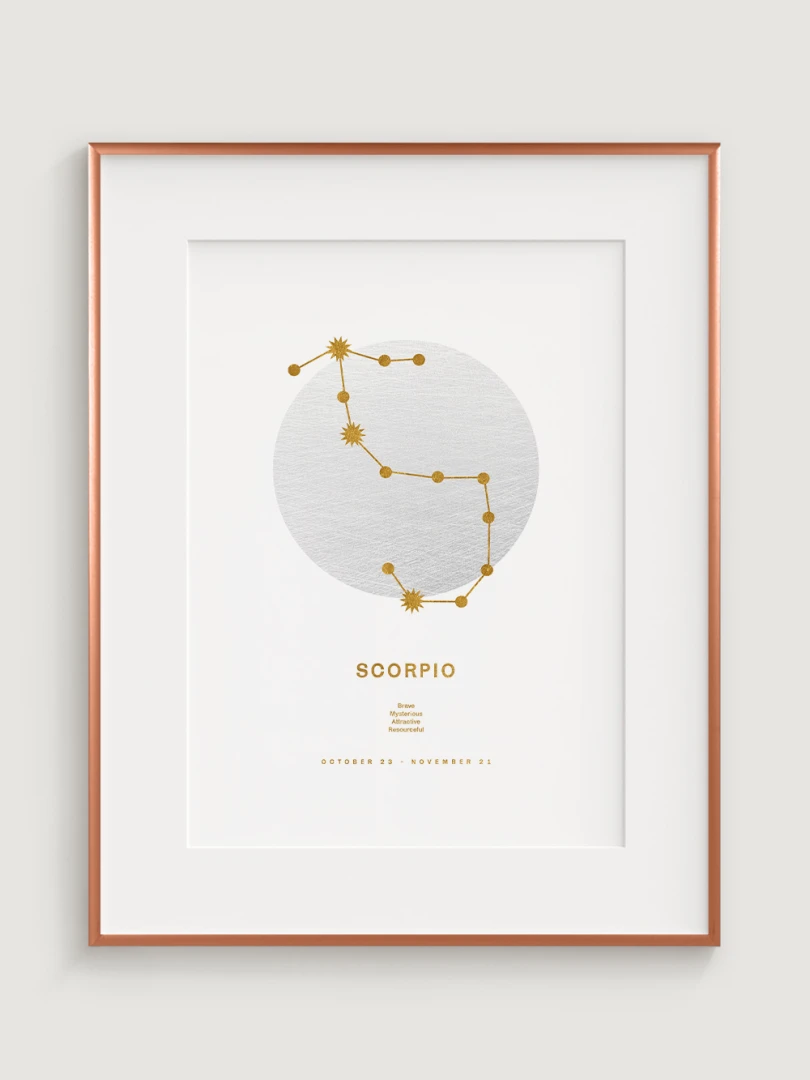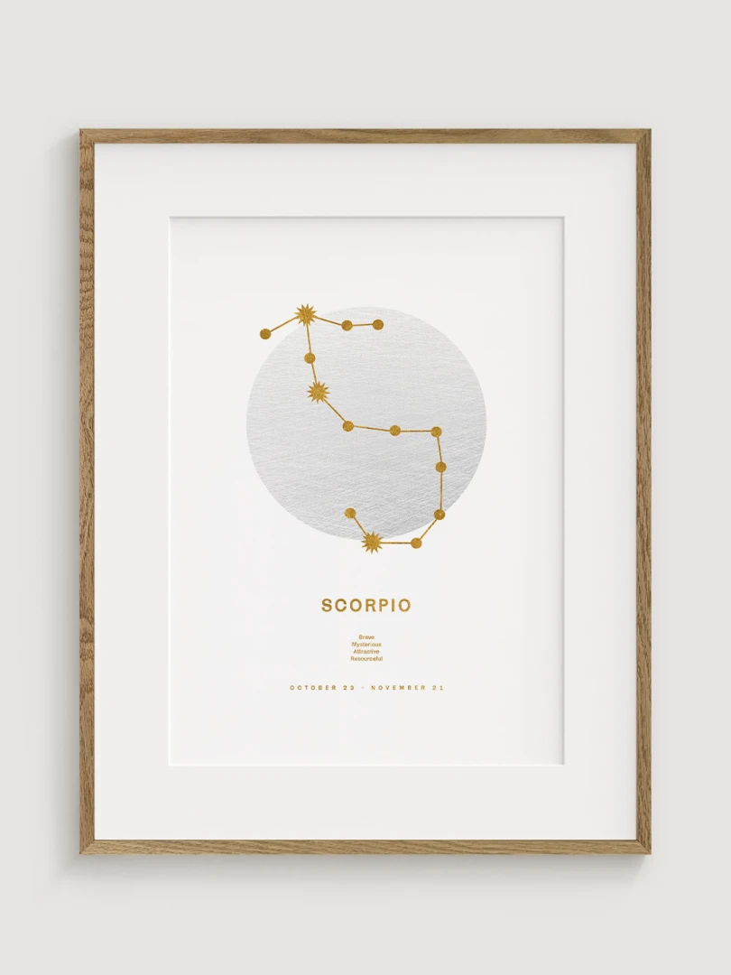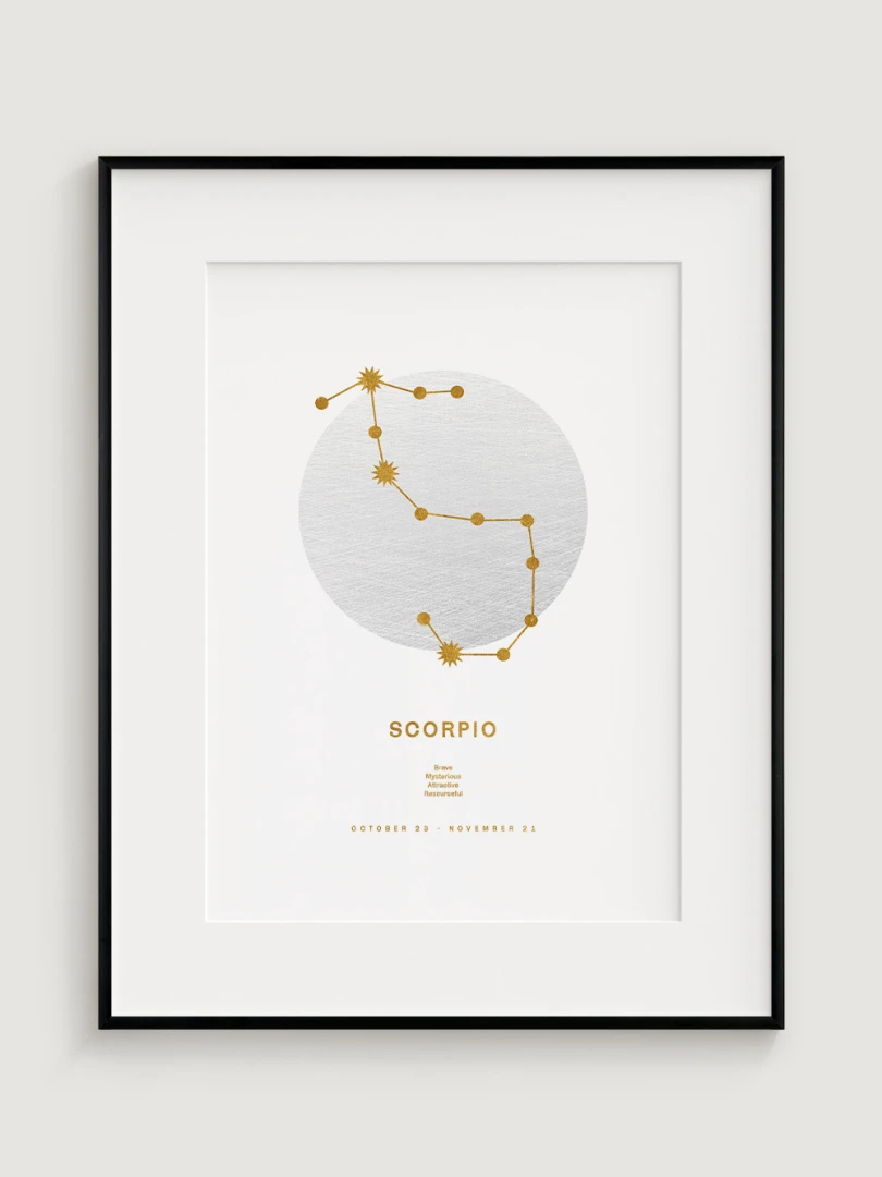 Toto znamenie zverokruhu je známe svojou intenzitou, hlbokými emóciami a schopnosťou transformácie, čo je krásne znázornené cez minimalistický dizajn, spájajúci modernú estetiku s astrologickou symbolikou. Jemná a minimalistická paleta dodá každému priestoru príjemnú atmosféru, čo robí tento print dokonalým darčekom pre ľudí narodených v znamení Škorpióna alebo štýlovým doplnkom do vášho domova.