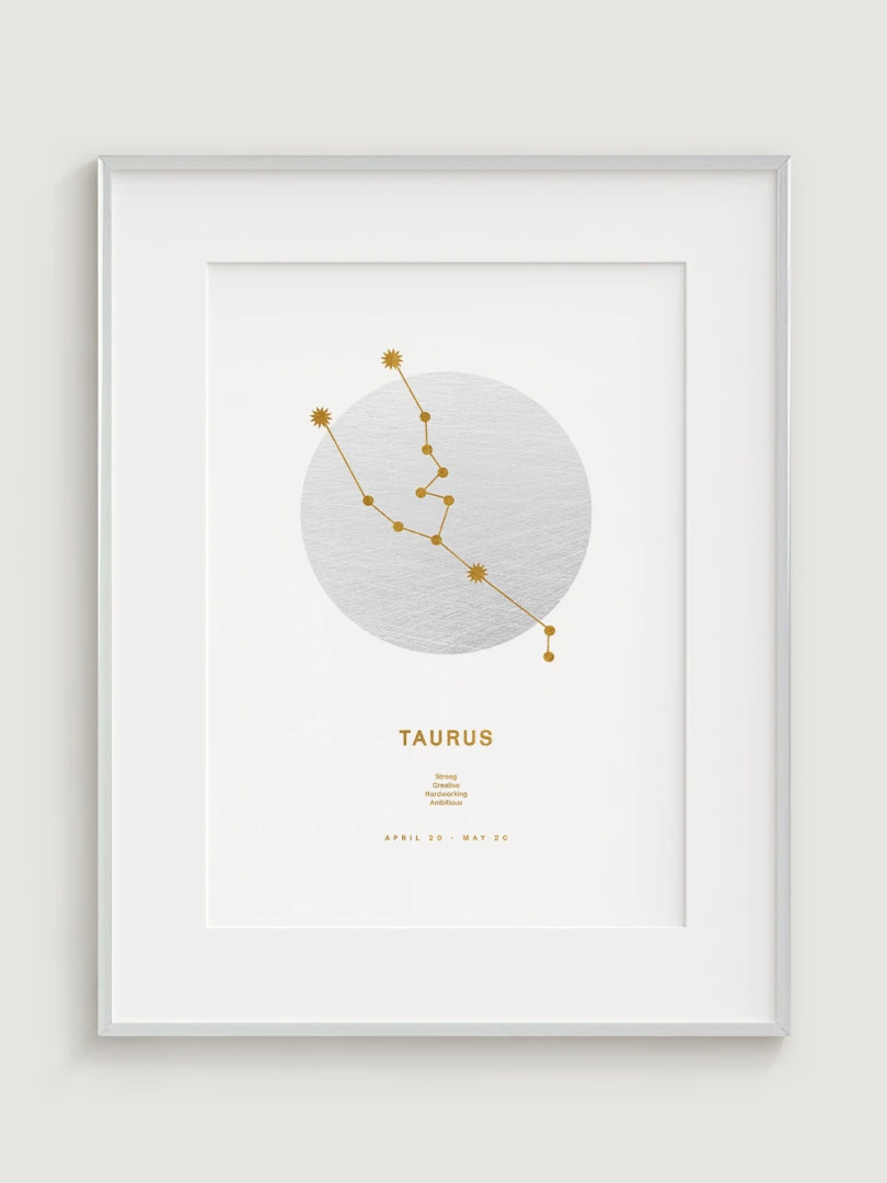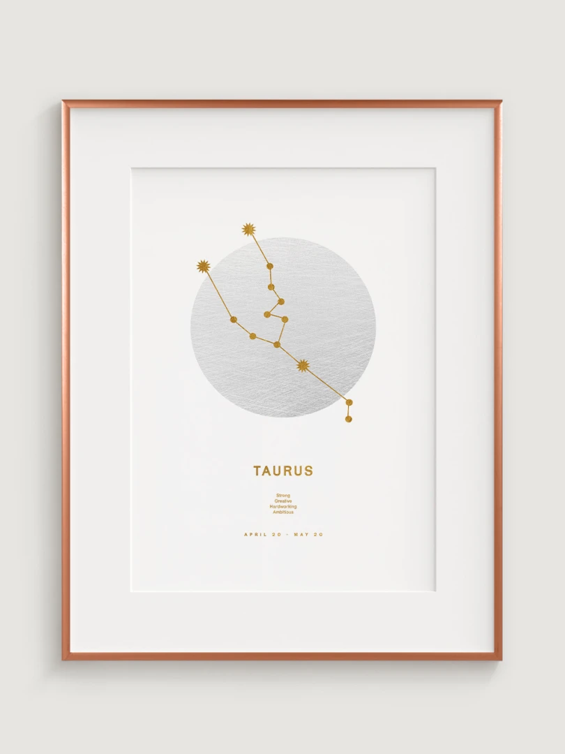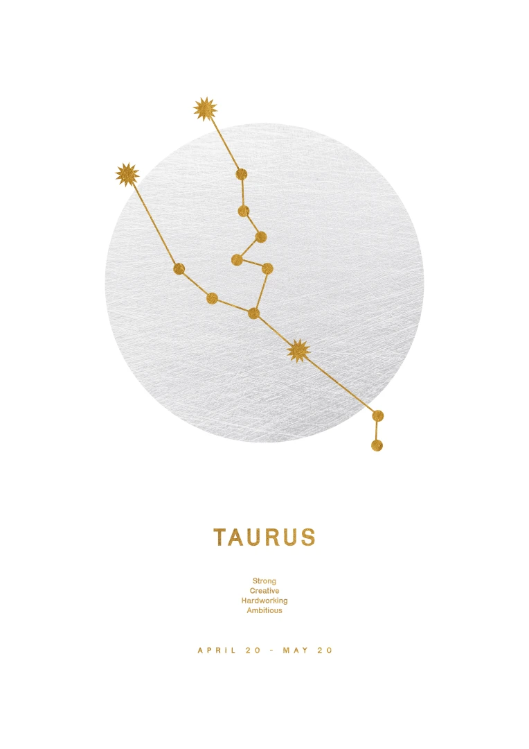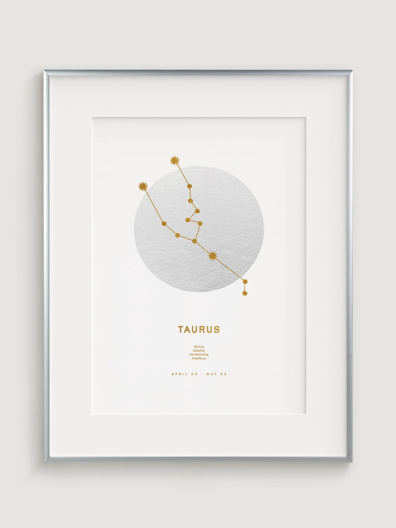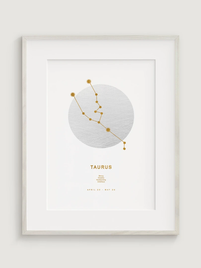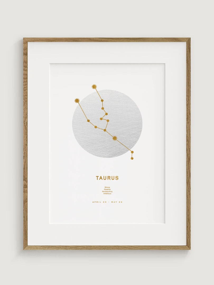Ideálny pre tých, ktorí majú záujem o astrológiu alebo si chcú osobne prispôsobiť svoj priestor s dekorom na tému znamení zverokruhu, tento print zachytáva podstatu Býka, ktorý je známy svojou silou, spoľahlivosťou a ambicióznosťou. Pod súhvezdím je uvedené slovo "Taurus" nasledované vlastnosťami charakteristickými pre toto znamenie: "Silný, Vytrvalý, Ambiciózny," spolu s dátumovým rozsahom od 20. apríla do 20. mája, čo ho robí premysleným darčekom alebo osobnou pamiatkou.