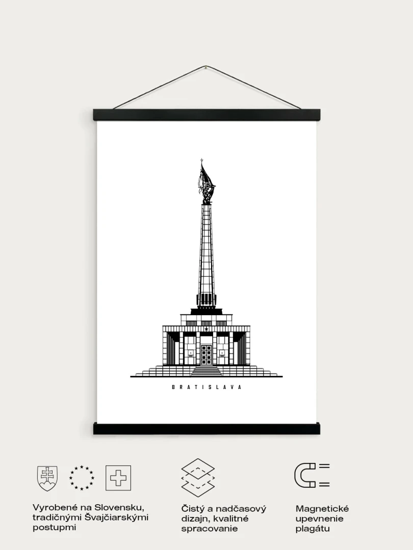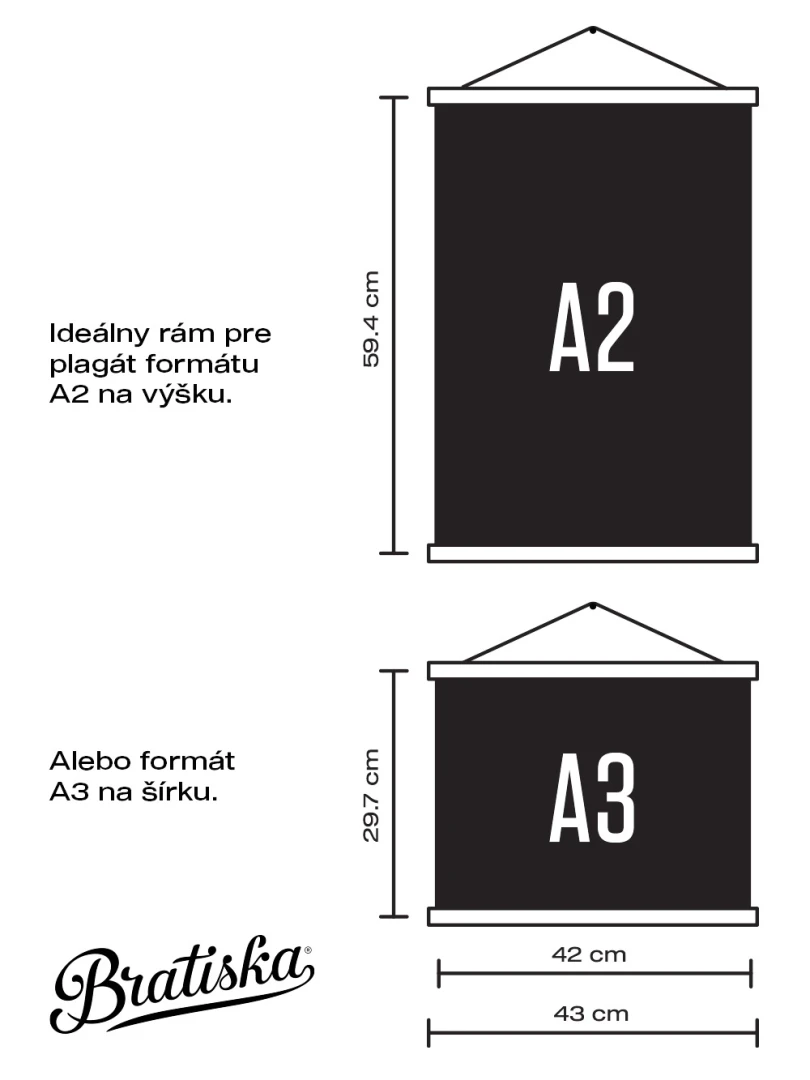 Rozmer 43cm je vhodný na zavesenie formátu A3 na šírku, alebo A2 na výšku. Rám je vyrobený na Slovensku.