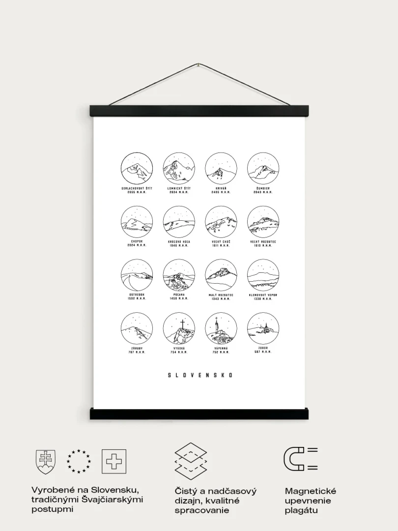 Prinášame vám elegantné jednoduché riešenie na vešanie printov alebo plagátov. Rám je zložený z matných drevených líšt, ktoré držia pri sebe a zároveň aj plagát/print vďaka malým magnetom v každej lište. Na zavesenie slúži šnúrka upevnená na hornej zadnej lište.